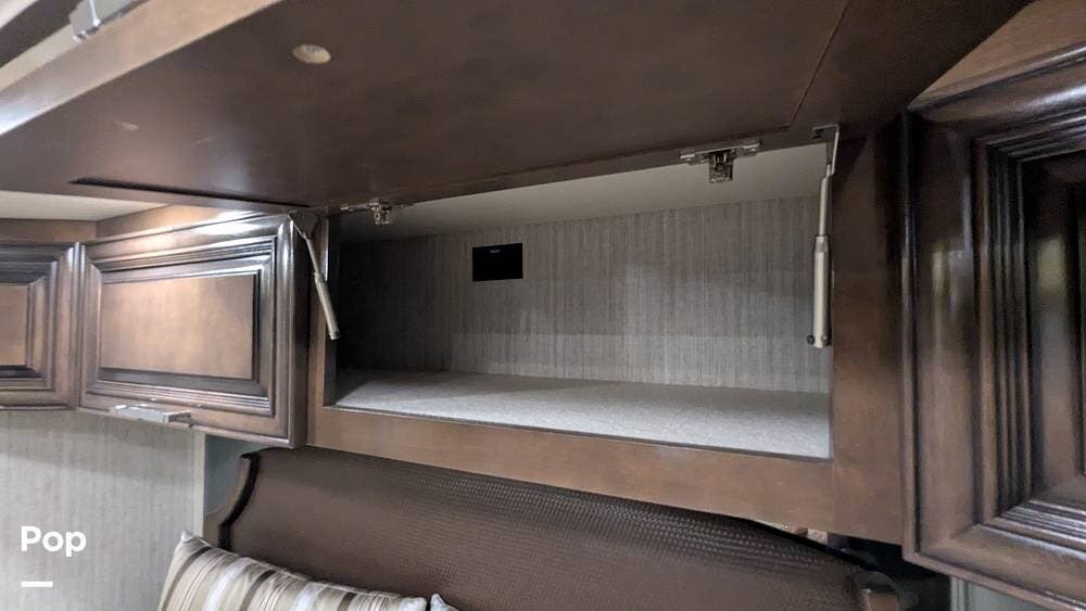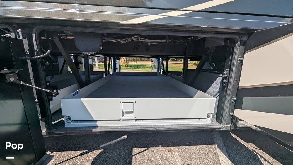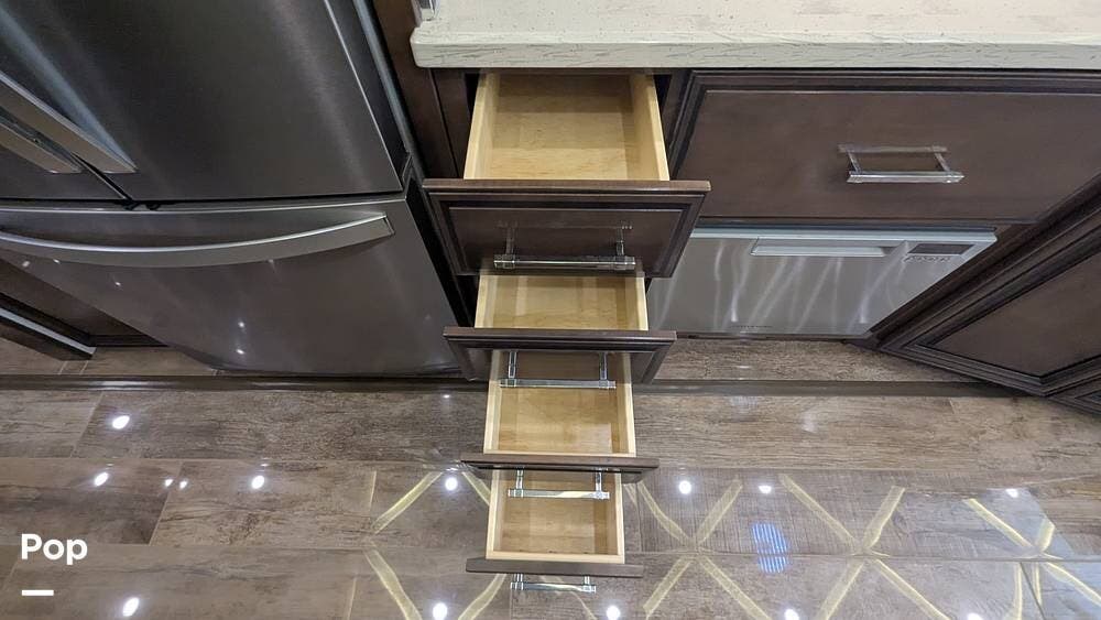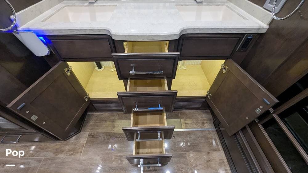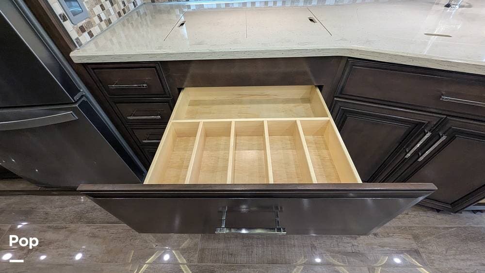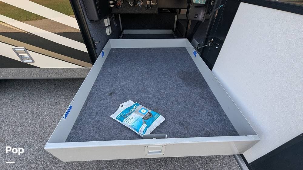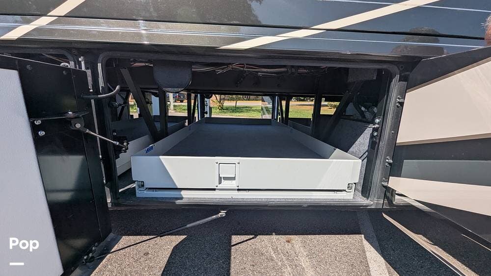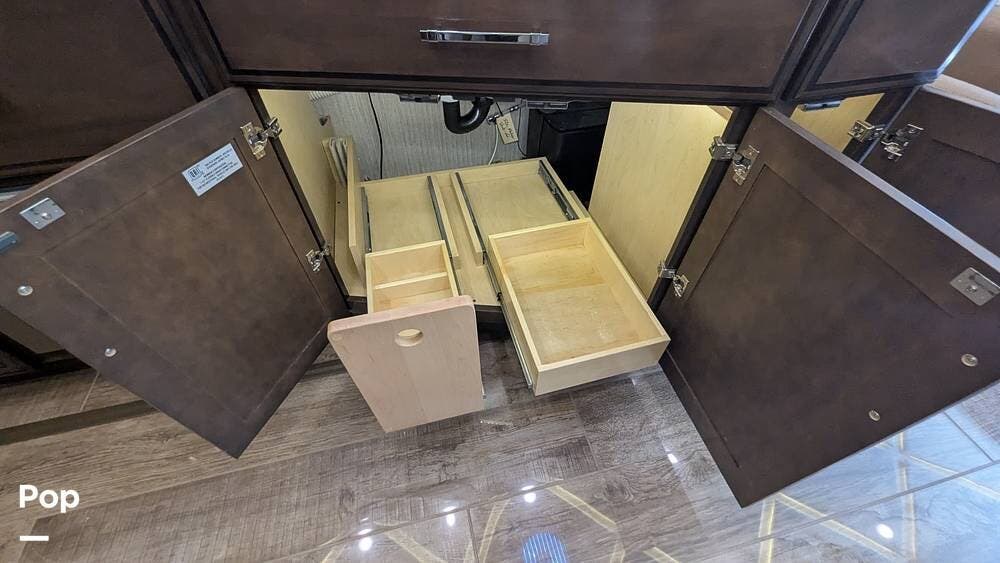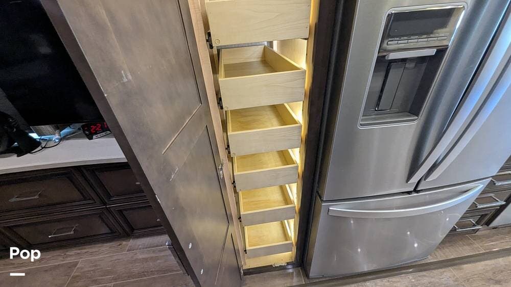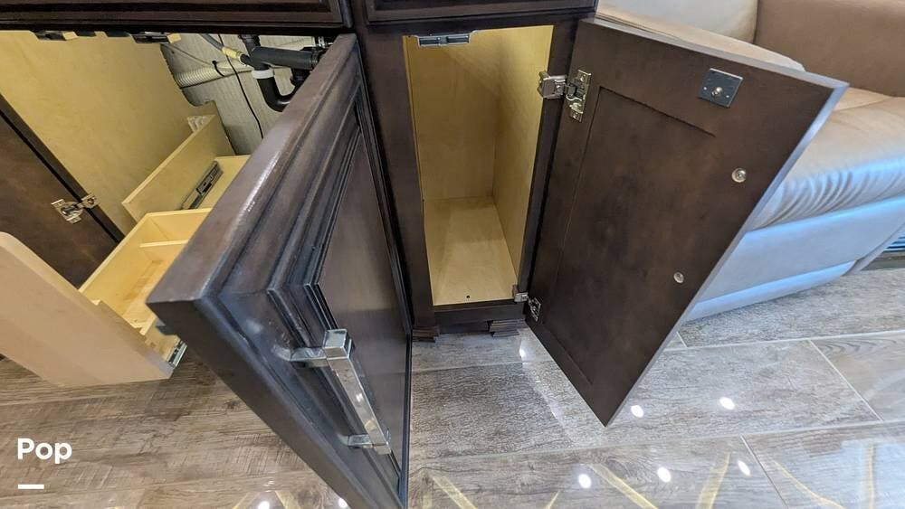 All of the convenience features are in place, along with a powered electrical cord reel and slide-out storage trays in the basement. The TV in the living room also retracts into the gorgeous wood cabinetry when not in use. There are also multiple TV's and access to entertainment systems, including an outside TV for tailgating.