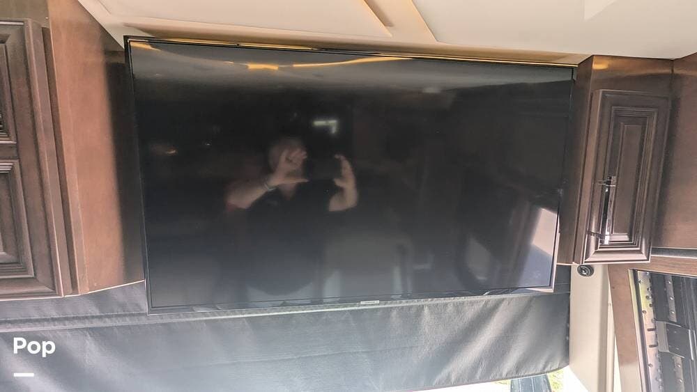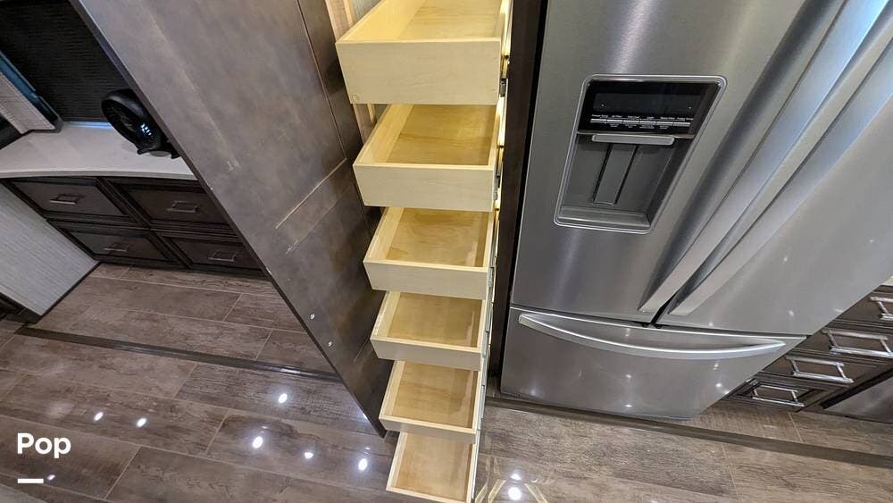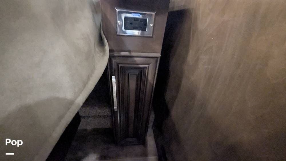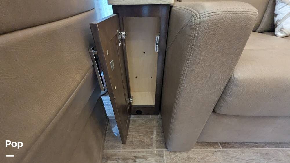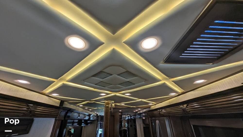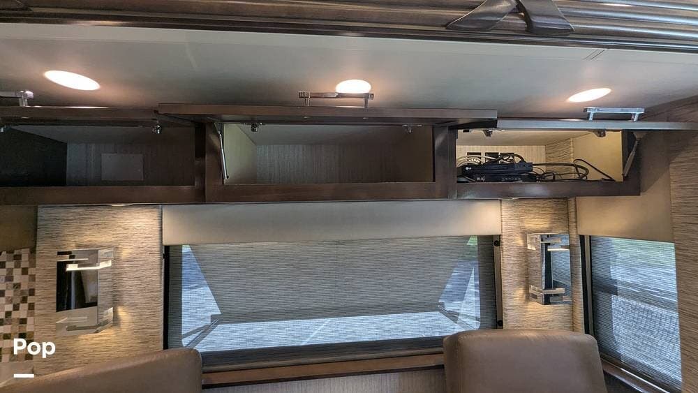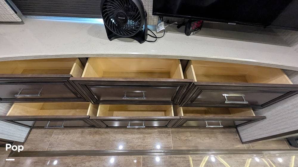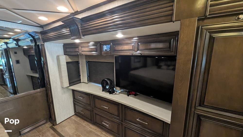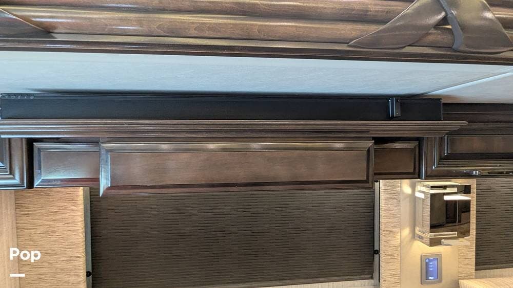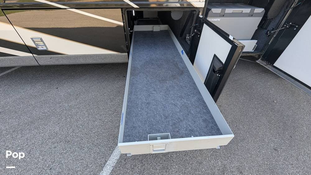 All of the convenience features are in place, along with a powered electrical cord reel and slide-out storage trays in the basement. The TV in the living room also retracts into the gorgeous wood cabinetry when not in use. There are also multiple TV's and access to entertainment systems, including an outside TV for tailgating.