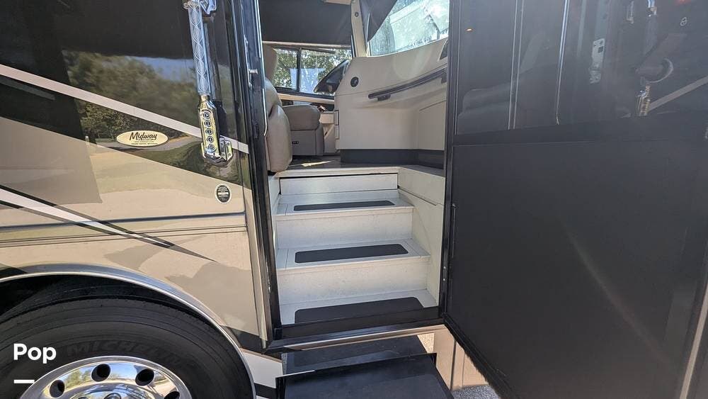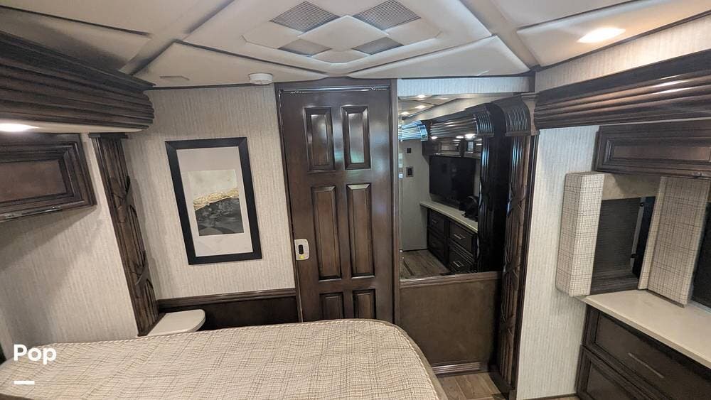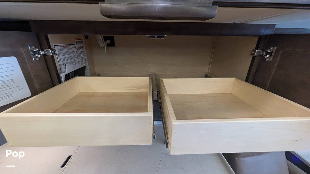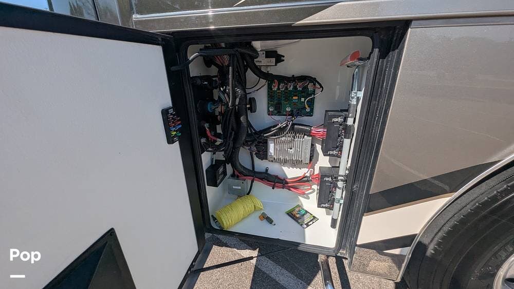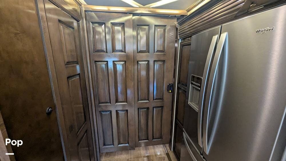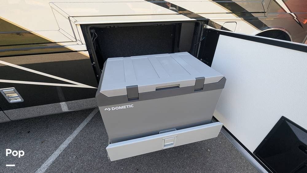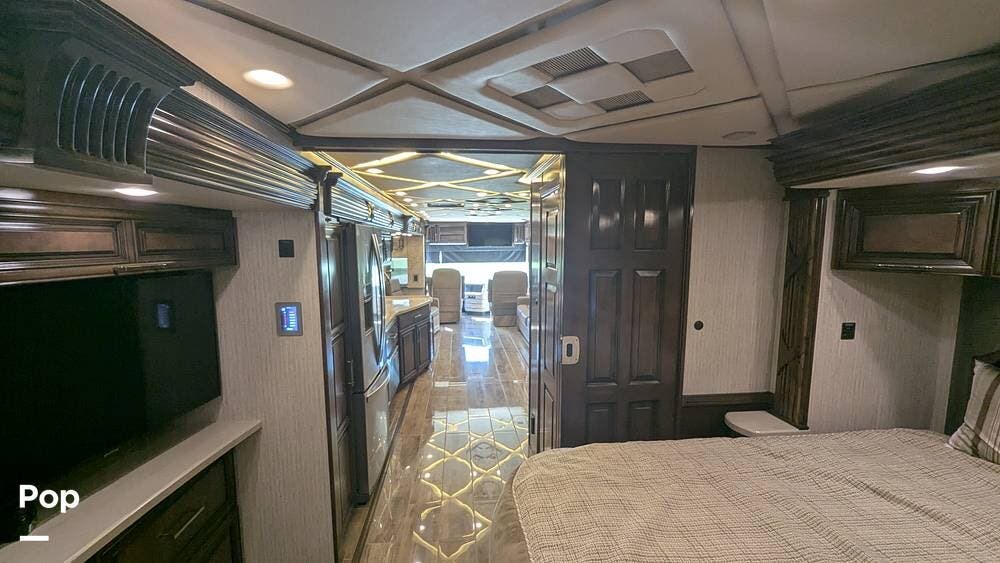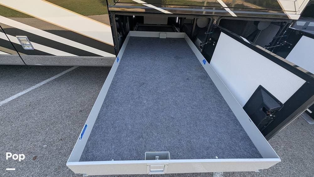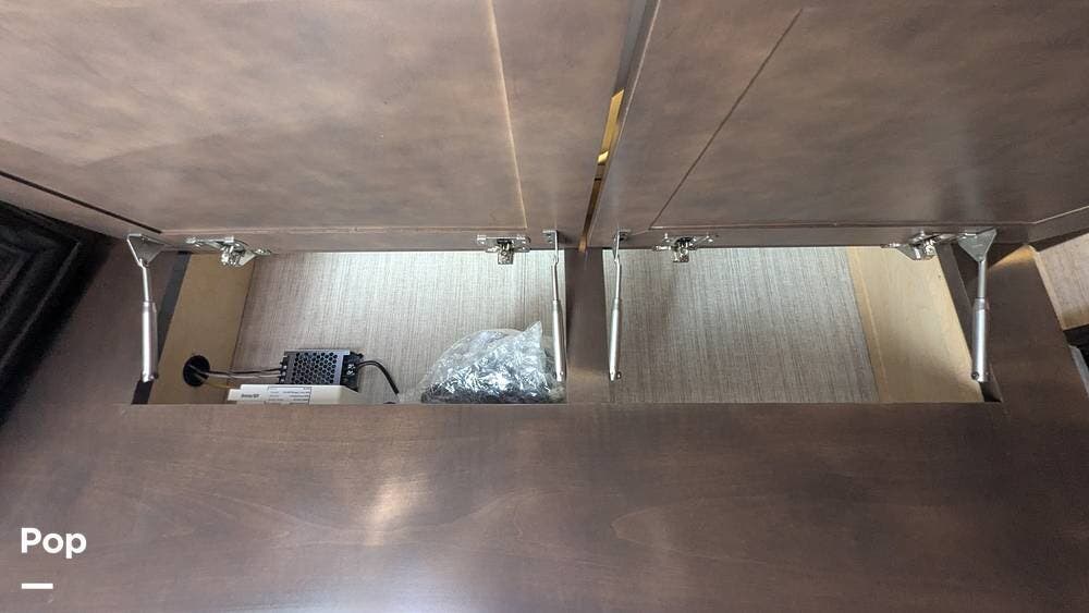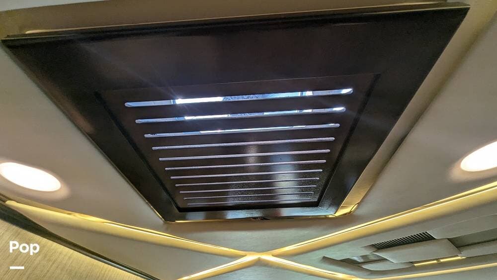 All of the convenience features are in place, along with a powered electrical cord reel and slide-out storage trays in the basement. The TV in the living room also retracts into the gorgeous wood cabinetry when not in use. There are also multiple TV's and access to entertainment systems, including an outside TV for tailgating.