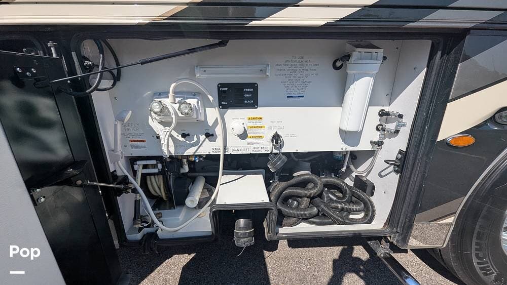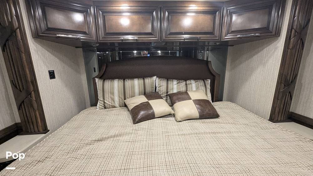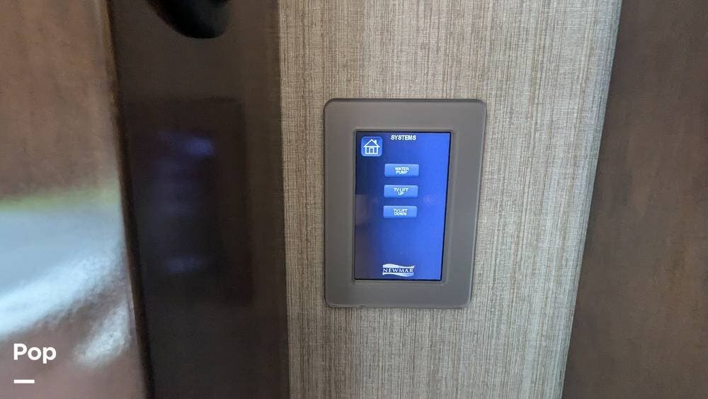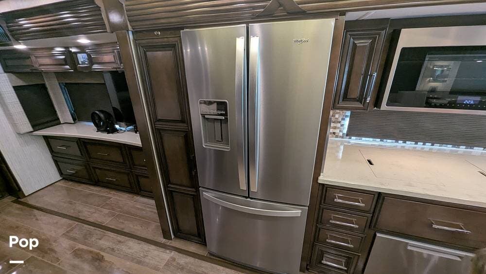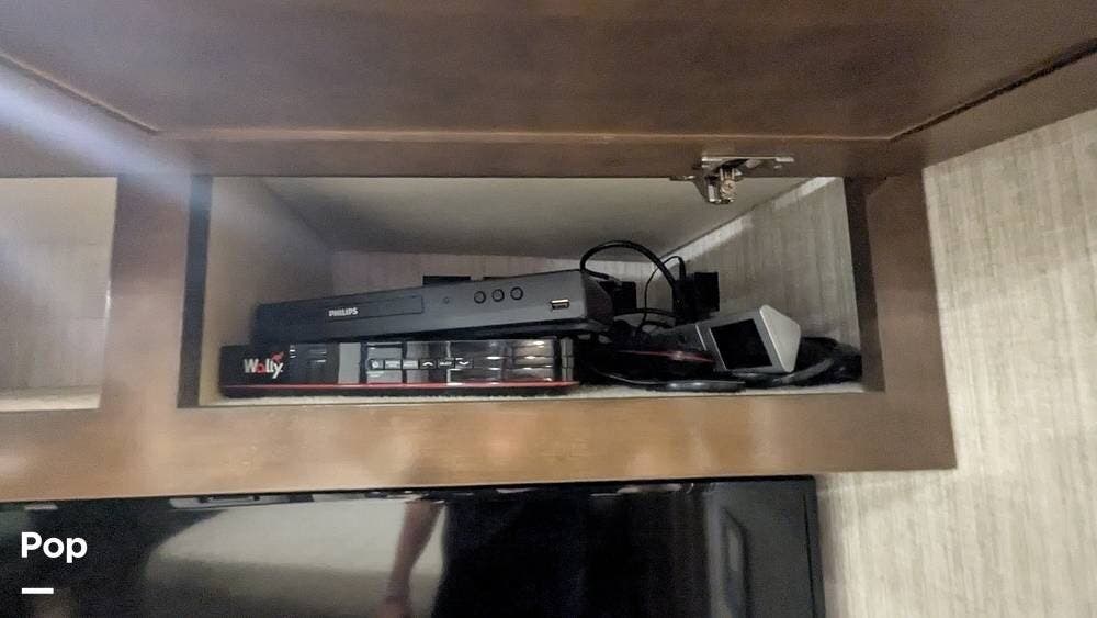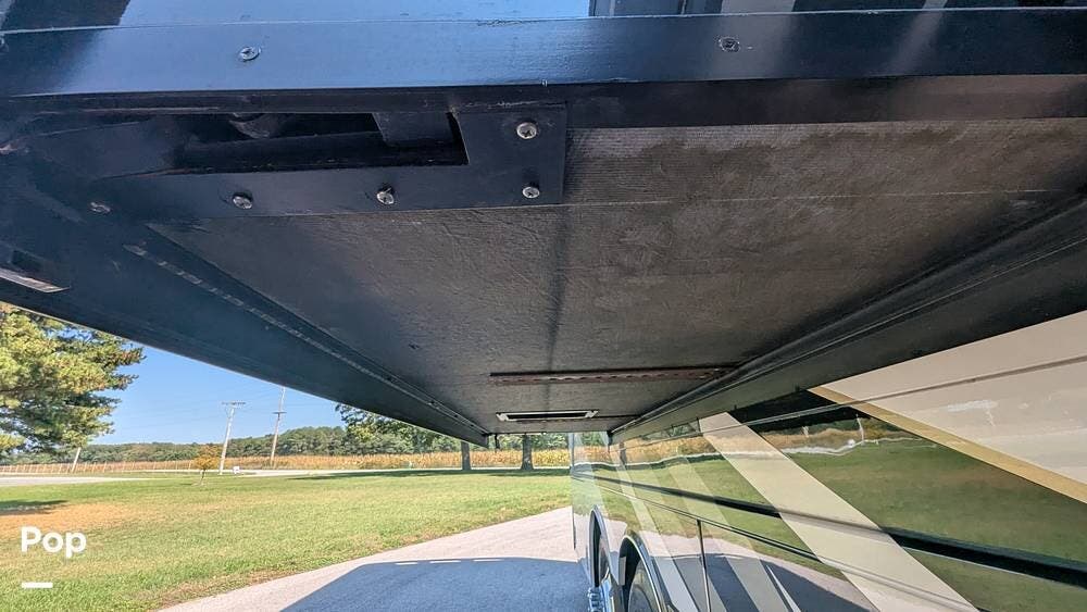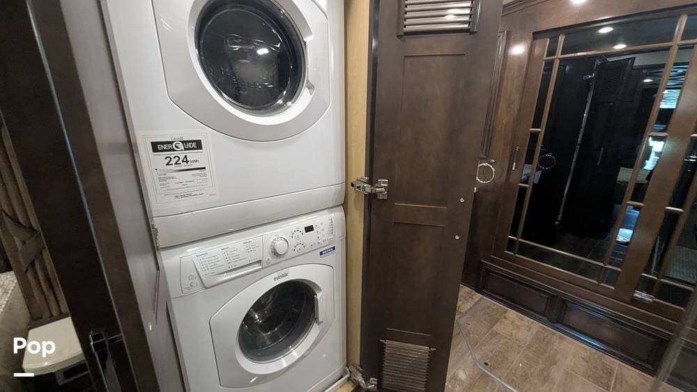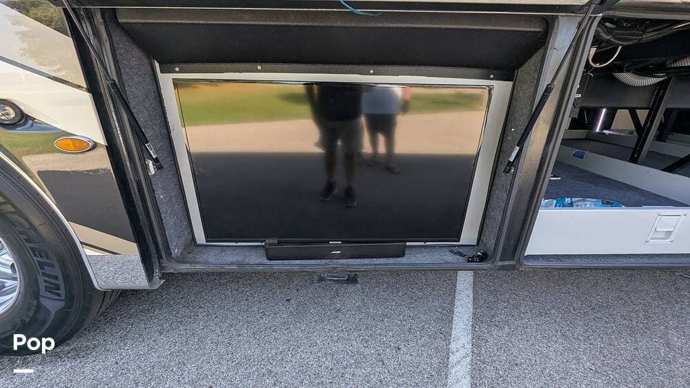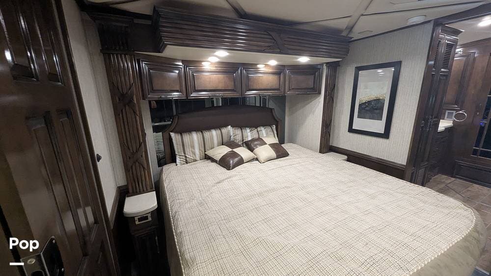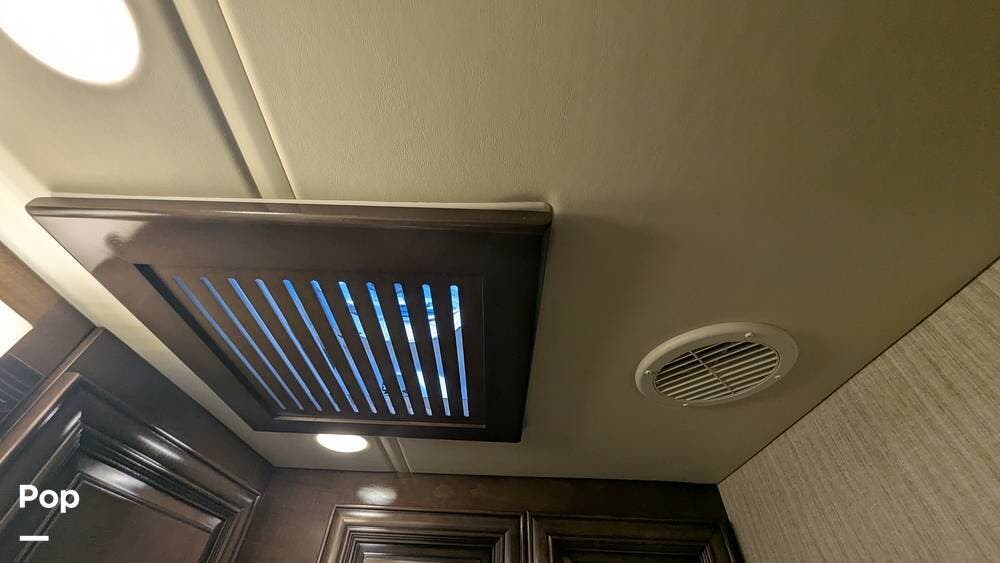 All of the convenience features are in place, along with a powered electrical cord reel and slide-out storage trays in the basement. The TV in the living room also retracts into the gorgeous wood cabinetry when not in use. There are also multiple TV's and access to entertainment systems, including an outside TV for tailgating.