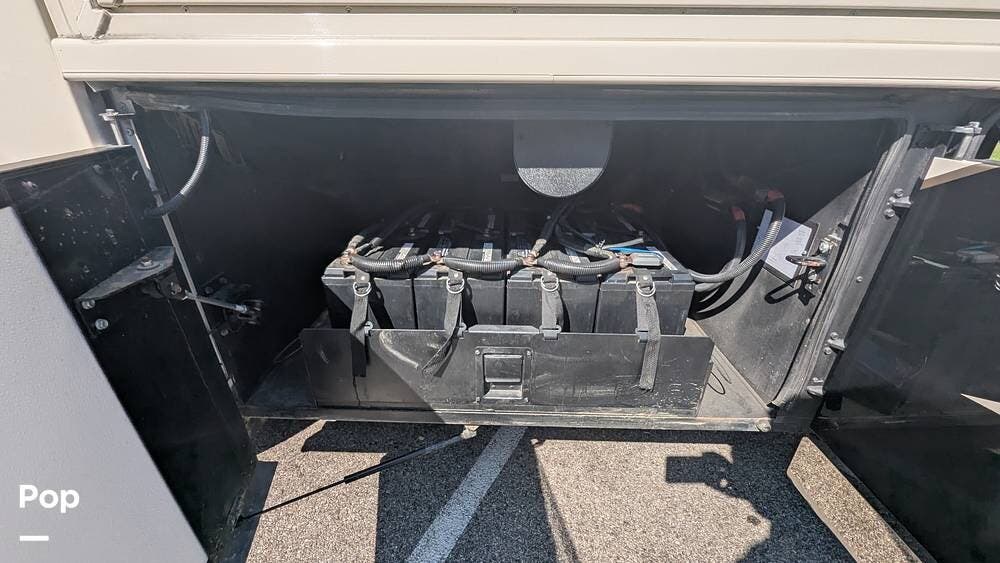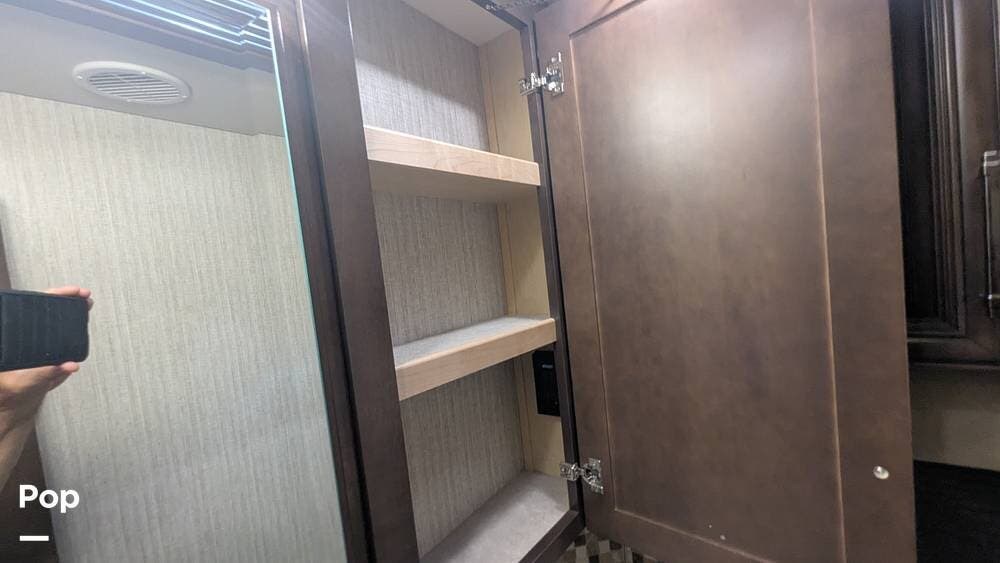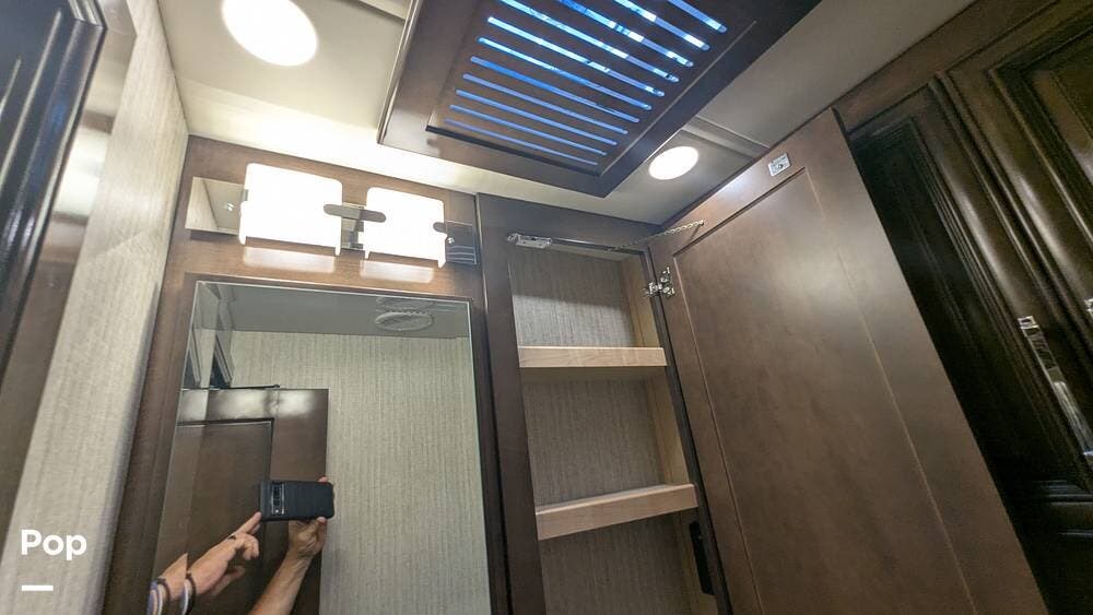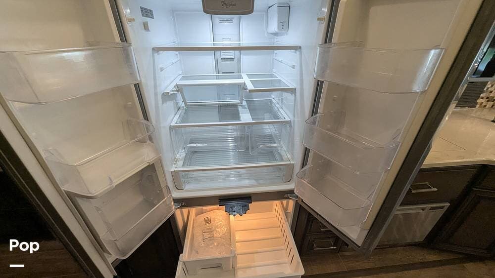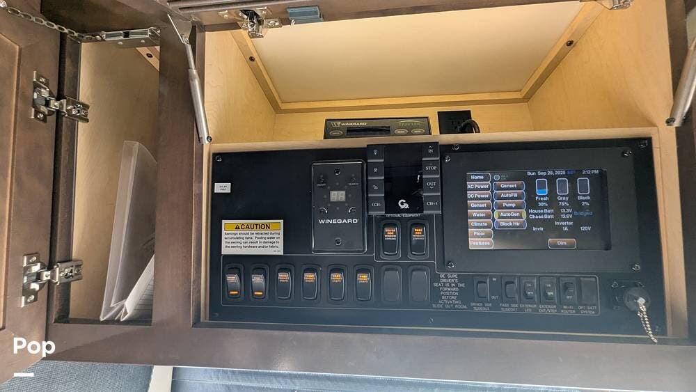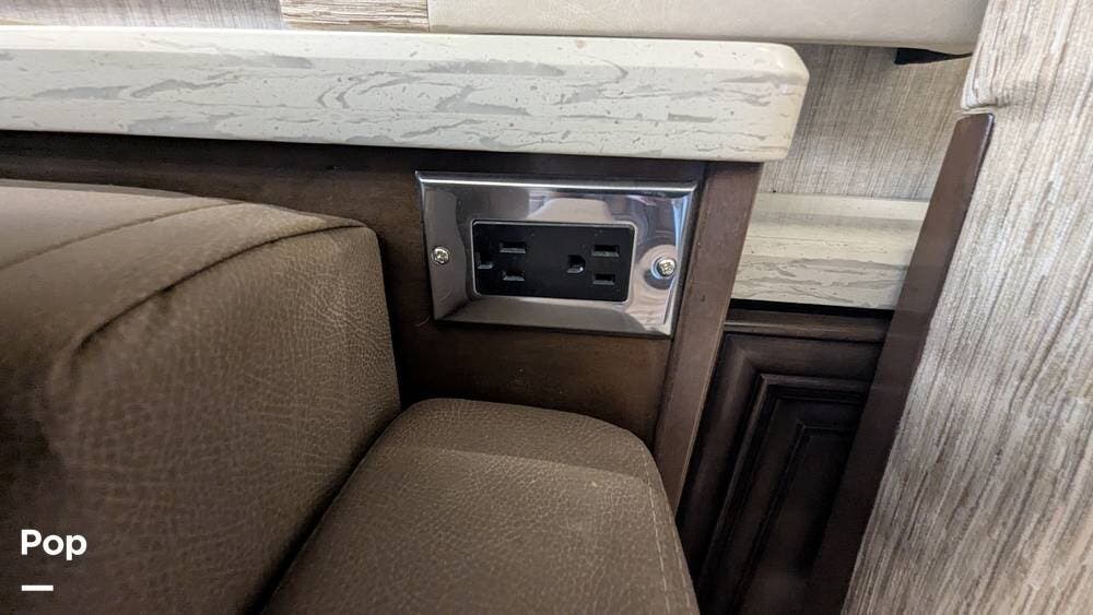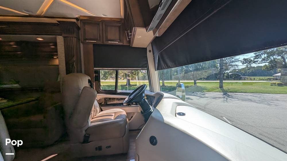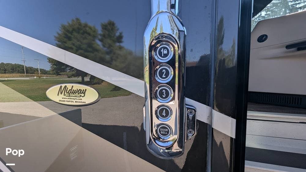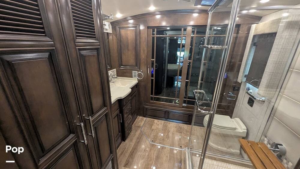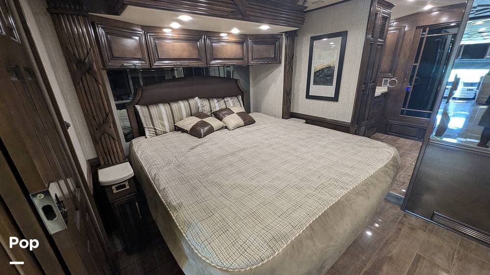 All of the convenience features are in place, along with a powered electrical cord reel and slide-out storage trays in the basement. The TV in the living room also retracts into the gorgeous wood cabinetry when not in use. There are also multiple TV's and access to entertainment systems, including an outside TV for tailgating.