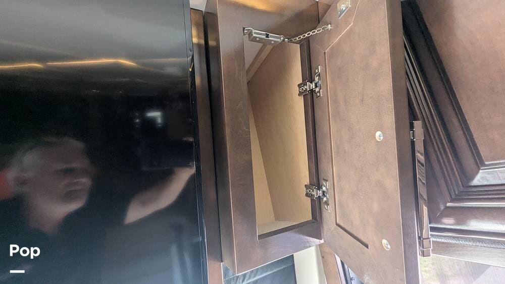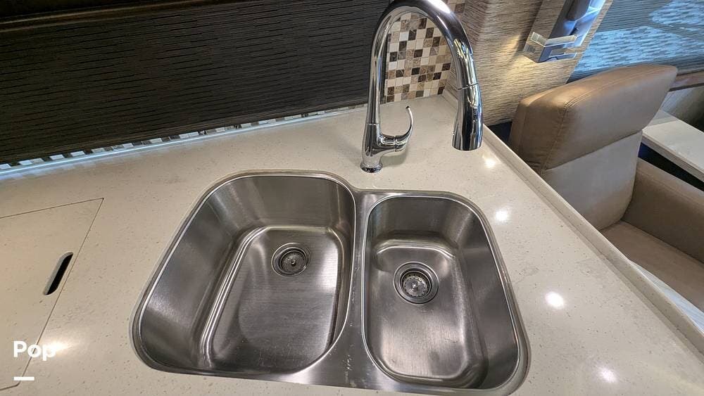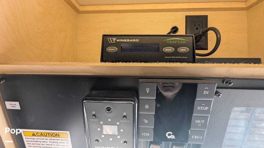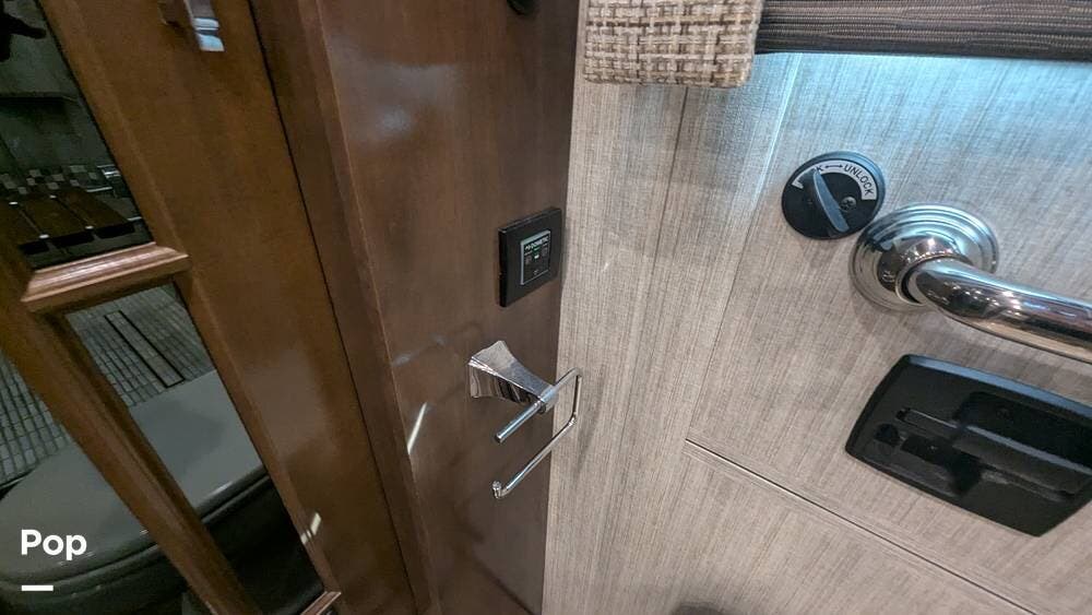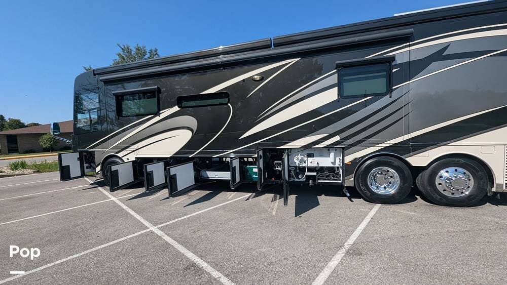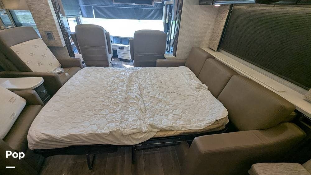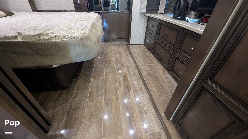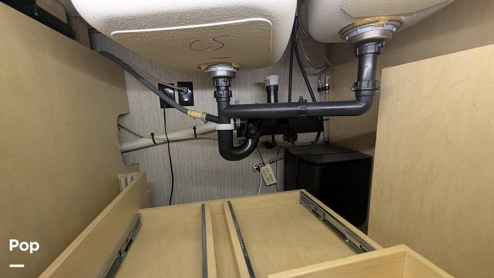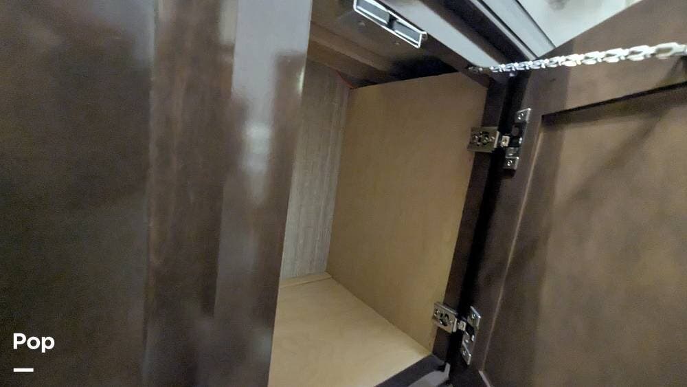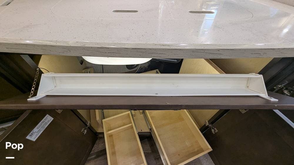 All of the convenience features are in place, along with a powered electrical cord reel and slide-out storage trays in the basement. The TV in the living room also retracts into the gorgeous wood cabinetry when not in use. There are also multiple TV's and access to entertainment systems, including an outside TV for tailgating.