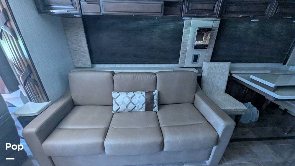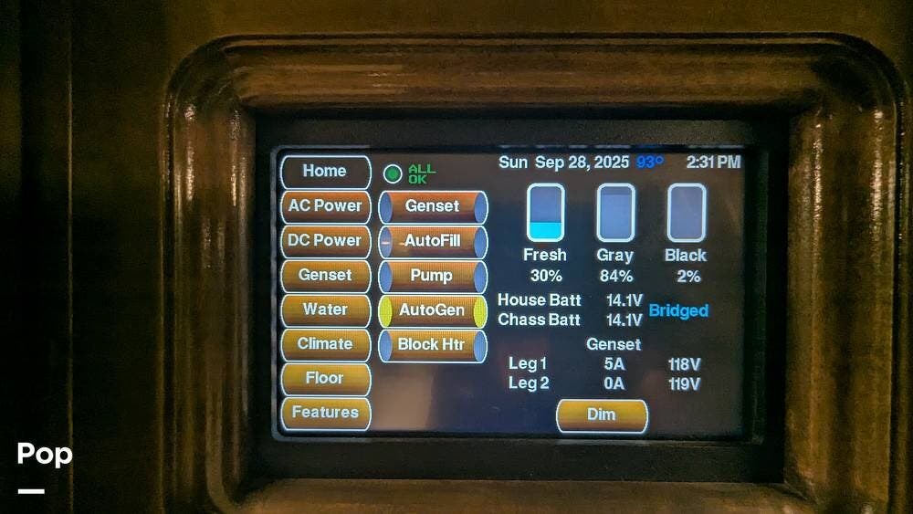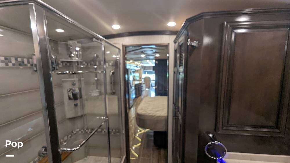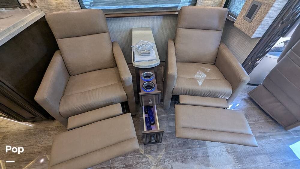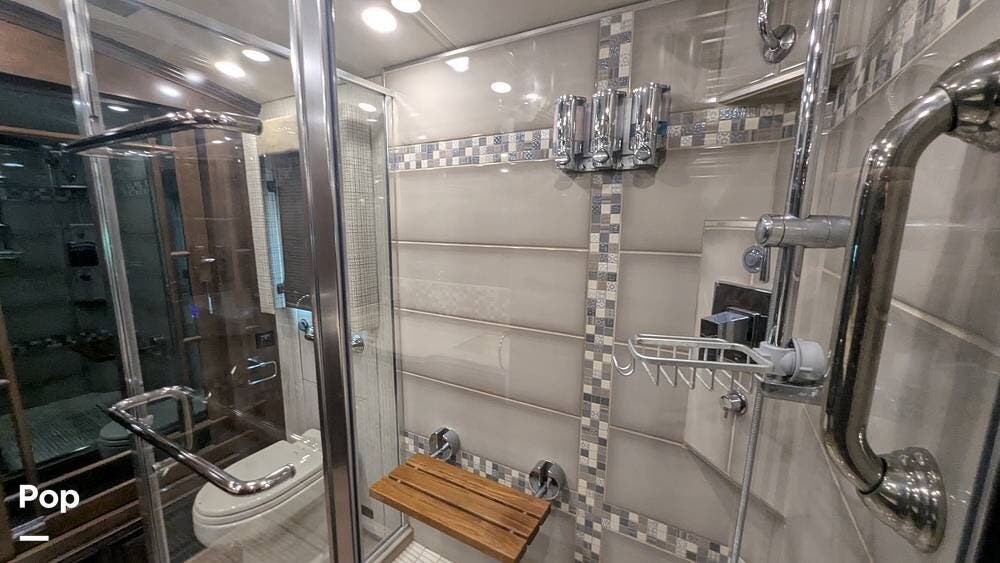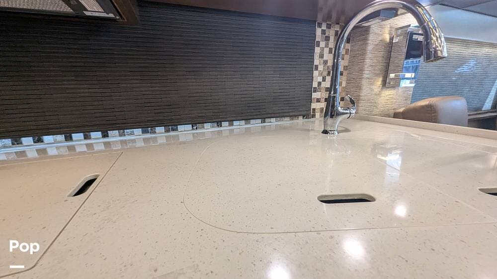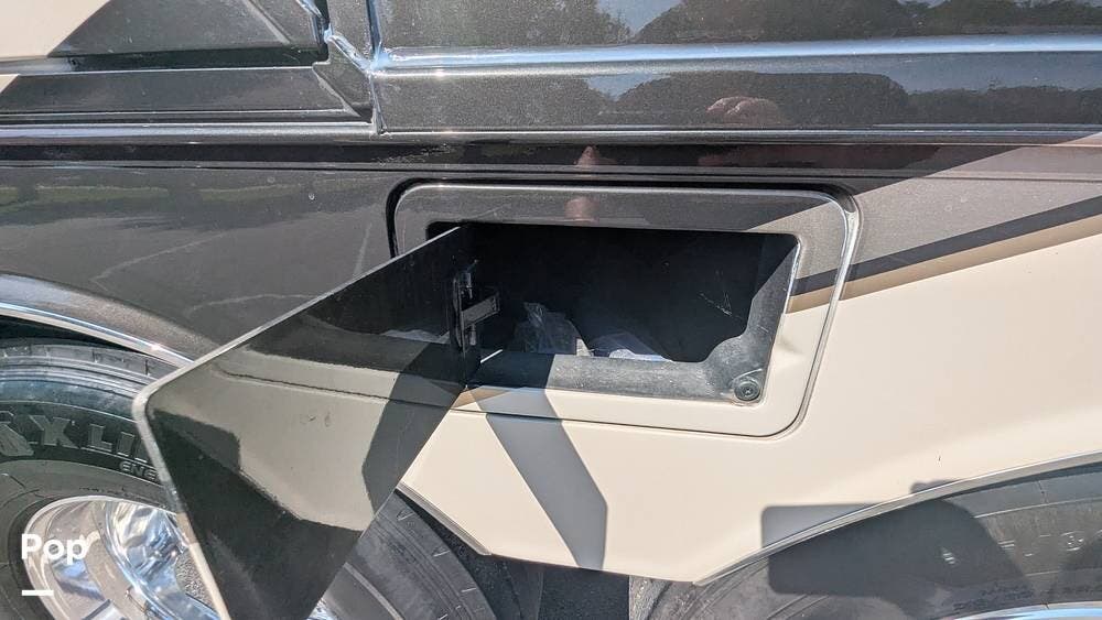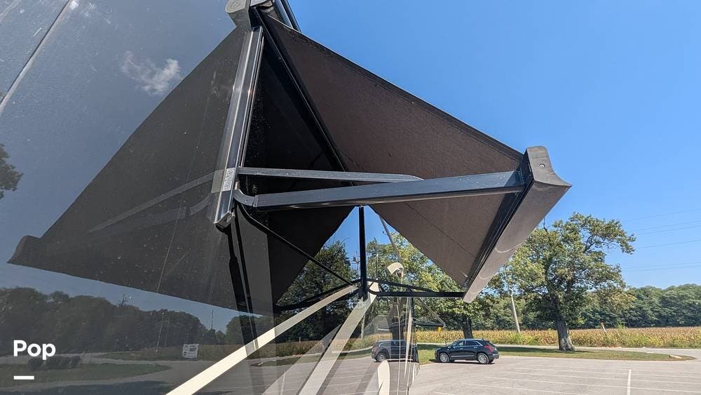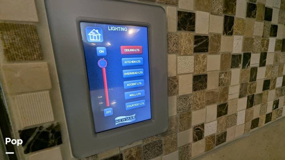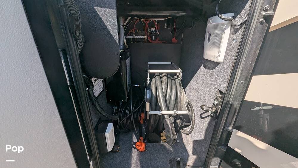 All of the convenience features are in place, along with a powered electrical cord reel and slide-out storage trays in the basement. The TV in the living room also retracts into the gorgeous wood cabinetry when not in use. There are also multiple TV's and access to entertainment systems, including an outside TV for tailgating.