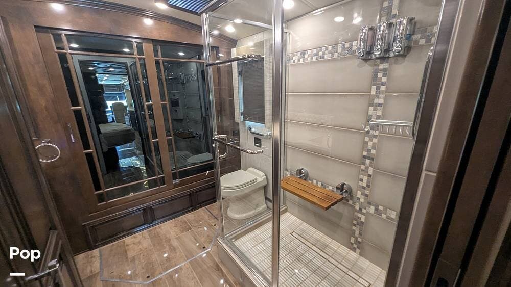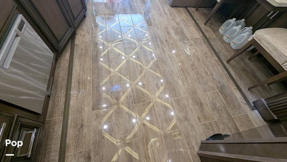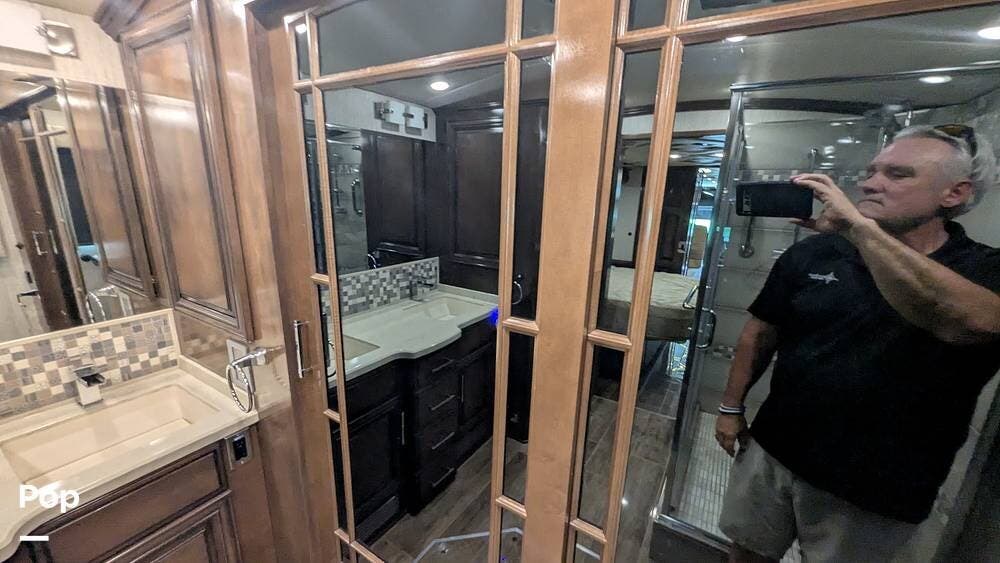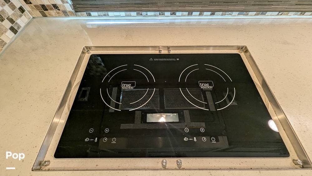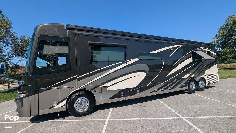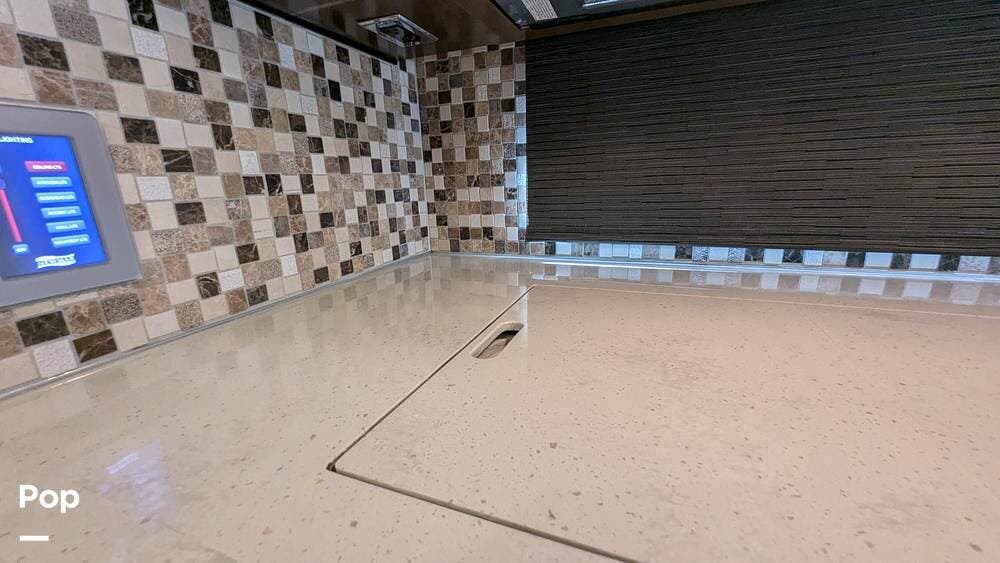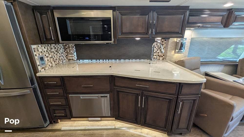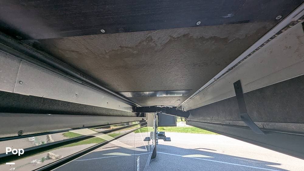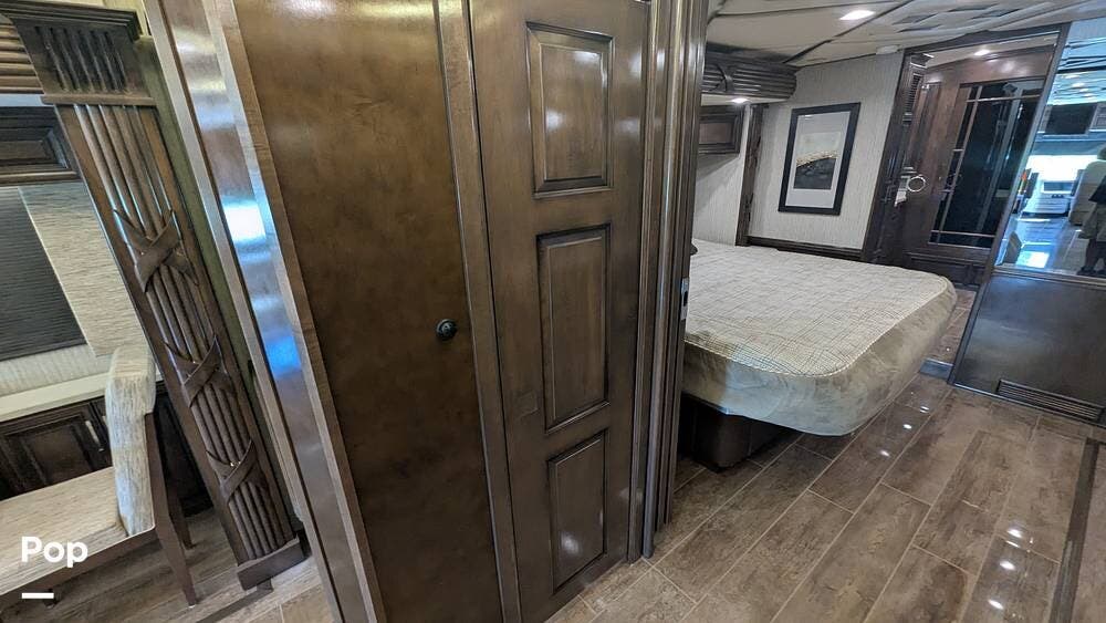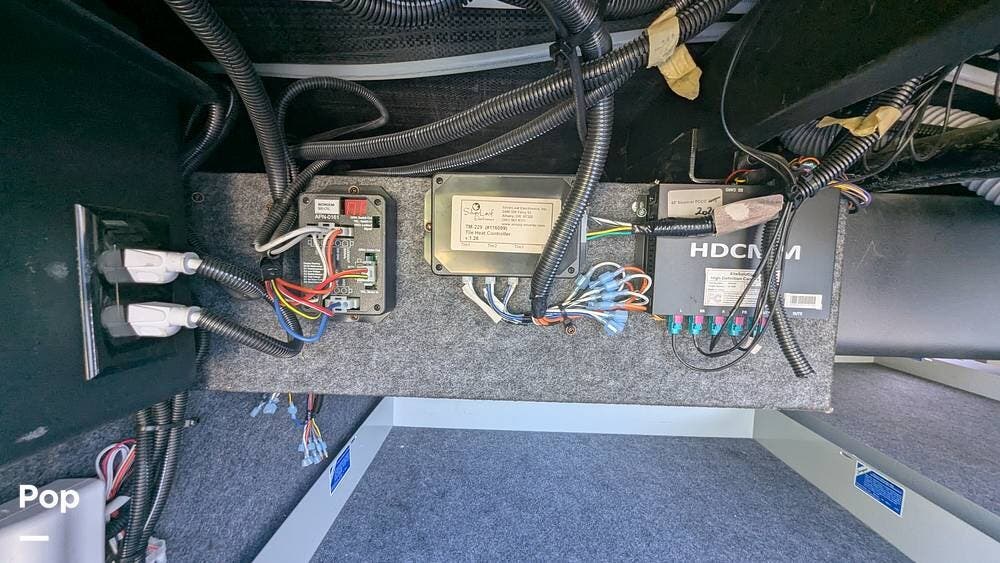 All of the convenience features are in place, along with a powered electrical cord reel and slide-out storage trays in the basement. The TV in the living room also retracts into the gorgeous wood cabinetry when not in use. There are also multiple TV's and access to entertainment systems, including an outside TV for tailgating.
