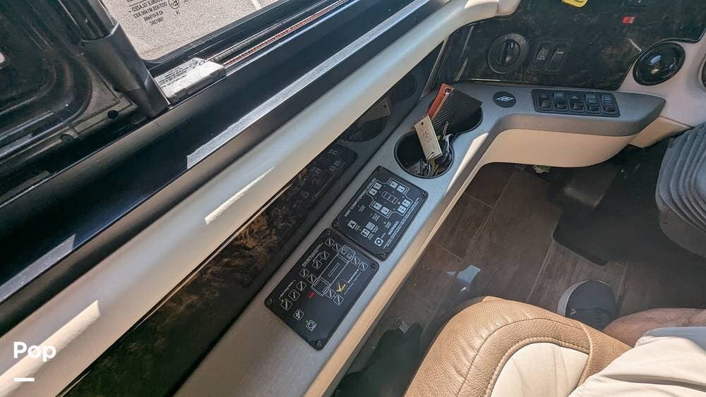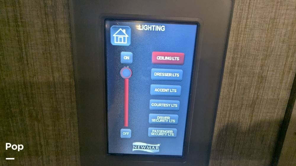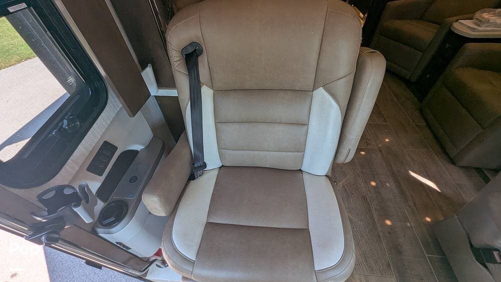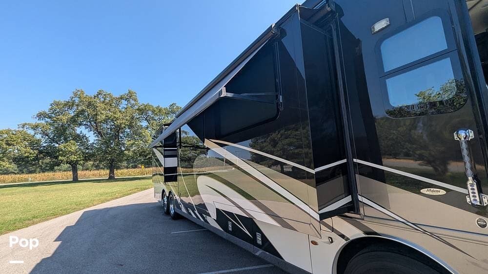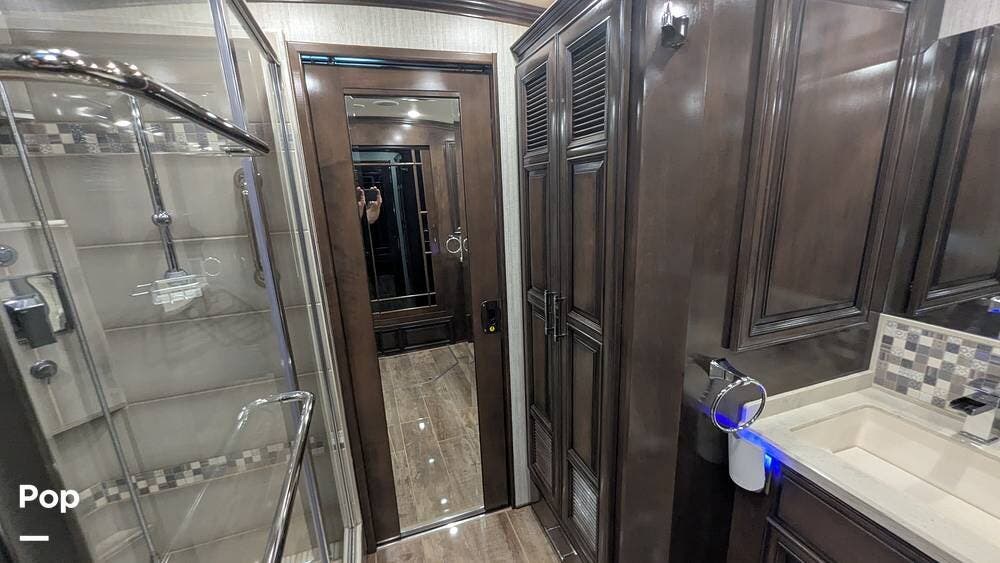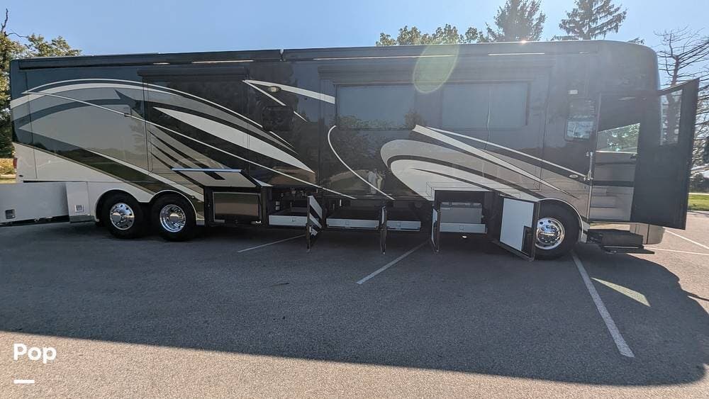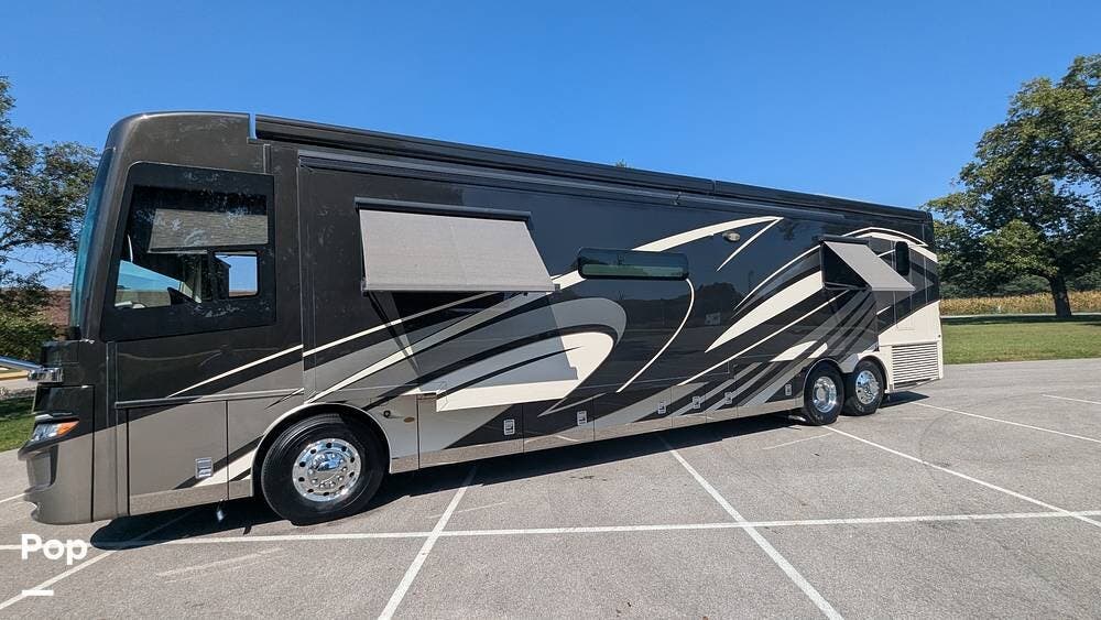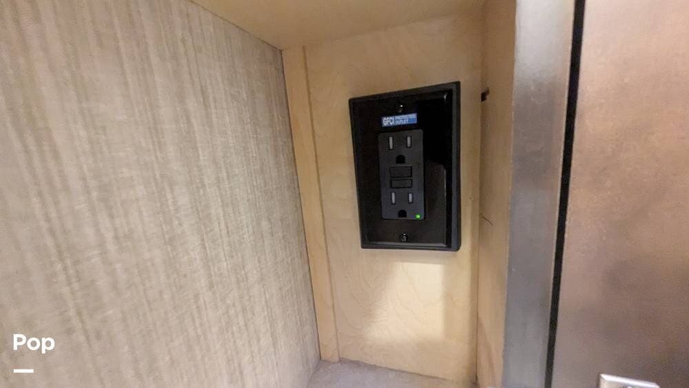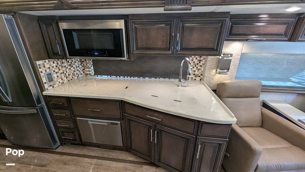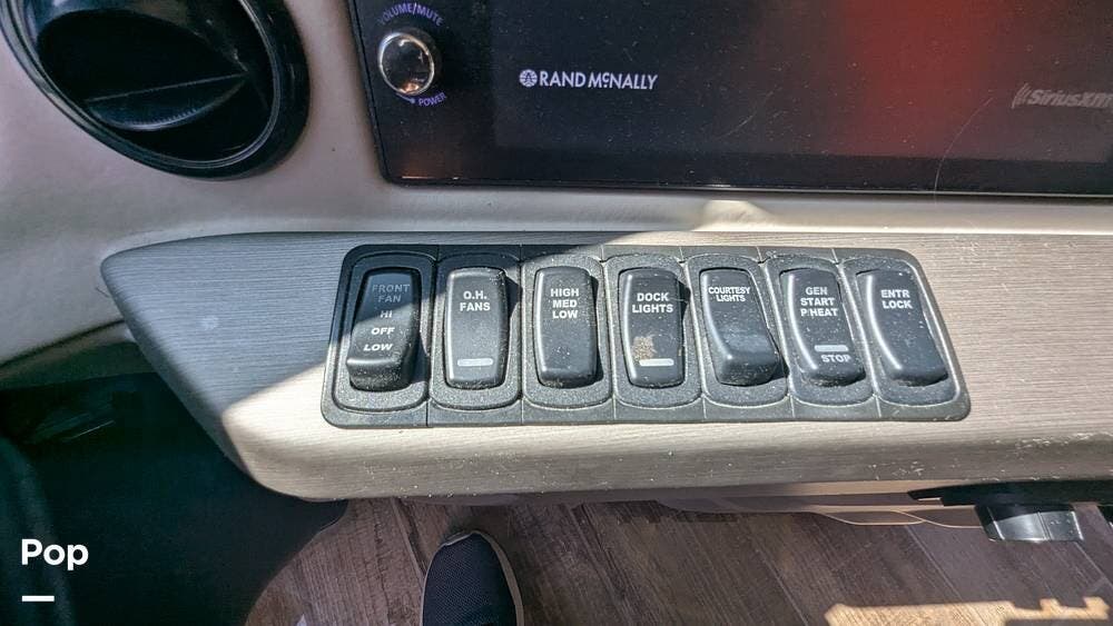 All of the convenience features are in place, along with a powered electrical cord reel and slide-out storage trays in the basement. The TV in the living room also retracts into the gorgeous wood cabinetry when not in use. There are also multiple TV's and access to entertainment systems, including an outside TV for tailgating.