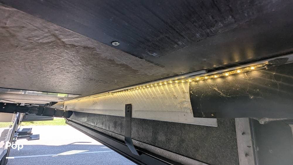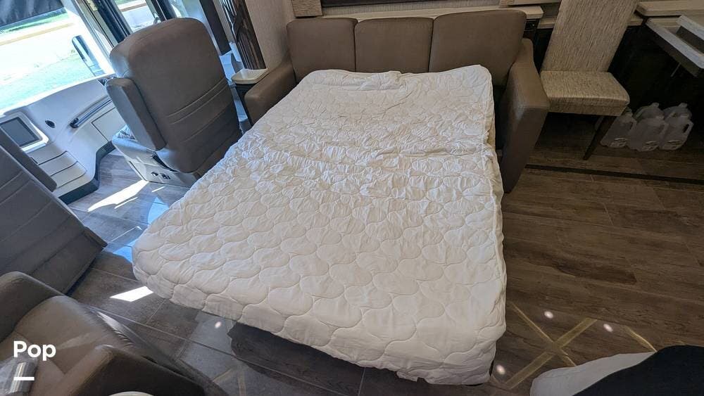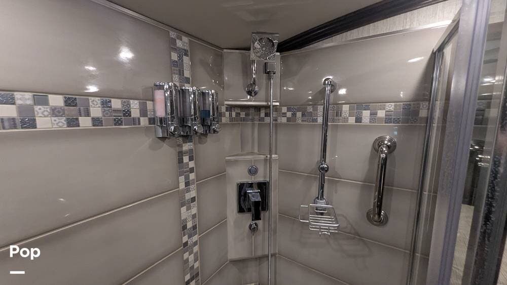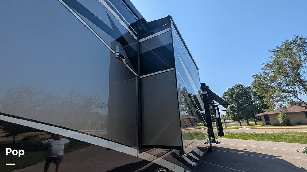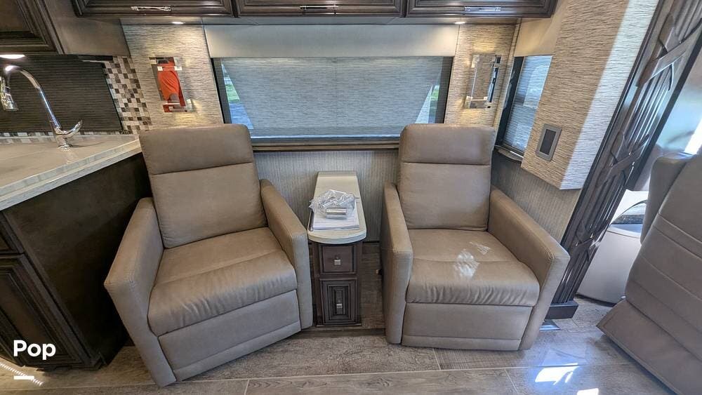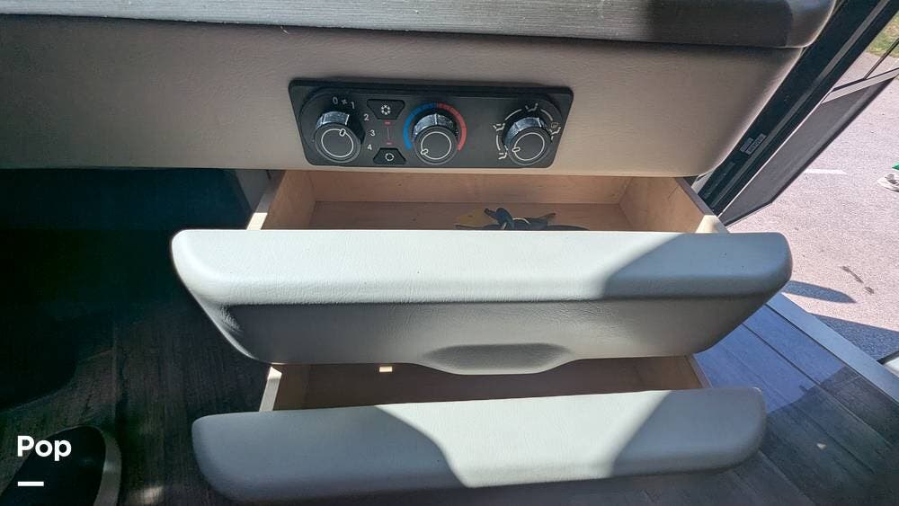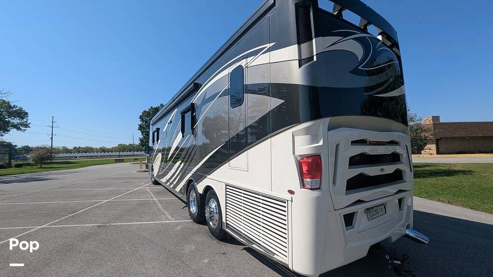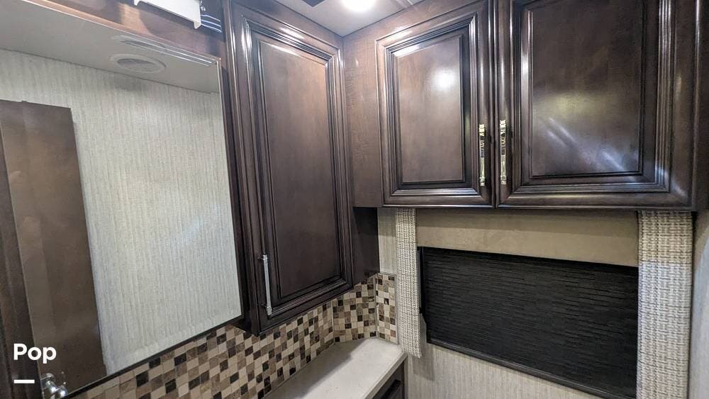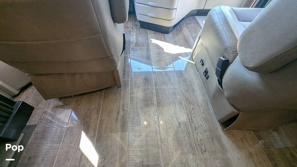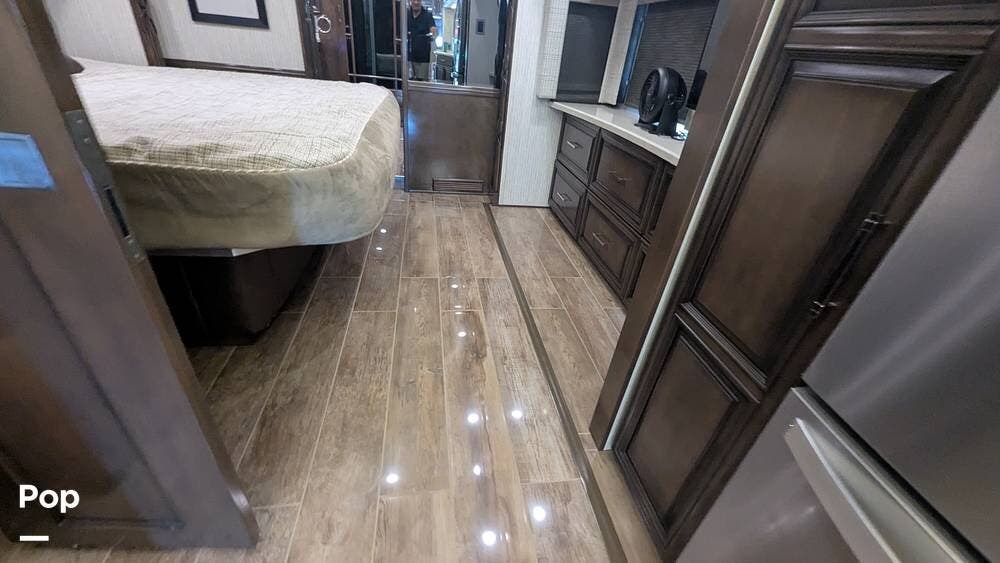 All of the convenience features are in place, along with a powered electrical cord reel and slide-out storage trays in the basement. The TV in the living room also retracts into the gorgeous wood cabinetry when not in use. There are also multiple TV's and access to entertainment systems, including an outside TV for tailgating.