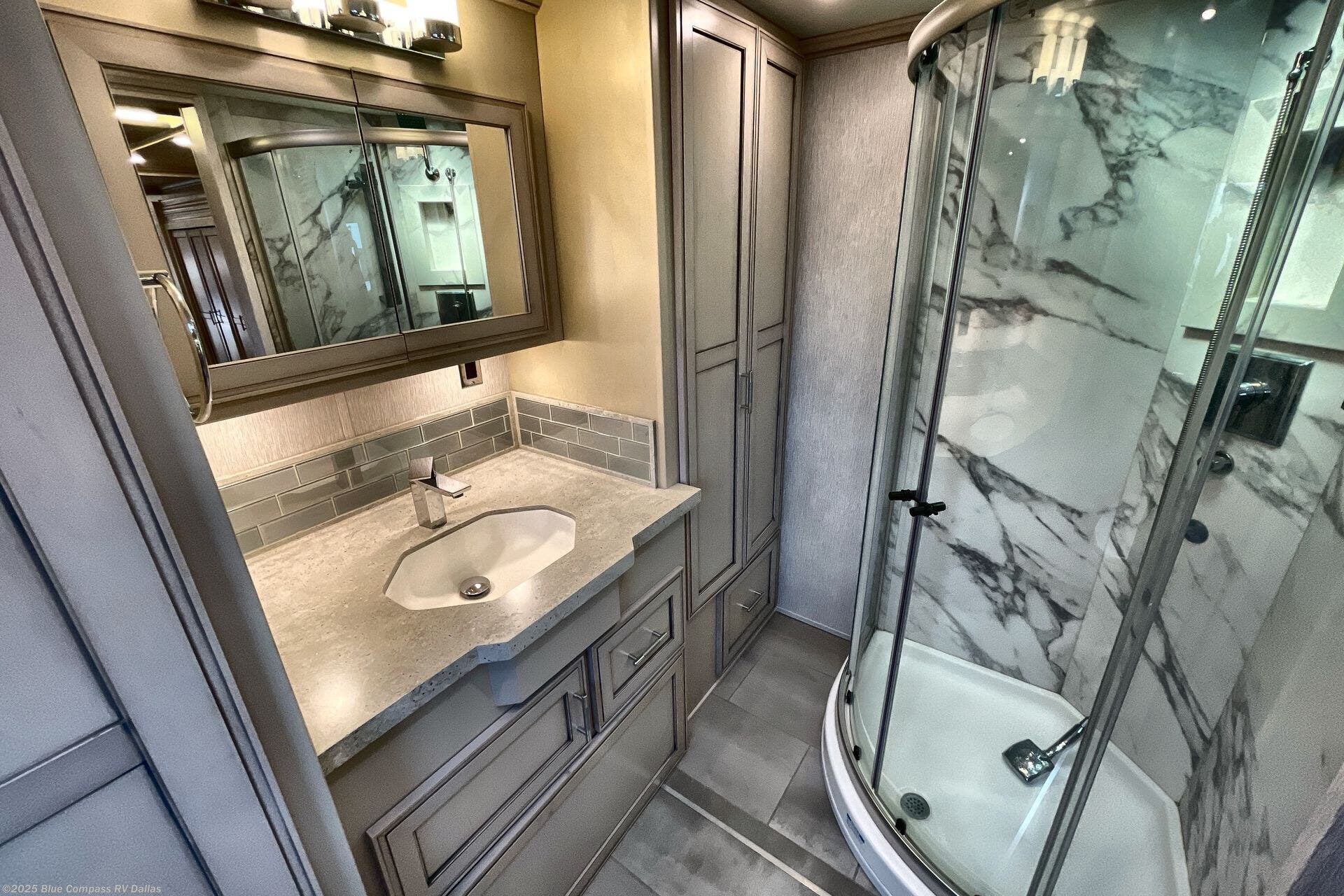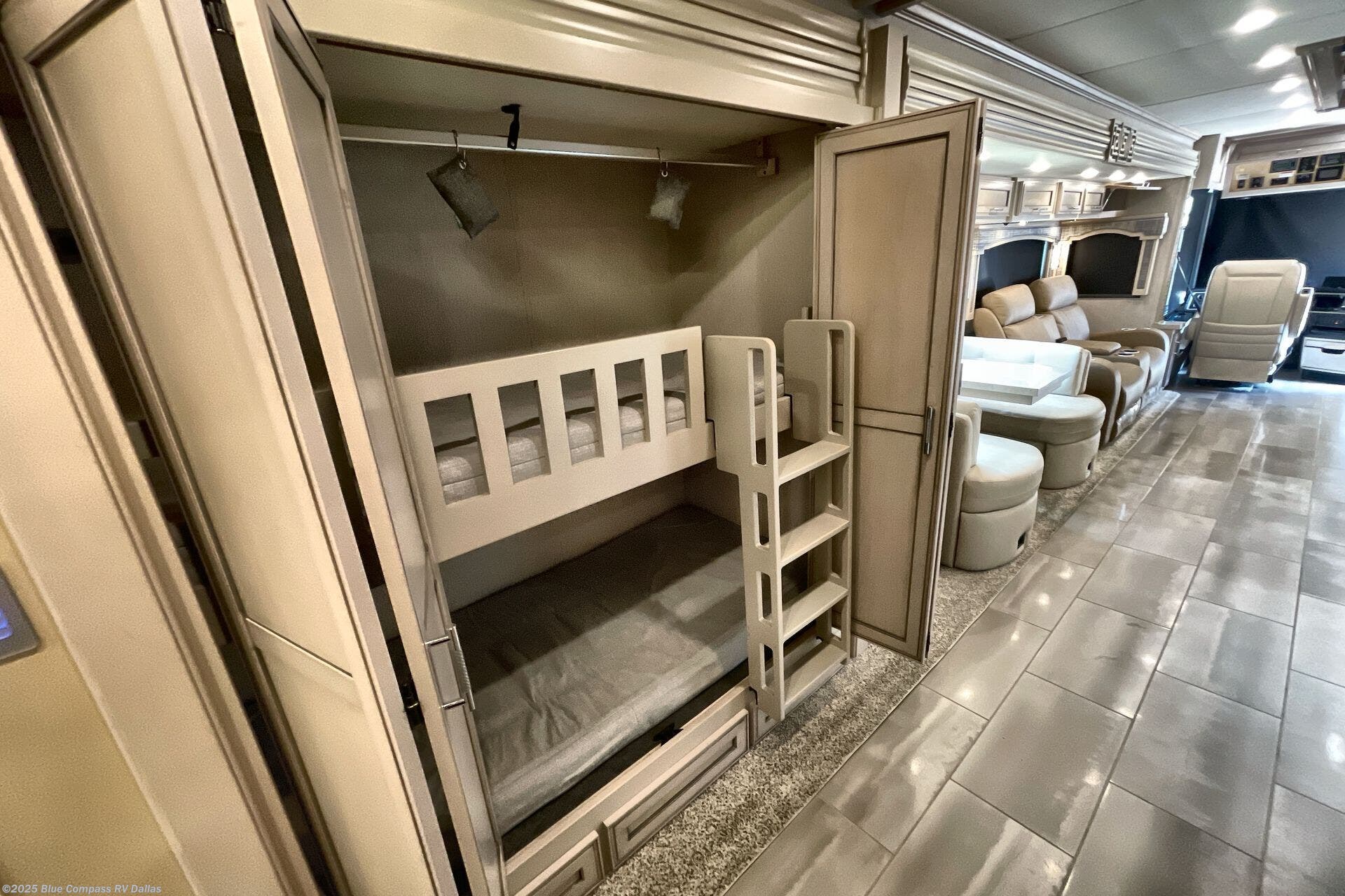 Whether you need more wardrobe space or a bunk for your grandchild, this coach will have you traveling in comfort and style. Beginning with the TVs and Blue-Ray disk players for inside entertainment, the wall-mounted sensors for the heating and air conditioning, and the wireless charging mat built into the dash to the passenger seat including a workstation and footrest, you are going to love the journey as much as the destination. And the convenient half bath will allow more than one person to get ready at the same time. The chef will love all the kitchen appliances including two pantries and an appliance garage while visiting with everyone on the two sofas.