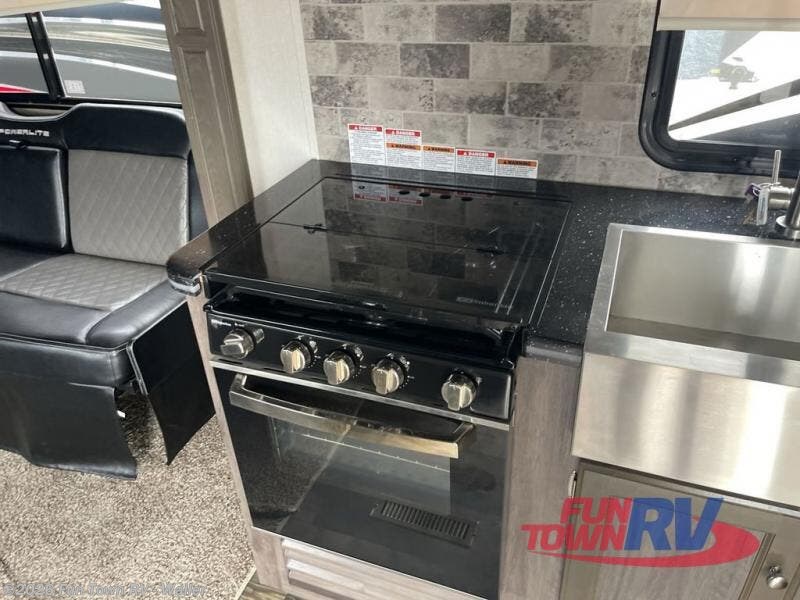 For a relaxing and inviting weekend getaway, you need this Powerlite toy hauler that will give you a piece of home wherever you roam! From the king-size bed in the private master suite to the fully loaded bathroom with a skylight above, you will be able to feel the elegance this trailer provides from the moment you enter in. If you enjoy traveling with company, you will be able to do so in this unit because the electric bunk, along with the sofa slide, give this model the space to sleep six people.