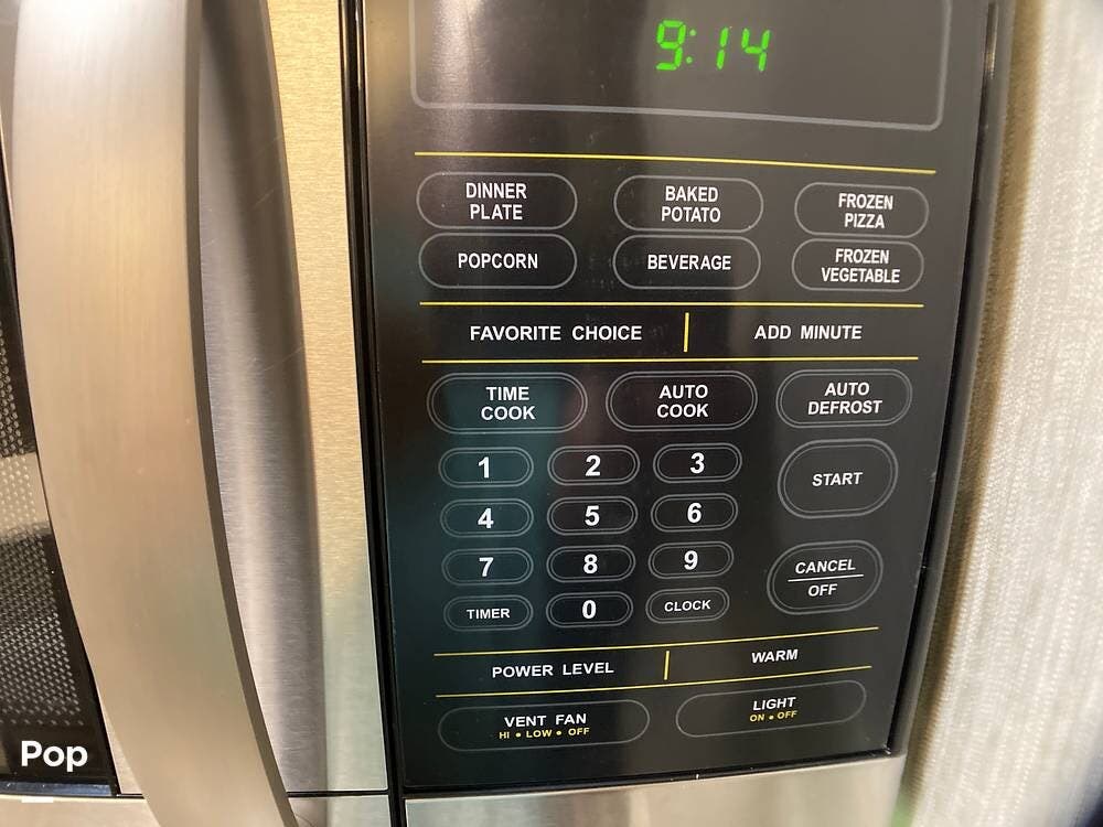 The kitchen features stainless steel appliances, including the stove/oven, microwave oven, and full-size three-door residential refrigerator/freezer with an automatic ice maker.