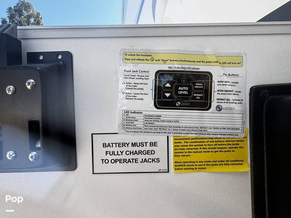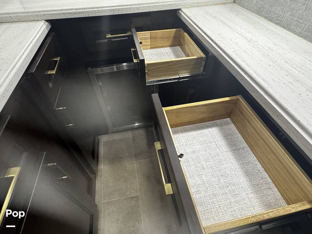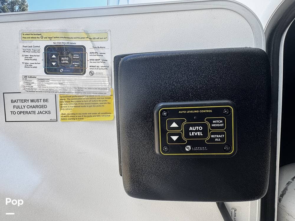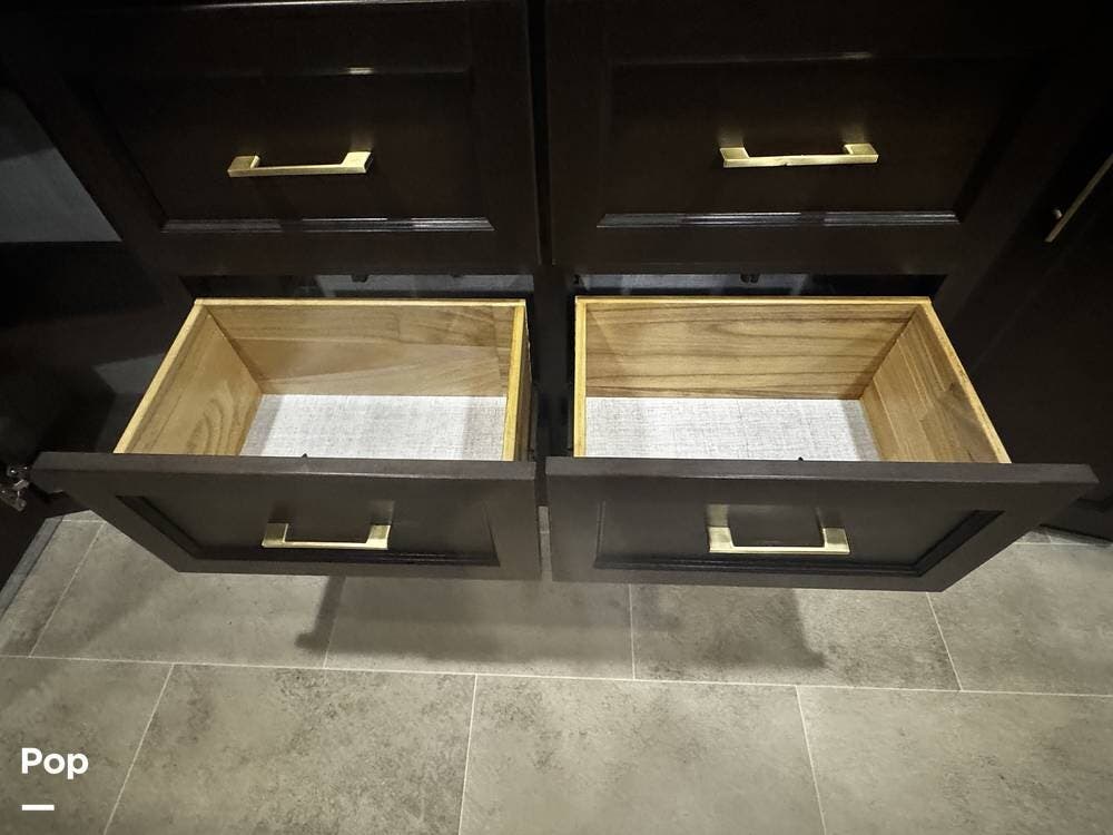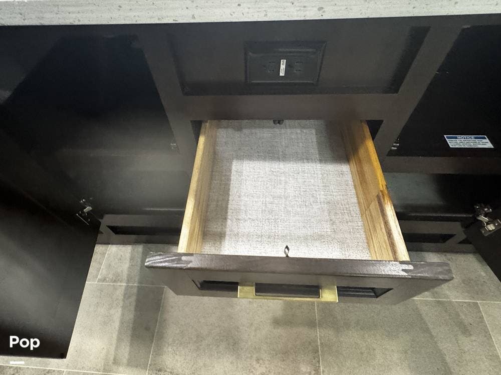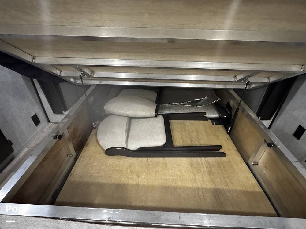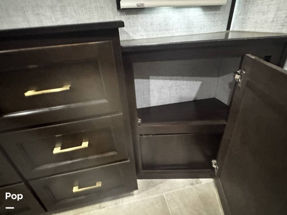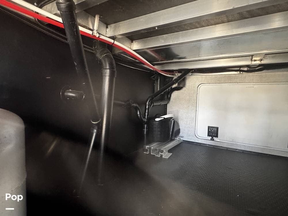 The RV features climate-controlled drop-frame pass-thru storage compartments, offering ample space for gear and essentials. Additionally, it is prepped for a rear-view camera and slide toppers, enhancing safety and convenience.