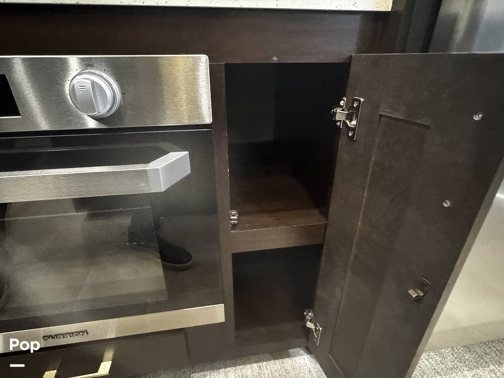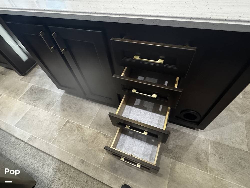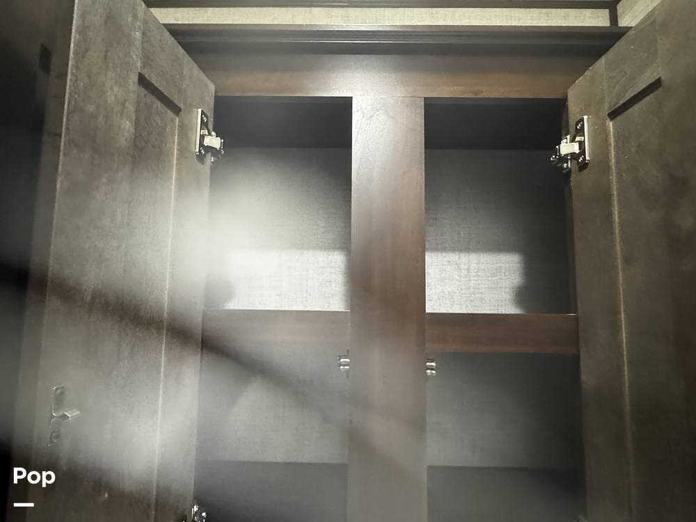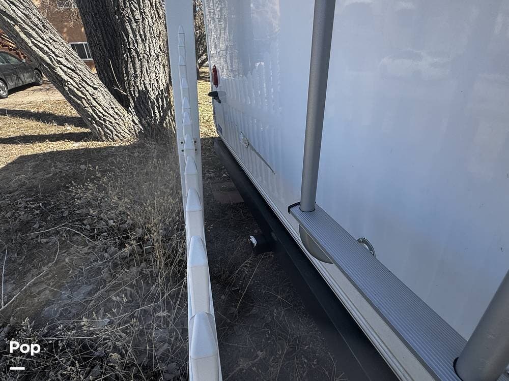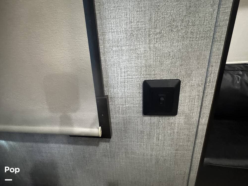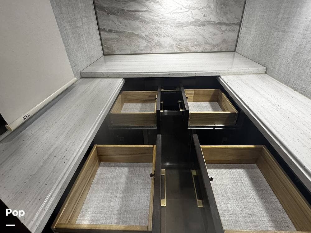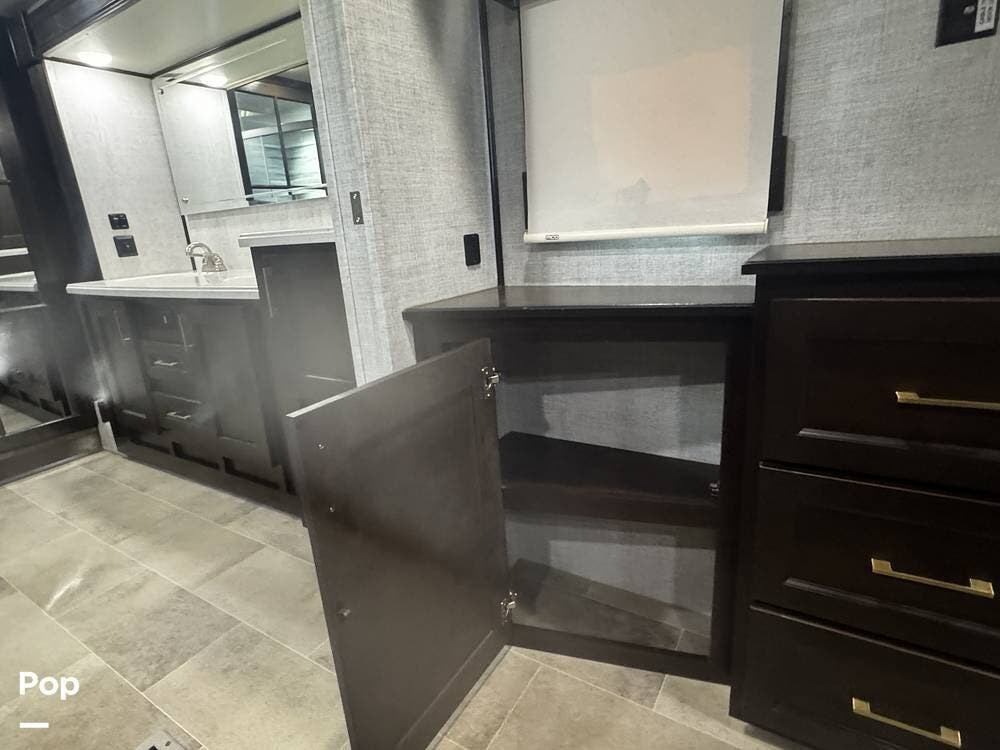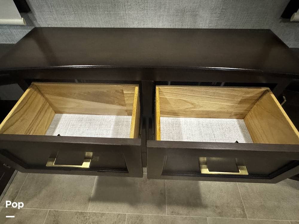 The RV features climate-controlled drop-frame pass-thru storage compartments, offering ample space for gear and essentials. Additionally, it is prepped for a rear-view camera and slide toppers, enhancing safety and convenience.