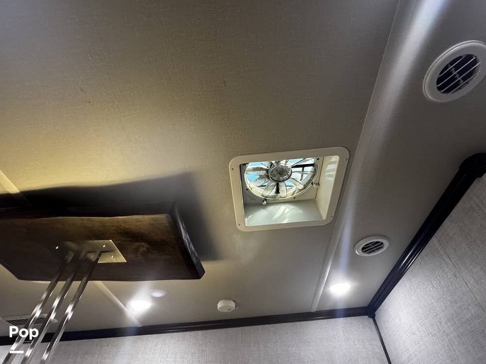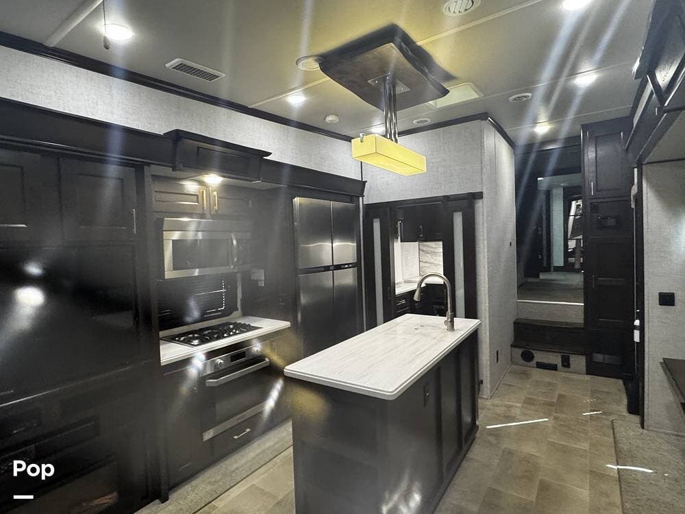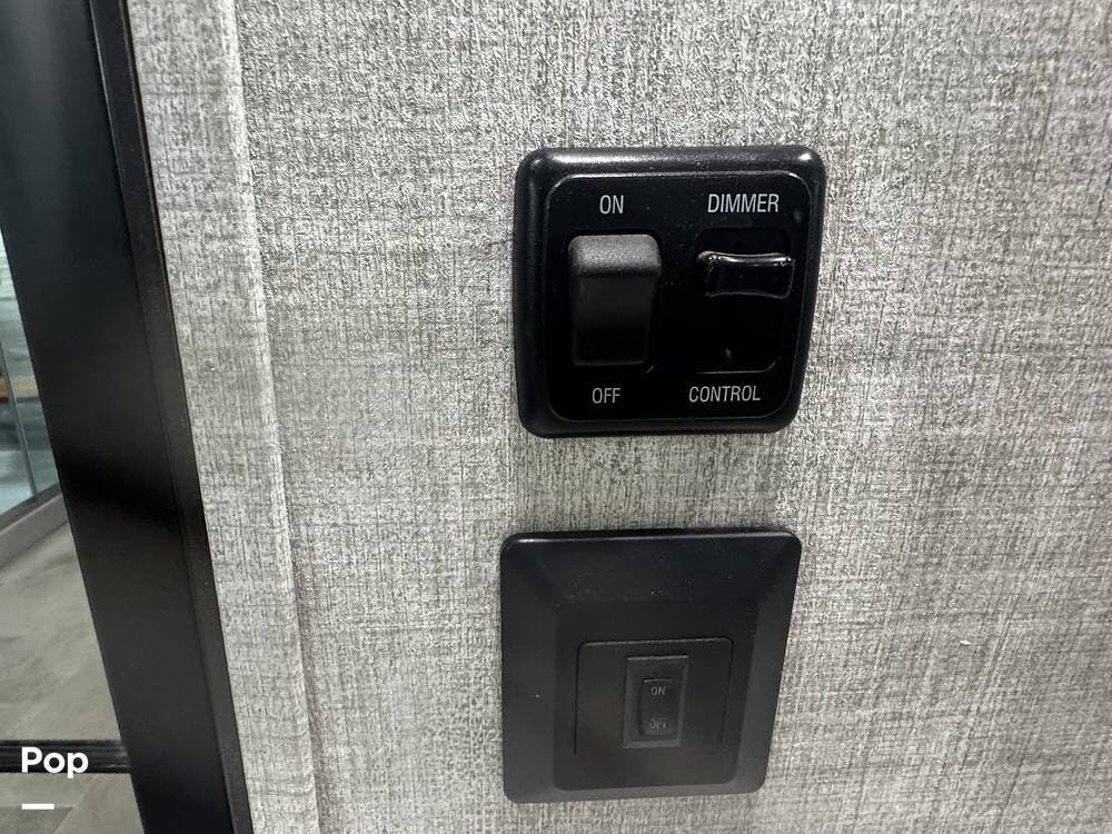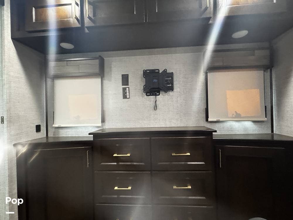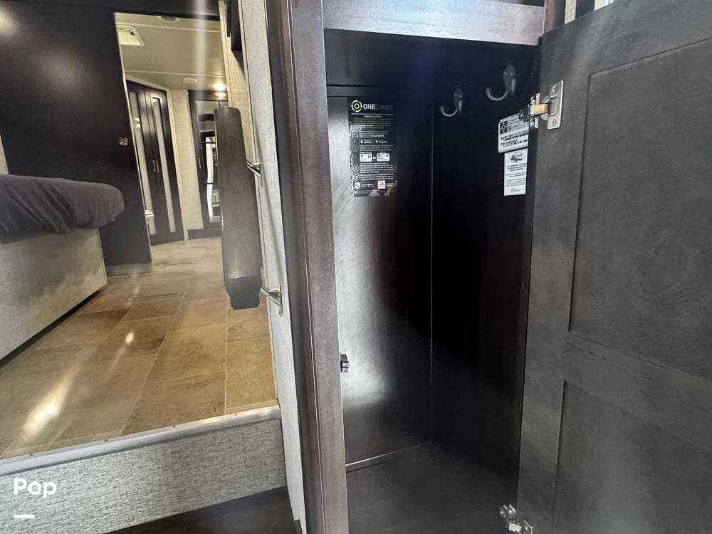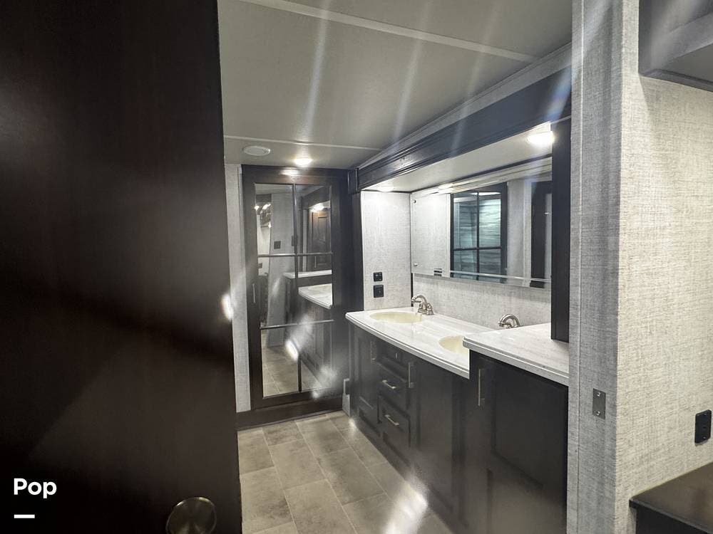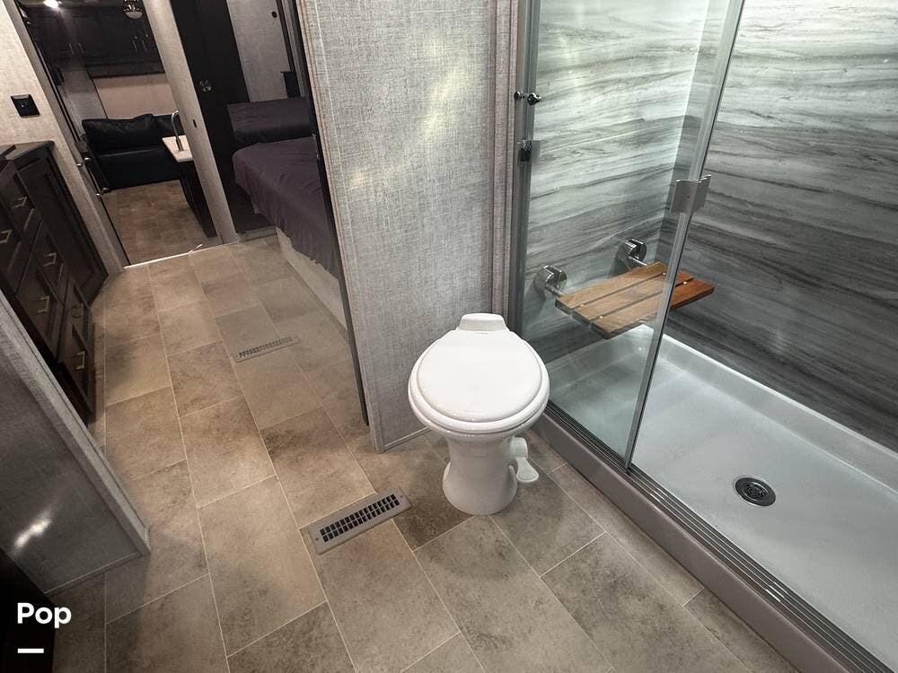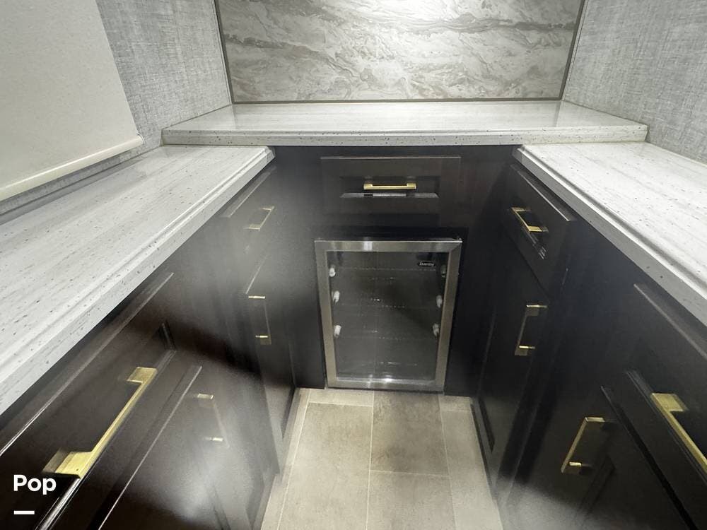 The RV features climate-controlled drop-frame pass-thru storage compartments, offering ample space for gear and essentials. Additionally, it is prepped for a rear-view camera and slide toppers, enhancing safety and convenience.