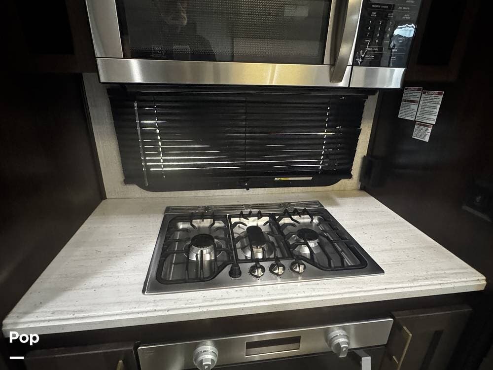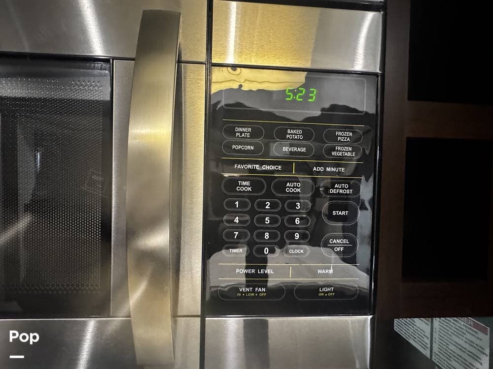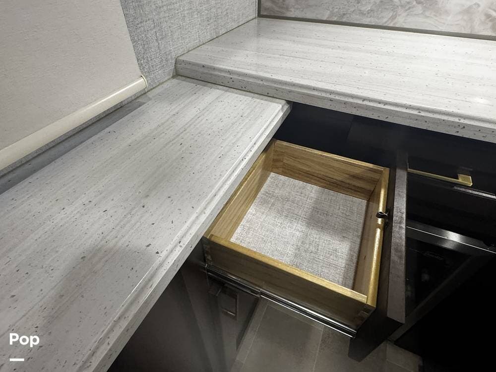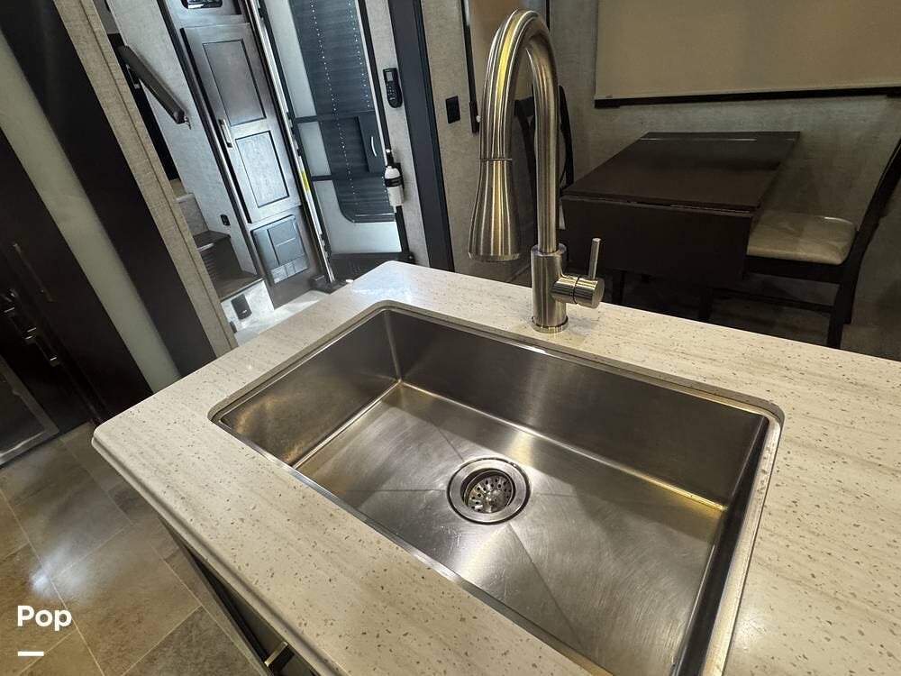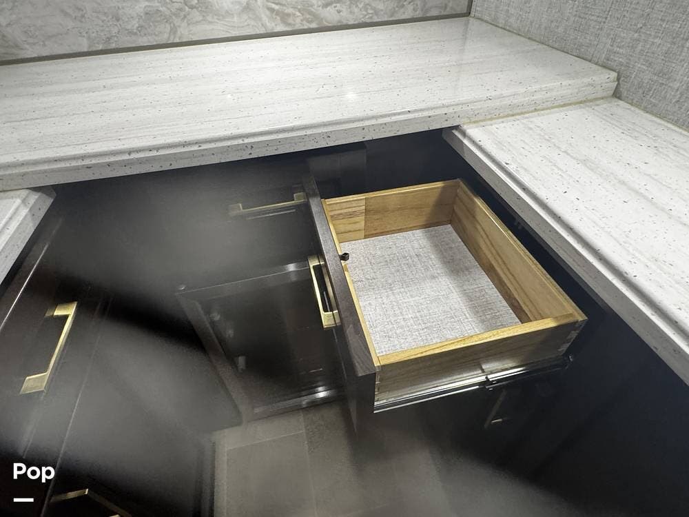 Equipped with true solid-surface countertops, a large single-bowl stainless steel sink, and a residential-style backsplash, the kitchen combines functionality with elegance. For added convenience, it also features a rollaway sink cover and dedicated trash can storage.