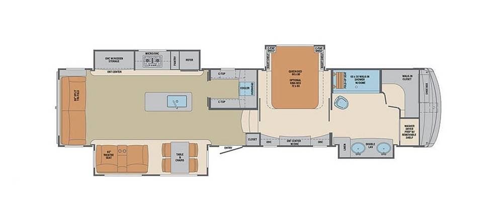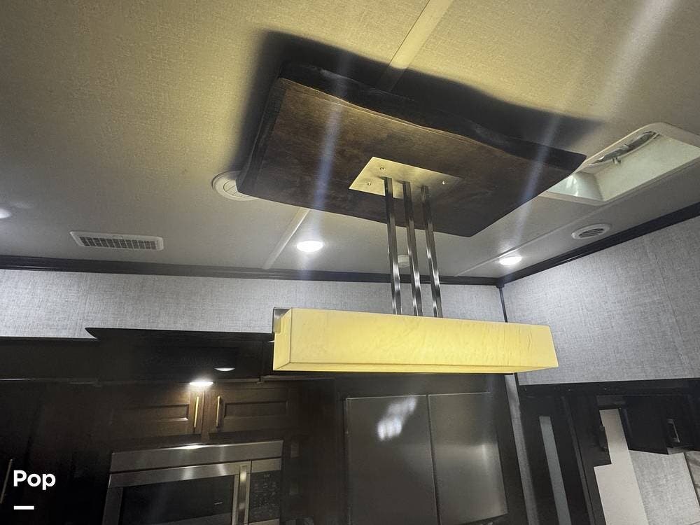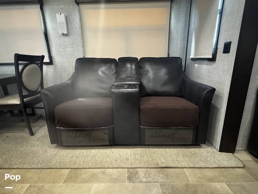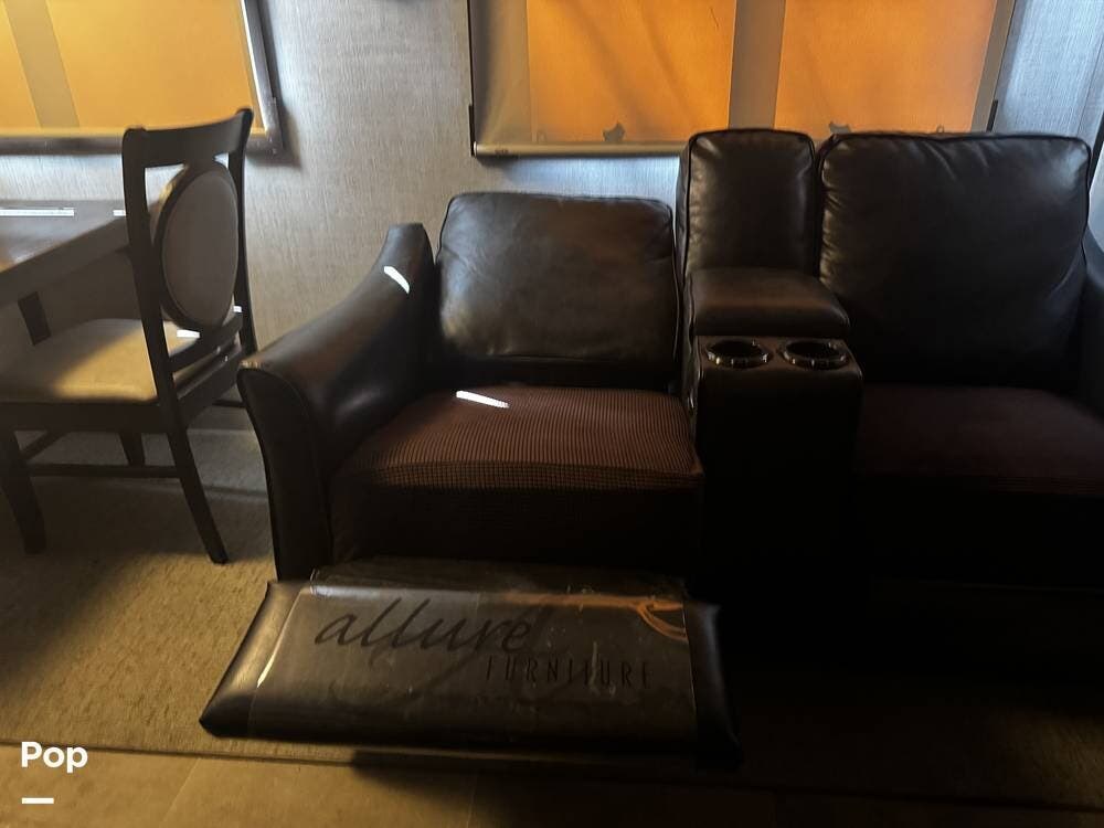 The living space is adorned with large frameless tinted windows, solid wood slide fascia, and residential-style crown molding, creating an inviting atmosphere. Comfortable seating options, such as a split tri-fold sofa and theater seats, are ideal for relaxation and entertainment.
