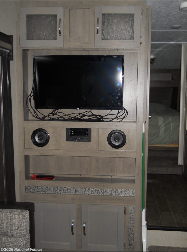 Toward the front, the private master bedroom offers a comfortable queen bed, wardrobe storage, and overhead cabinets. The bathroom includes a radius shower, vanity, and linen space, ensuring convenience and privacy. With its durable construction, power awning, outdoor speakers, and pass-through storage, the 2020 Palomino Puma 253FBS is the perfect fifth wheel for couples or small families seeking a well-balanced combination of comfort, practicality, and ease of travel.