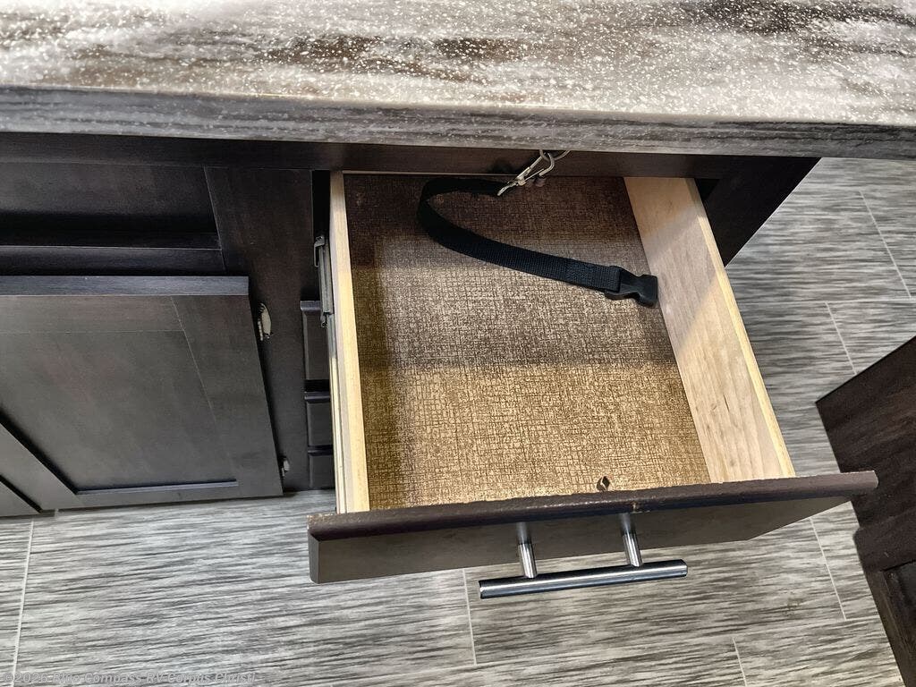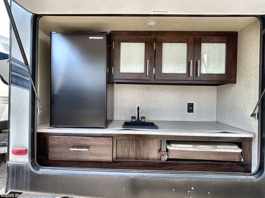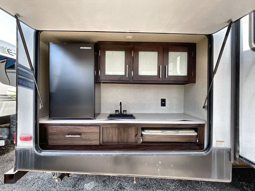 You will be counting the days until your next camping trip with this triple-slide LaCrosse travel trailer. Just imagine your outdoor kitchen will be the talk of the campground when you are grilling steaks for your family. You can prepare the meal inside on the kitchen island with decorative pendant lighting after grabbing the seasoning from the oversized pantry. You will appreciate the opposing slides in the main living and kitchen area that provide plenty of floor space to walk around the trailer to get to each room. If it's time to spend some time indoors, the hide-a-bed sofa and U-shaped dinette allow everyone to come together to watch the 50" LED TV or play games. At night, you can retire to your own master suite up front while the kids choose a bunk bed or the Sleep and Play to try to fall asleep in their own private bunkhouse.
