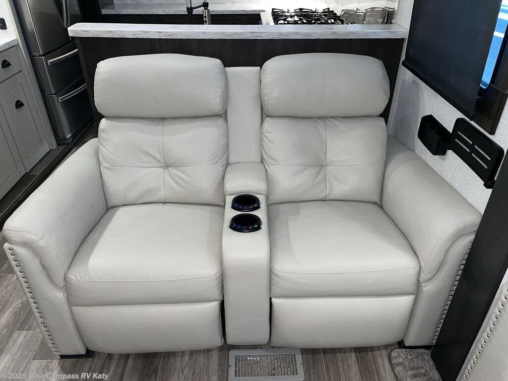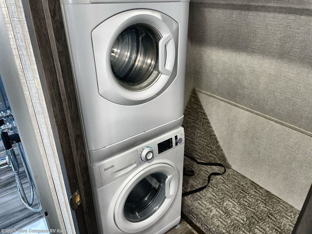 Just because you want to enjoy the camping life, doesn't mean you should have to sacrifice luxury features. With this fifth wheel you can relax just like you do at home and some! You'll love the rear kitchen that includes ample counter space and a waterfall edge counter. Head to the main living area where you can enjoy some family time on the theater seats and the dinette with chairs will be the perfect place for a game of cards. The half bath is right off of this room for convenience and the kids can convert the tri-fold sofa for sleeping space at night. Mom and dad will love the master bedroom with a king bed slide out, a dresser with a flip-up lid, plus a 39" LED HDTV. The front full bath is both spacious and includes a large wardrobe where you can even add an optional washer and dryer if you choose!