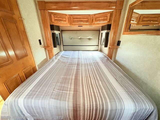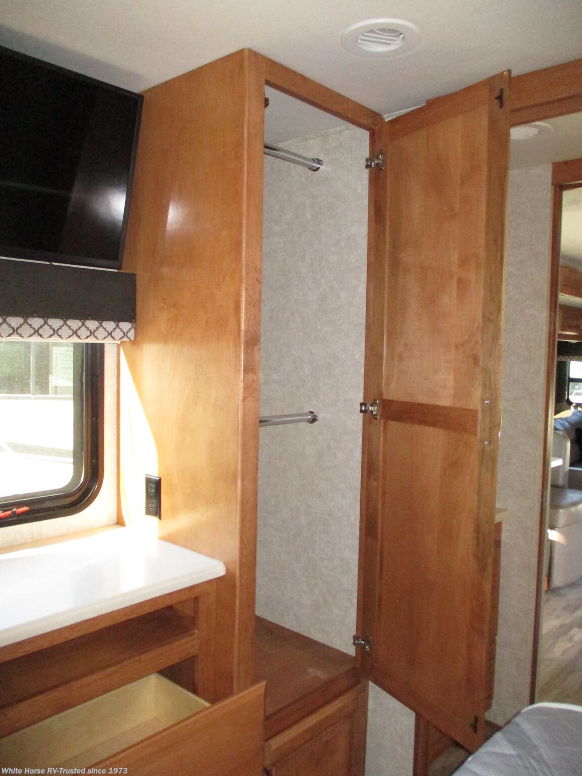 - Rear East-West Queen Bed Suite with Raised Panel Overhead Storage Cabinets, Wardrobes, Vanity, Chest of Drawers, and Bedroom TV!