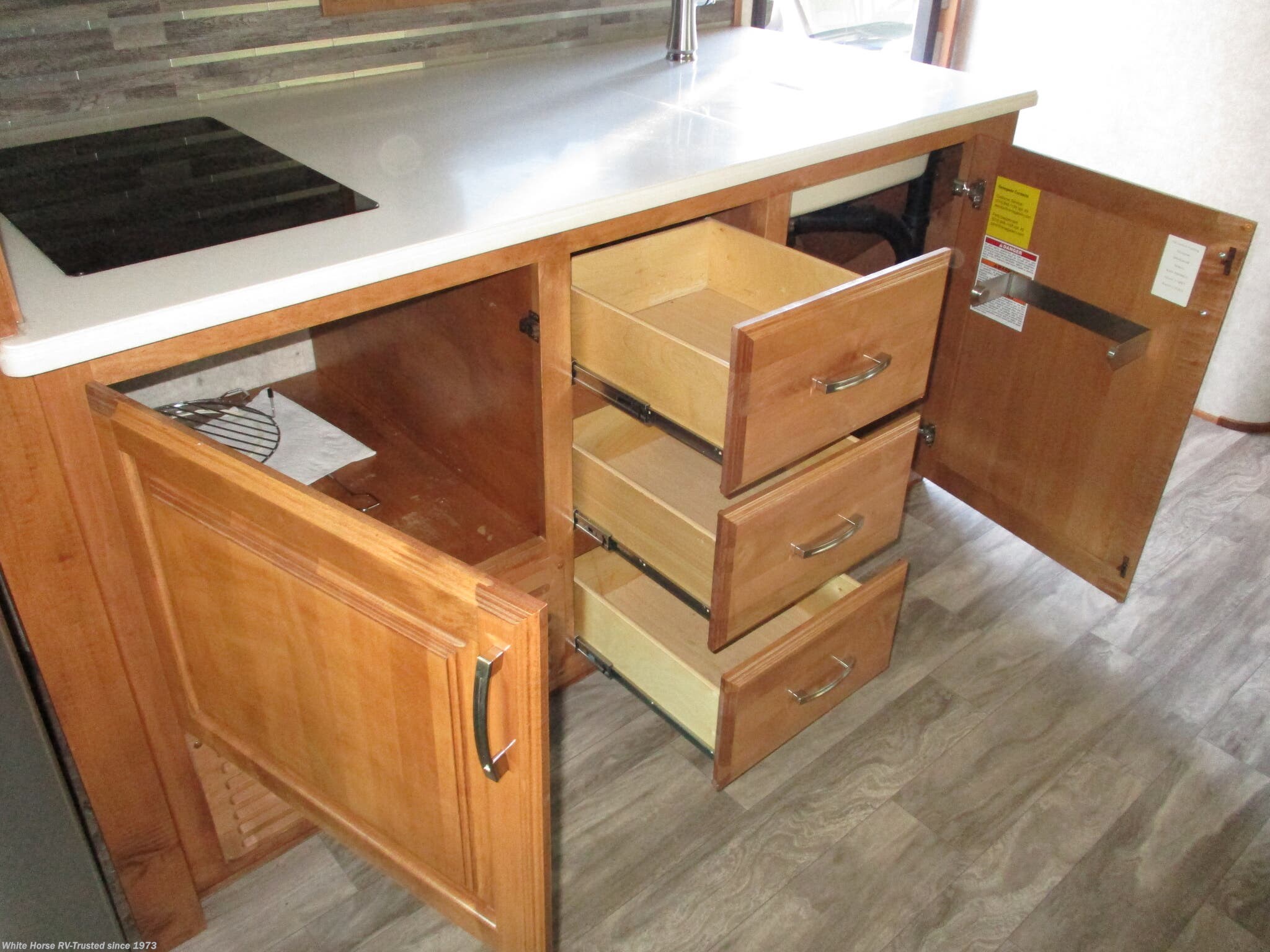 - Fully-Equipped Kitchen with Solid Maple Hardwood Cabinetry, Polished Solid Surface Countertops, Sink Covers, Induction Cook Top, Stainless Convection Microwave, and 18 cu.ft. Residential Fridge/Freezer!