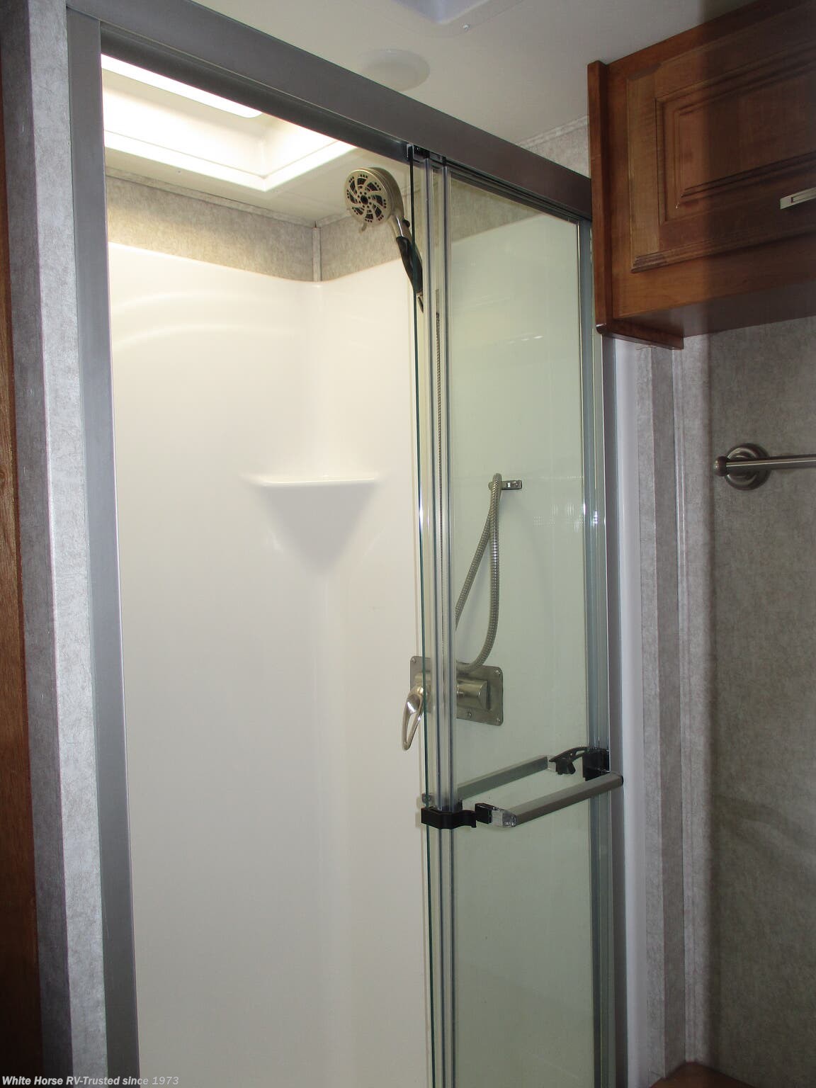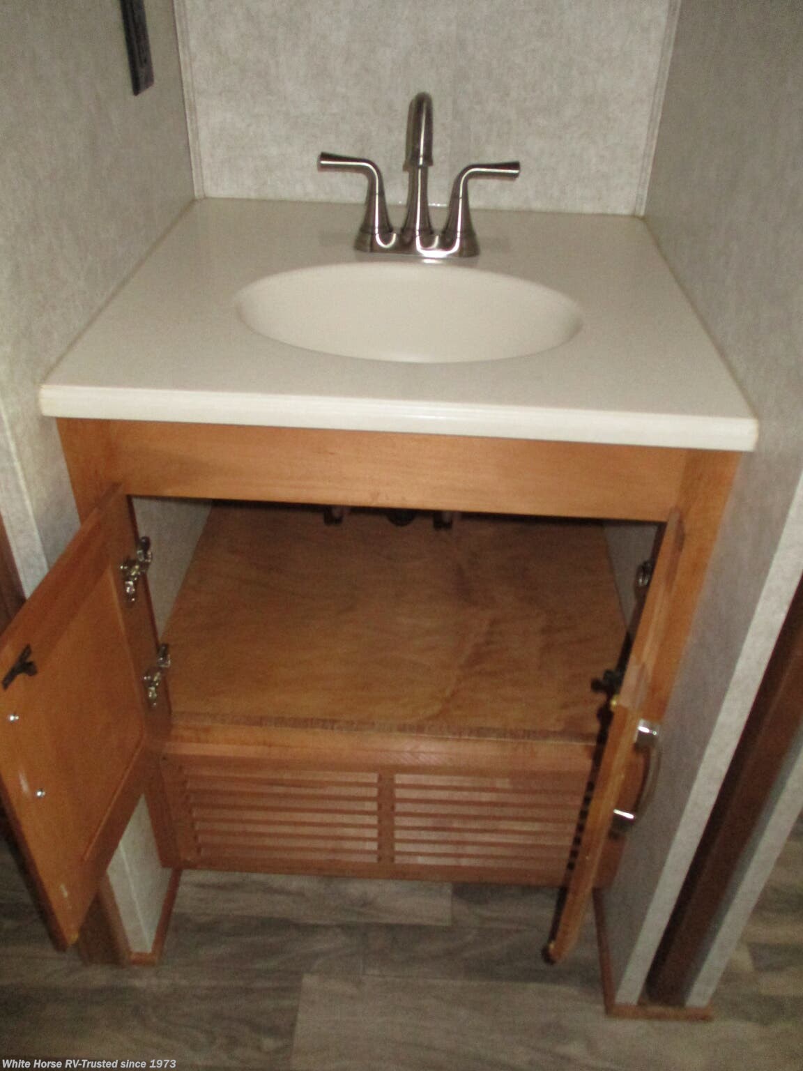 - Bath Vanity Sink with Storage, Foot Pedal Toilet, and Shower Surround with Glass Enclosure, Skylight, and High Volume Attic Fan!