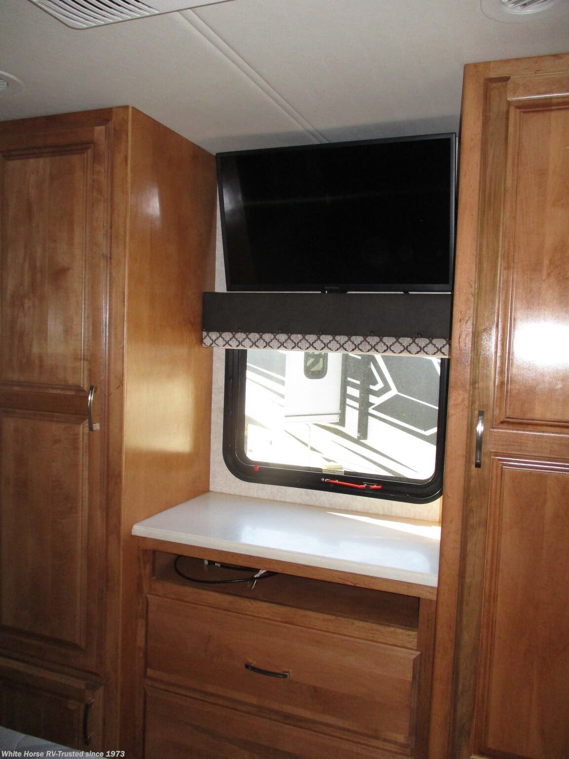 - Rear East-West Queen Bed Suite with Raised Panel Overhead Storage Cabinets, Wardrobes, Vanity, Chest of Drawers, and Bedroom TV!