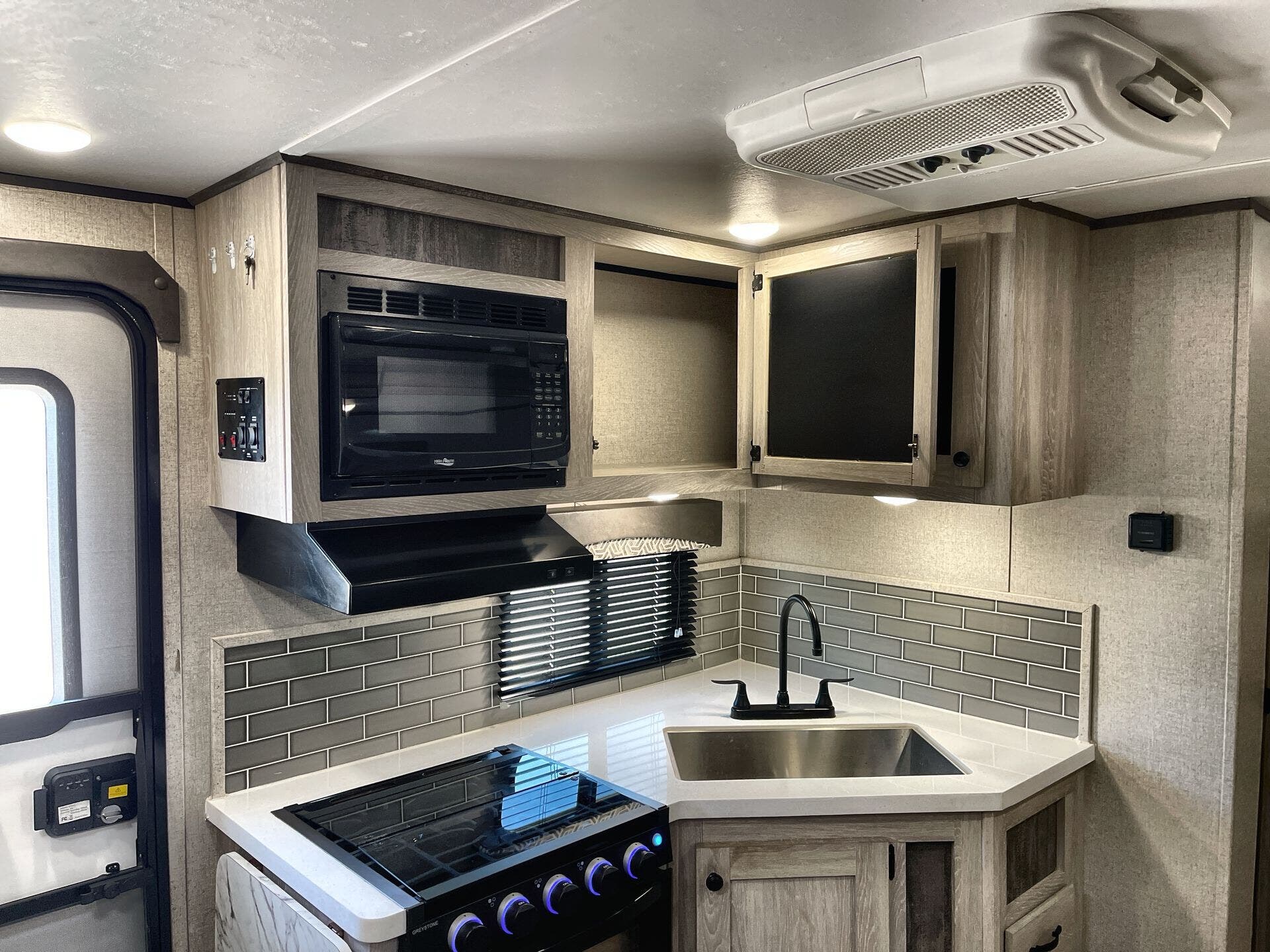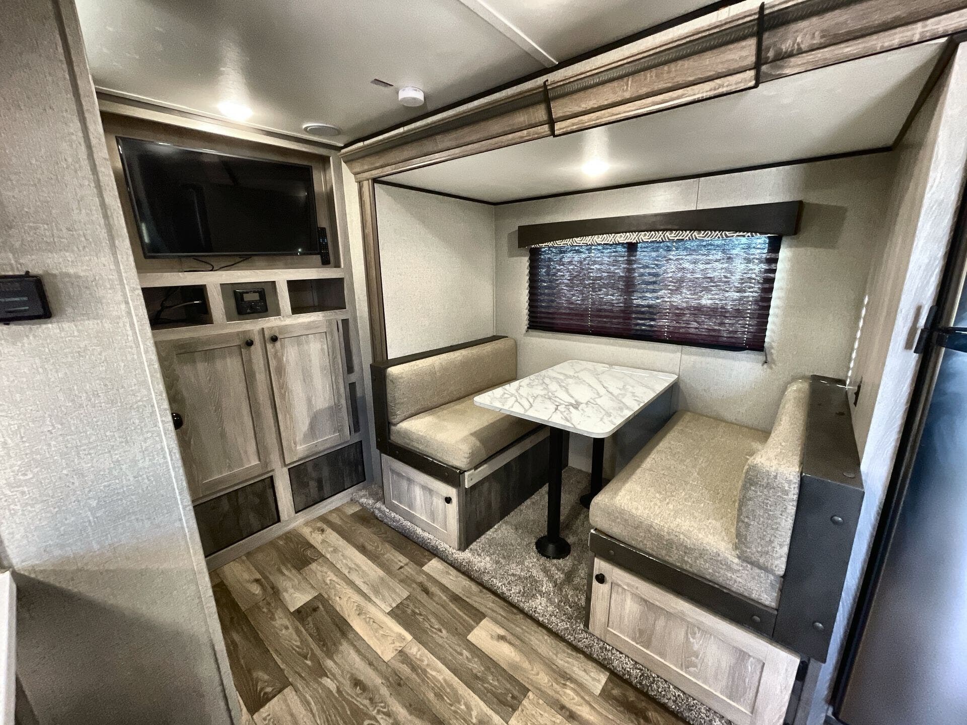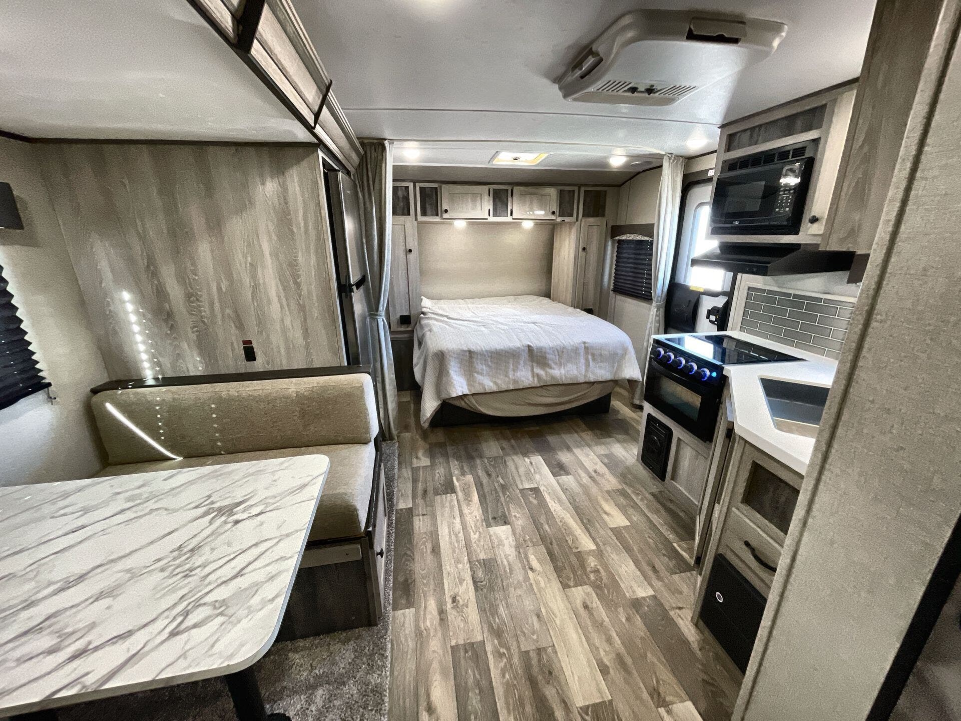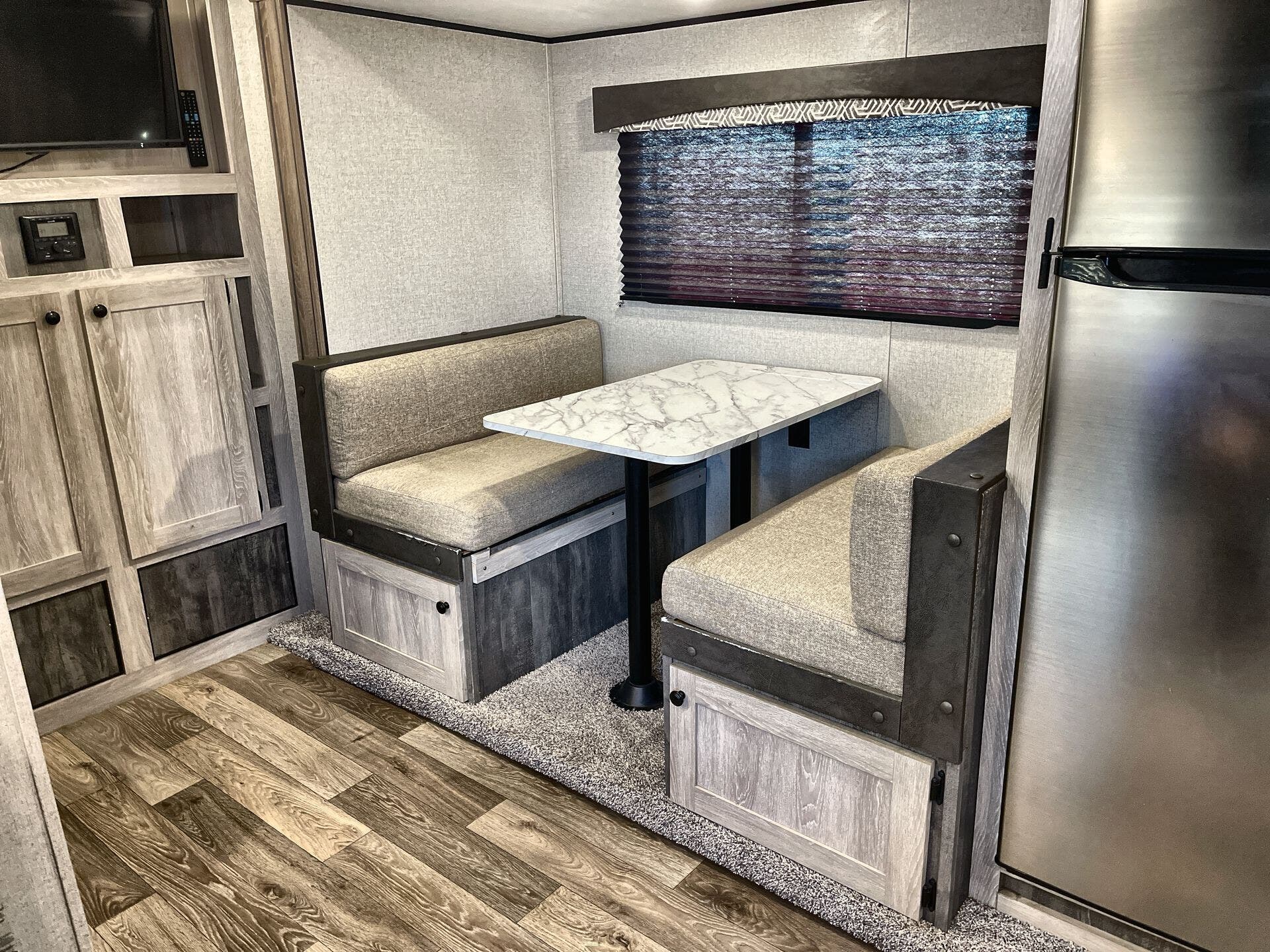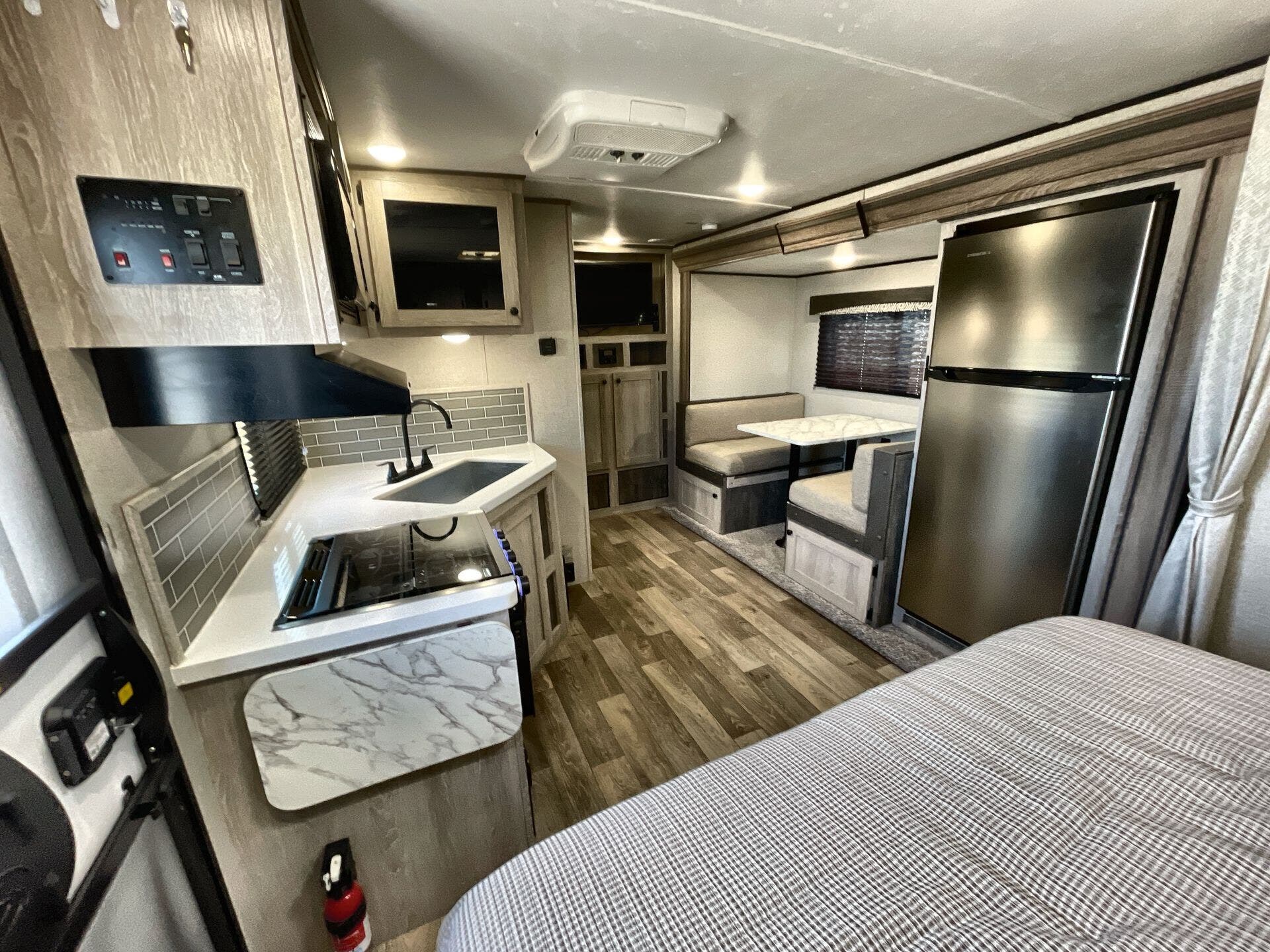 The Riverside Retro focuses on practical comfort and reliable safety for every trip. The combination of a well-equipped kitchen, a comfortable sleeping area, and a rear entertainment zone makes this trailer ideal for couples or small families who want a stylish, affordable RV option that’s easy to tow and easy to enjoy. The single slideout broadens the mid living area, enhancing dining and relaxation space while keeping everything within reach for a warm, home-like campground experience.