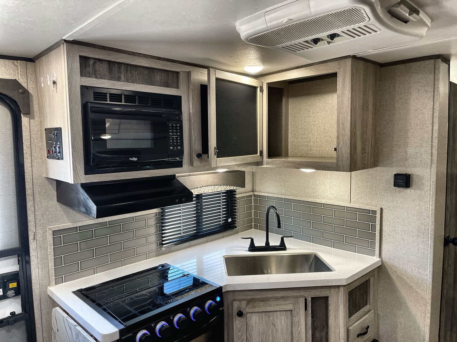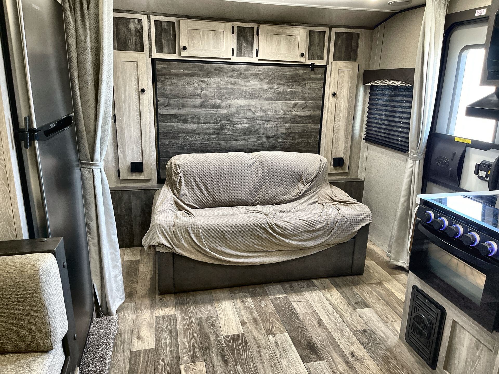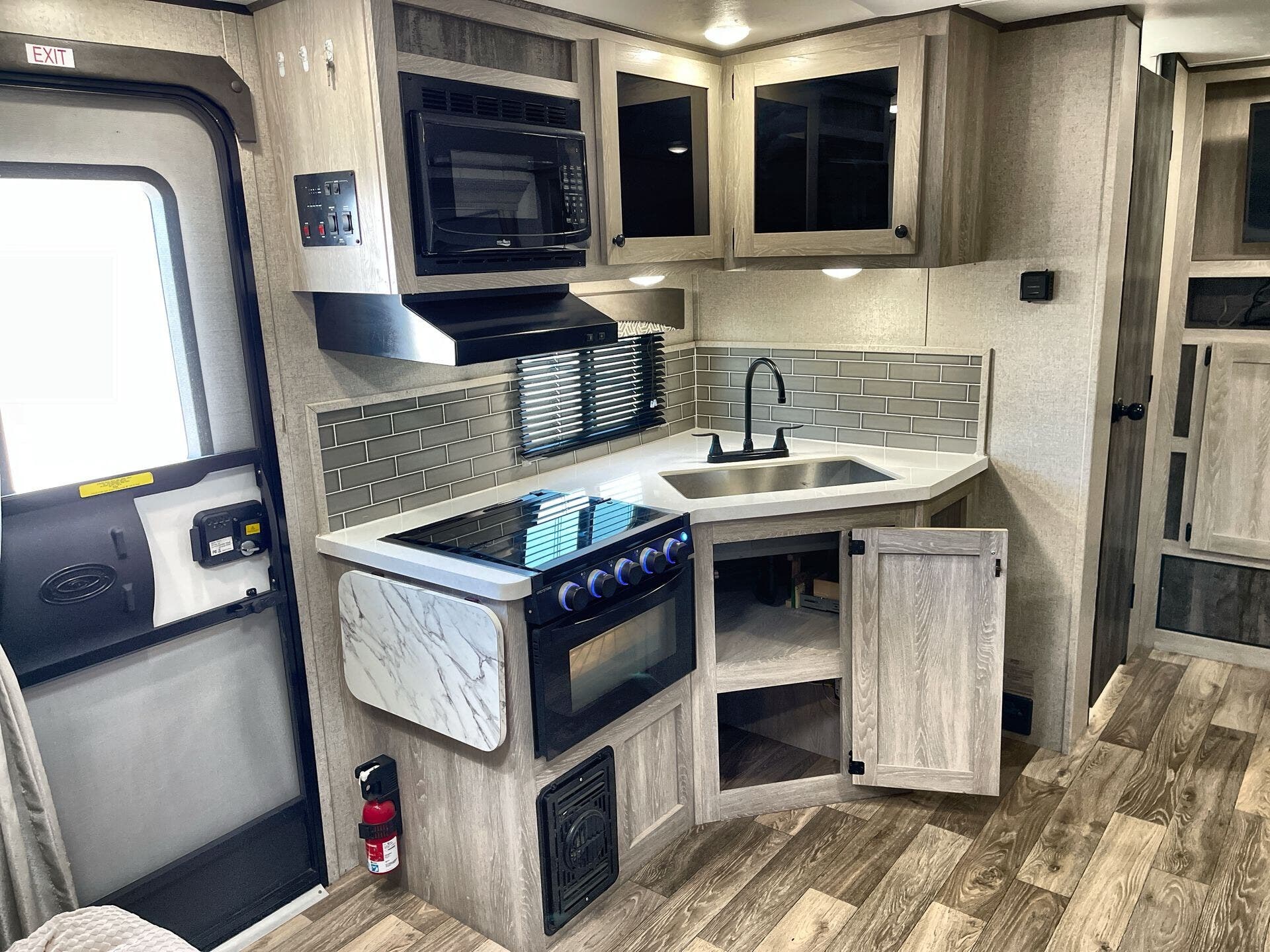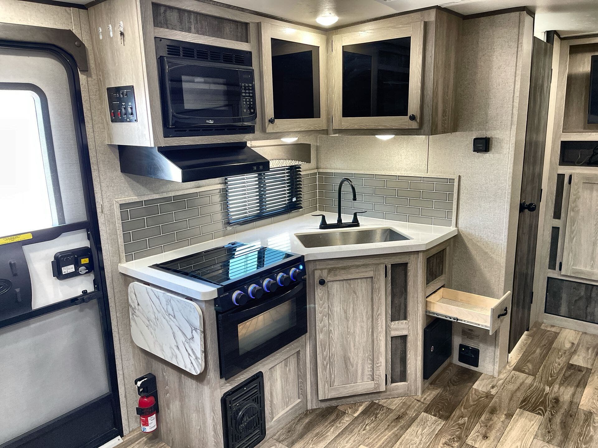 The Riverside Retro focuses on practical comfort and reliable safety for every trip. The combination of a well-equipped kitchen, a comfortable sleeping area, and a rear entertainment zone makes this trailer ideal for couples or small families who want a stylish, affordable RV option that’s easy to tow and easy to enjoy. The single slideout broadens the mid living area, enhancing dining and relaxation space while keeping everything within reach for a warm, home-like campground experience.
