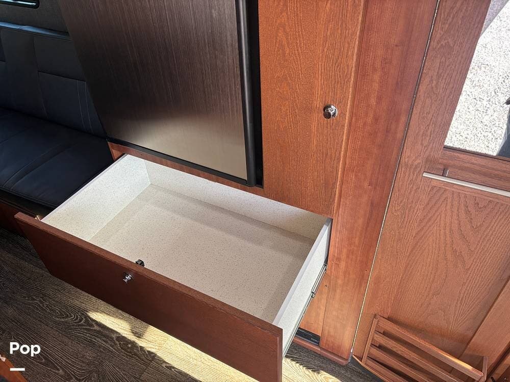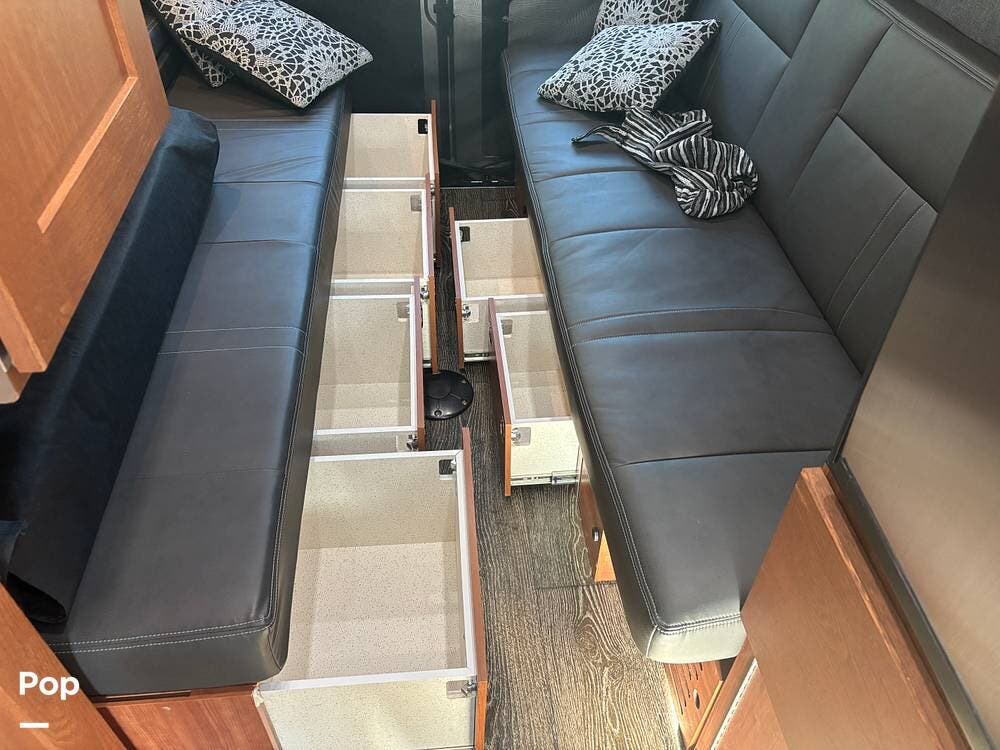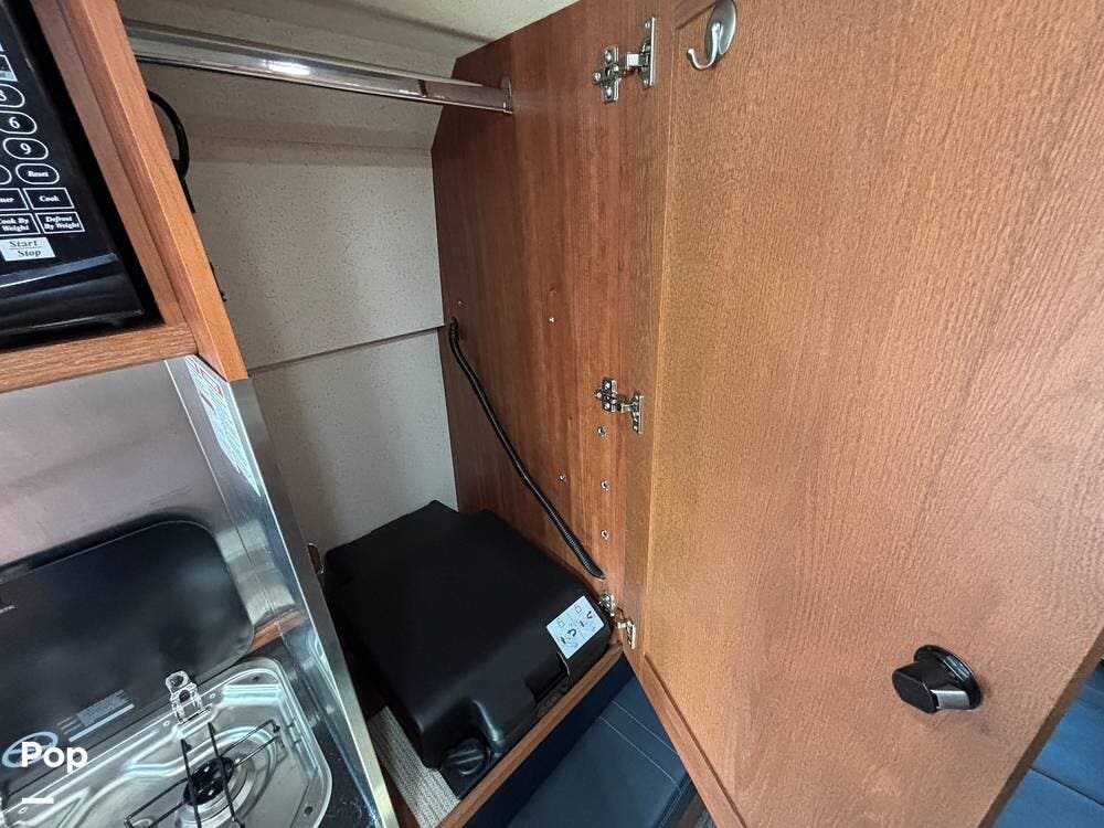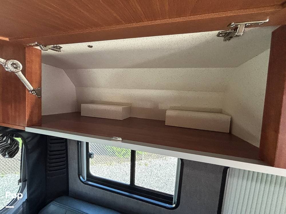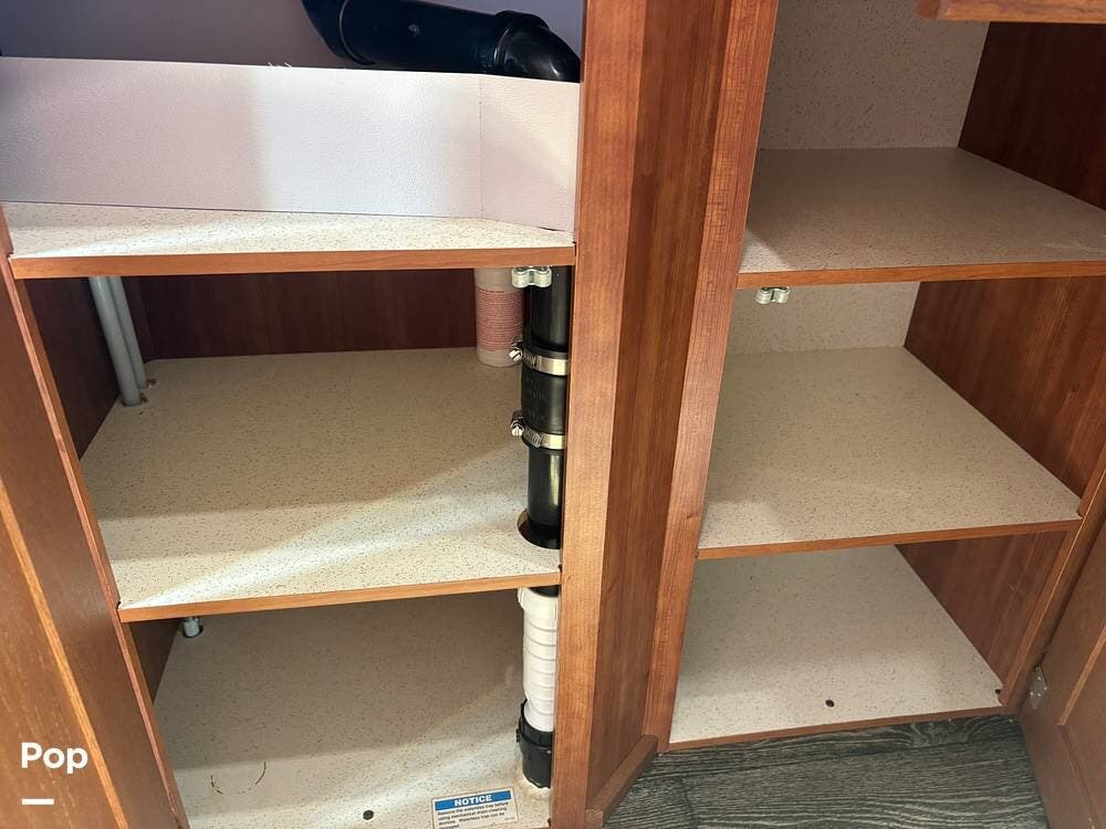 The galley sits mid-coach, equipped with a two-burner propane stove, stainless steel sink, refrigerator, and ample cabinetry. Across the aisle, additional storage and a pull-out pantry provide organization for supplies.