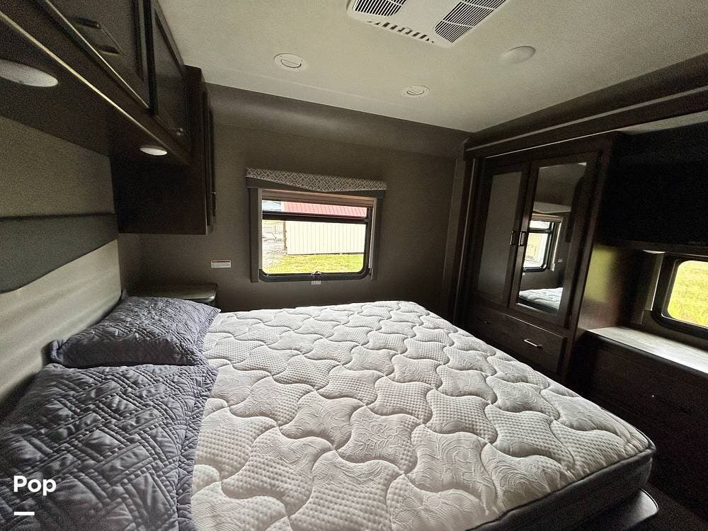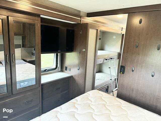 This coach is the epitome of comfort and convenience. Featuring a spacious layout with a full-wall slide, bunk beds, and a master suite.