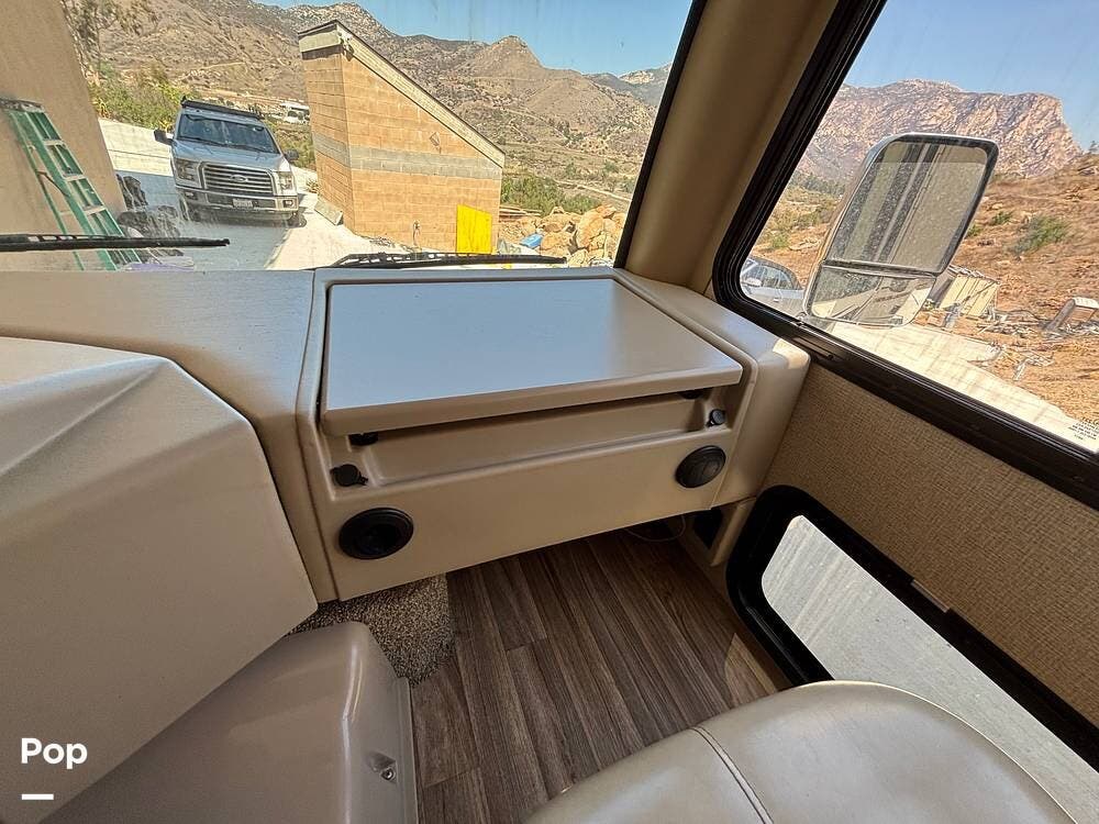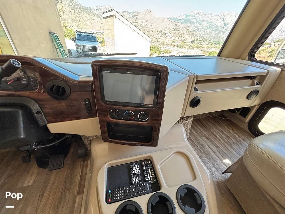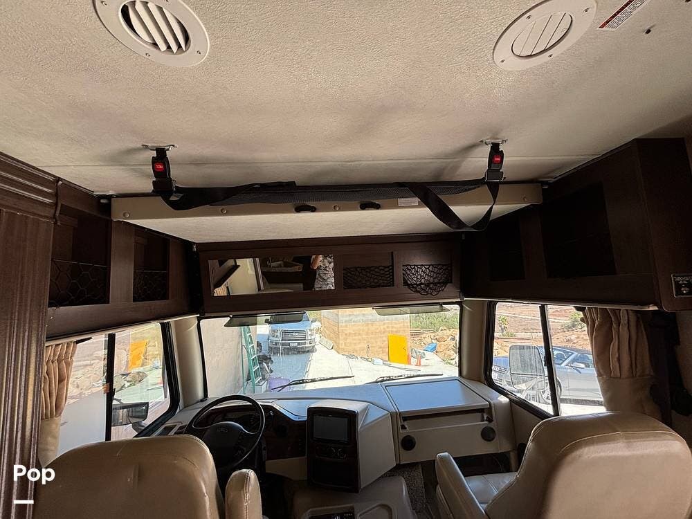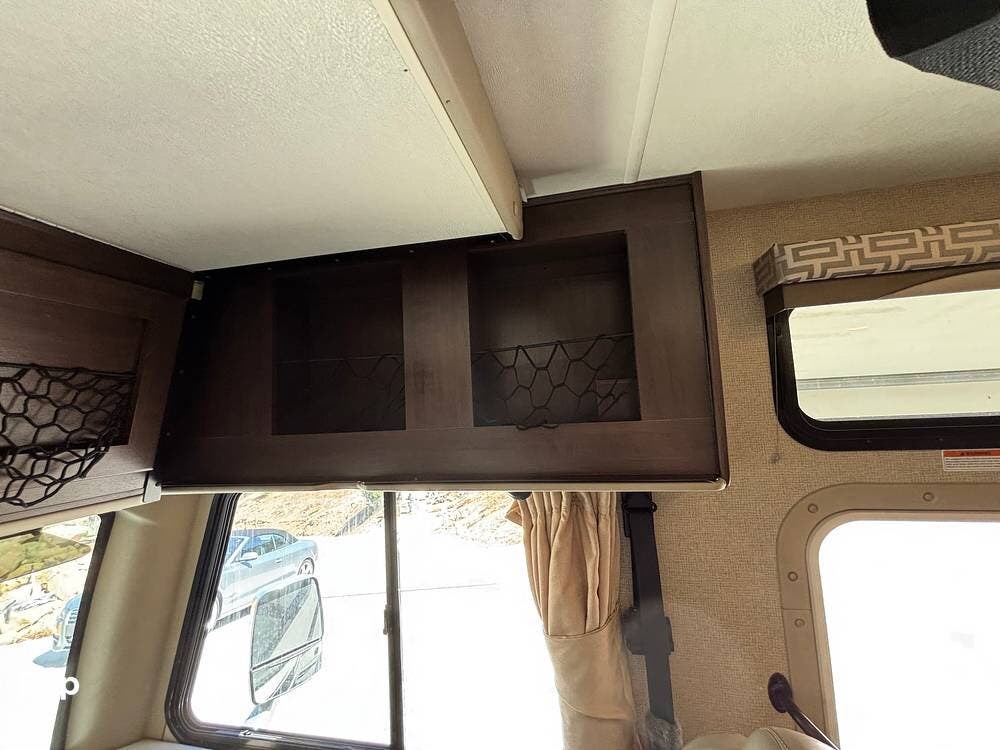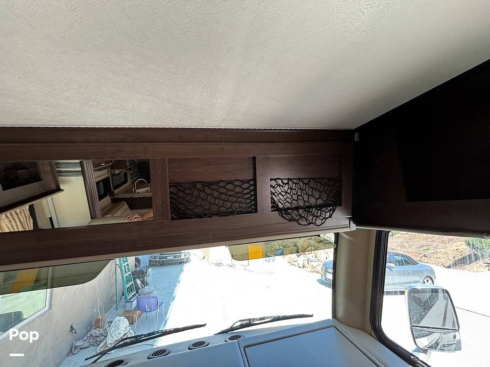 It features a smaller, more manageable windshield compared to a standard Class A, and it incorporates the drop-down bunk feature traditionally found in Class C models.