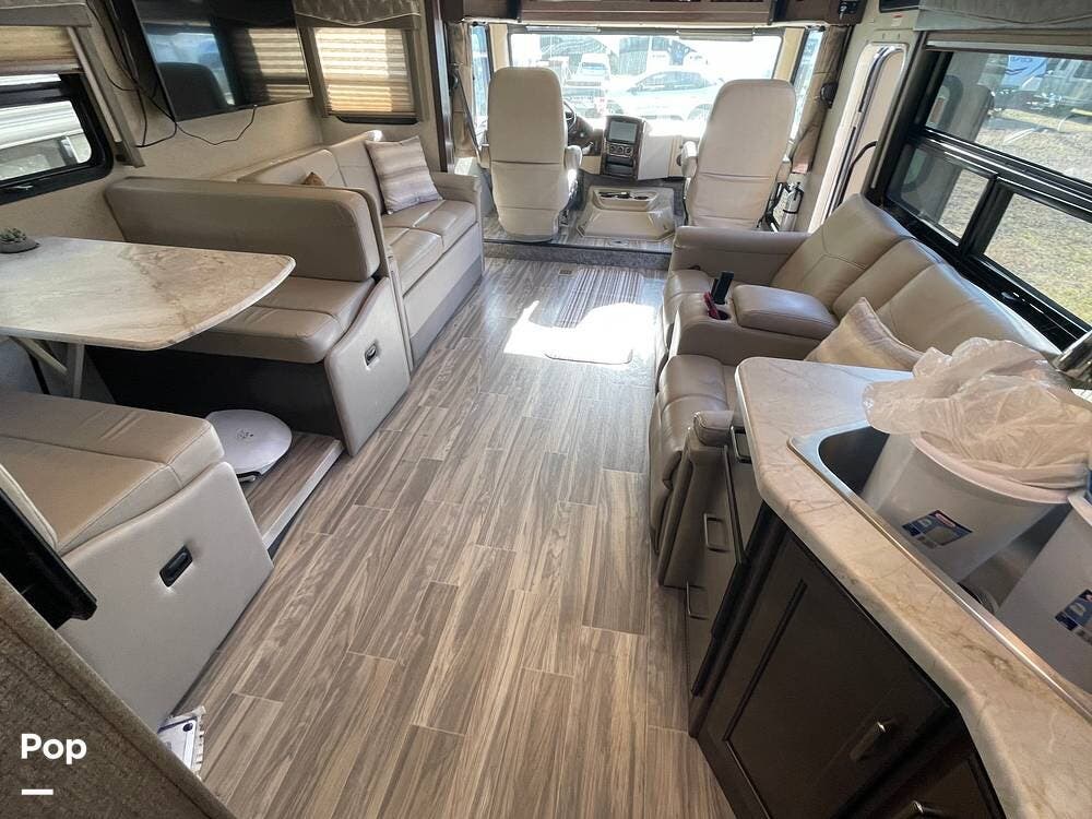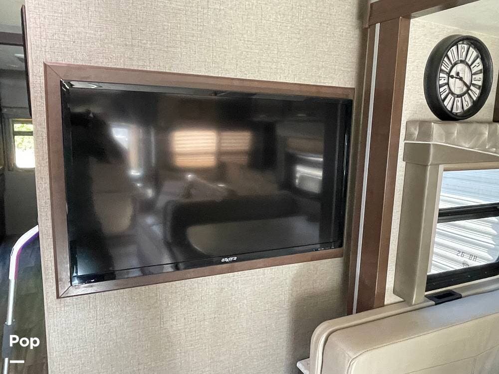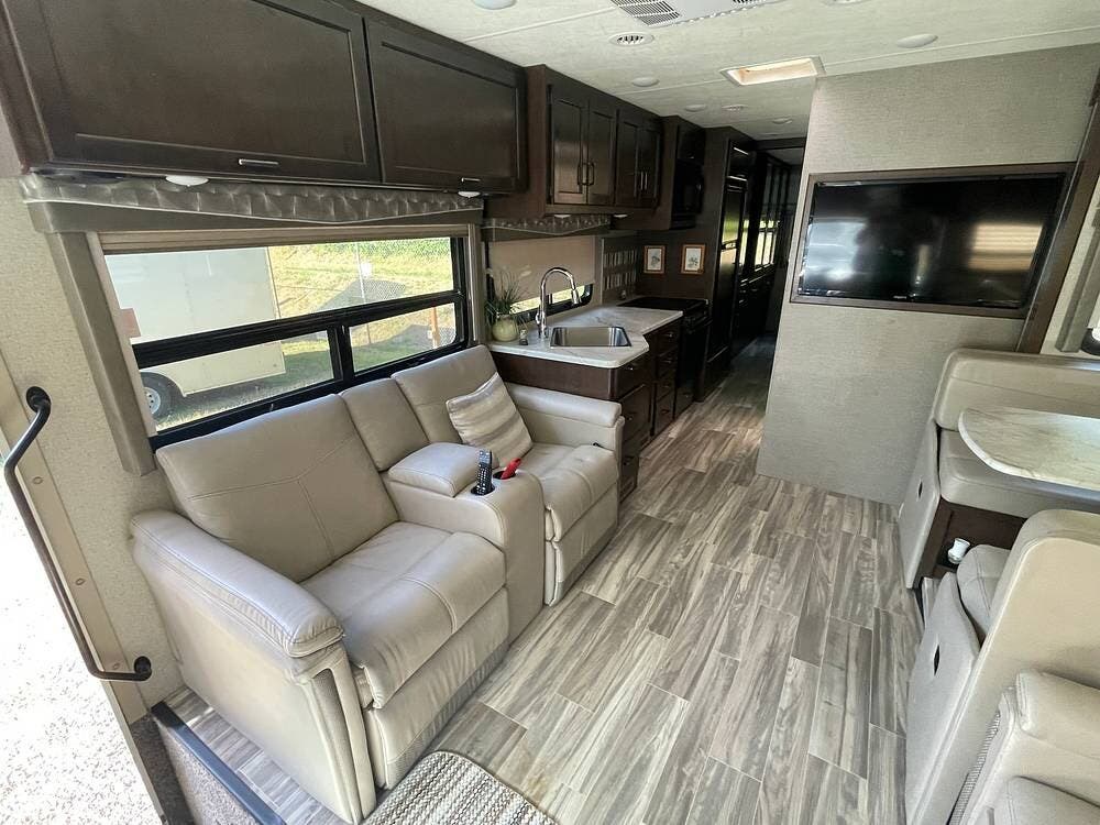 The living area features a sofa-bed, stadium-style recliners, and two TVs. It also features a convertible dinette, as well as a drop-down overhead bunk above the cab, for a total sleeping capacity of seven.