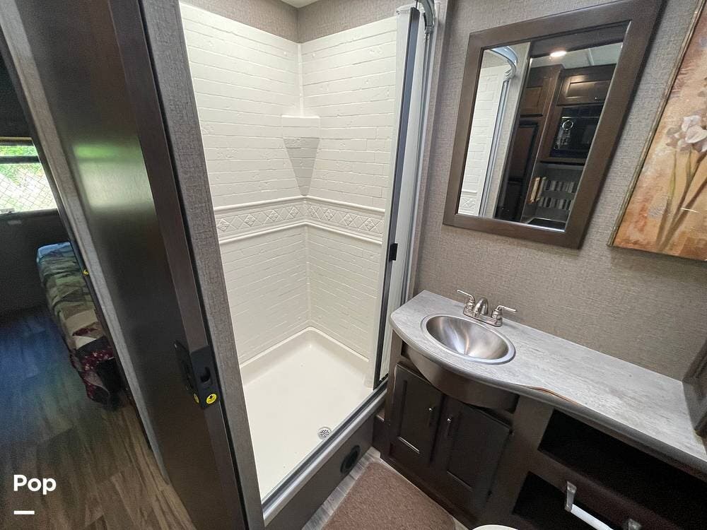 Toward the rear, a walk-through bathroom features a shower, toilet, and vanity with a sink and storage. The bedroom provides a king-size bed, wardrobe storage, and a 32" TV. The full-wall slide helps to create a relatively open feel in the bedroom when extended.