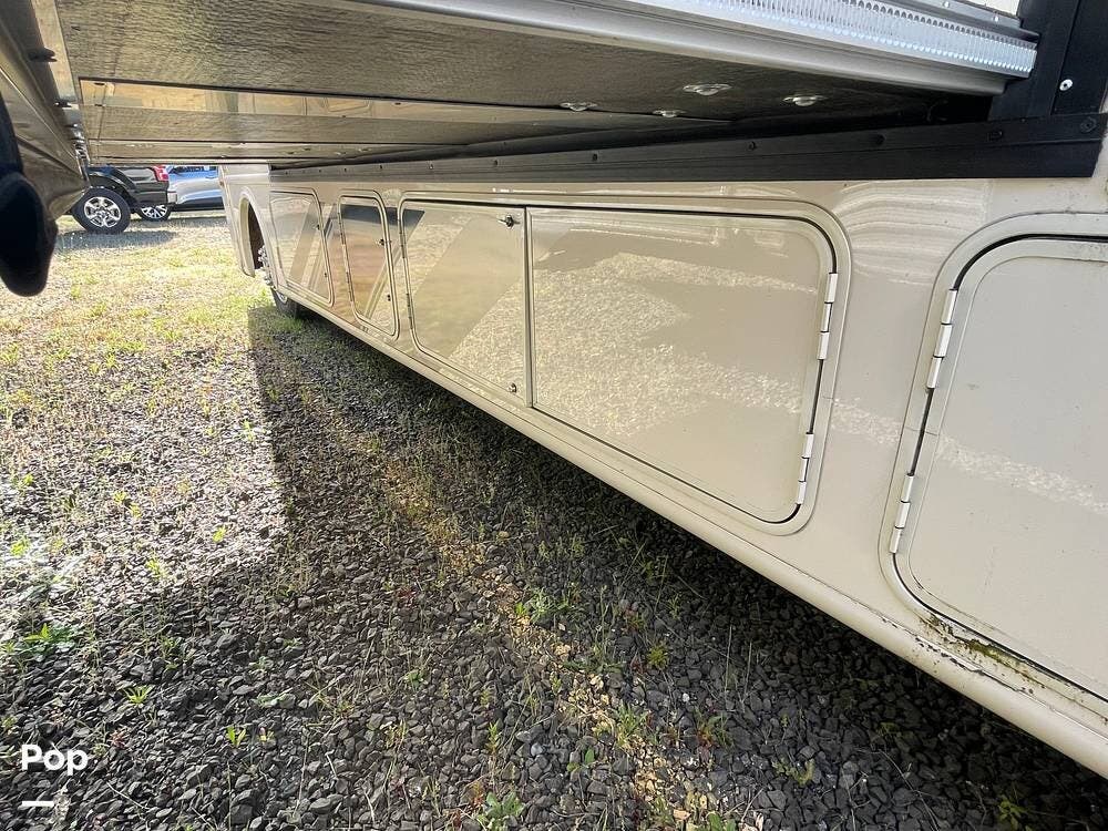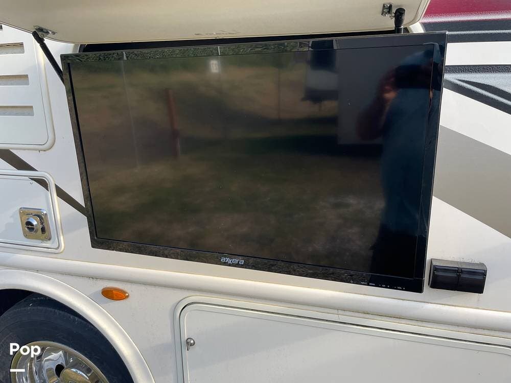 Other standard features include a 50-amp electrical service, dual roof A/C units, an onboard generator, leveling jacks, a rearview and side camera system, and a power patio awning with LED lighting. The exterior features pass-through storage compartments and an outdoor entertainment setup, complete with a TV.