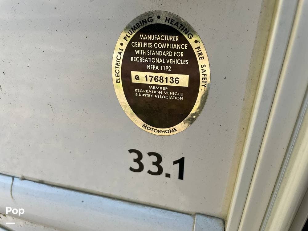 The 33.1 model is built on a Ford F-53 chassis and powered by a 6.8L Triton V10 engine. It measures approximately 34 feet in length and includes two slide-outs on the driver's side that increase interior space in both the living and bedroom areas.