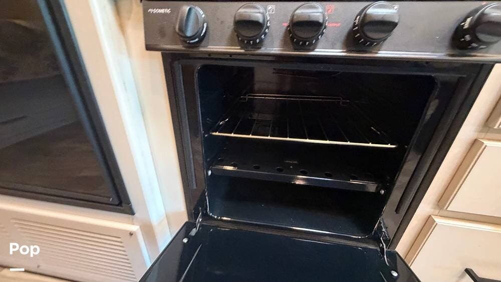 The kitchen features a compact refrigerator/freezer, a residential-style oven, a covered stovetop range, a microwave, pantry cabinetry, and a booth dinette.
