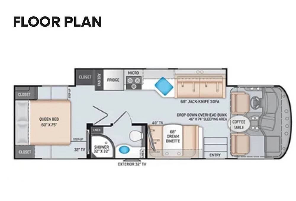 The sleeping arrangement includes a master bedroom with a queen bed, a cabover dropdown bed, and a convertible jackknife sofa, accommodating up to 6 adults.