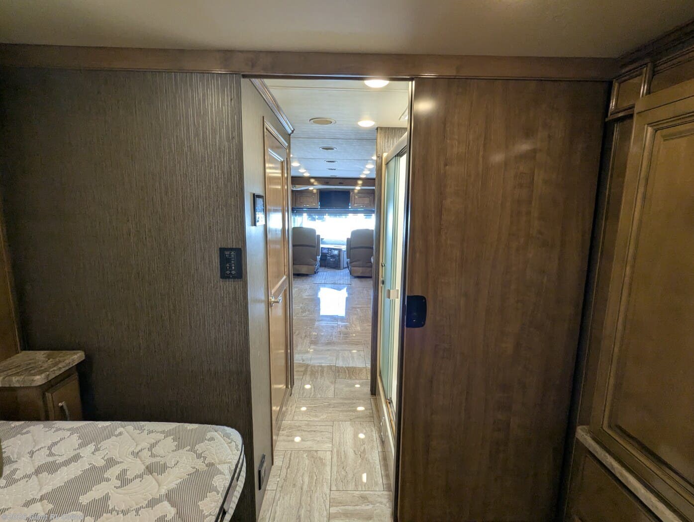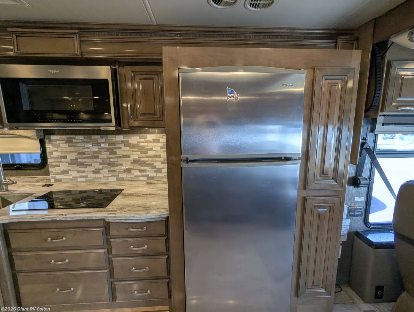 - Modern Amenities and Durability: Features dual 15K BTU A/C units, residential 16 cu ft refrigerator, electric induction cooktop, convection microwave, tankless water heater, electric fireplace, 8 KW Onan diesel generator, Freightliner XC-R chassis with Cummins ISB 6.7L 360 HP engine, VacuBond laminated walls, one-piece fiberglass roof, and 20' power awning for reliable all-season adventures.