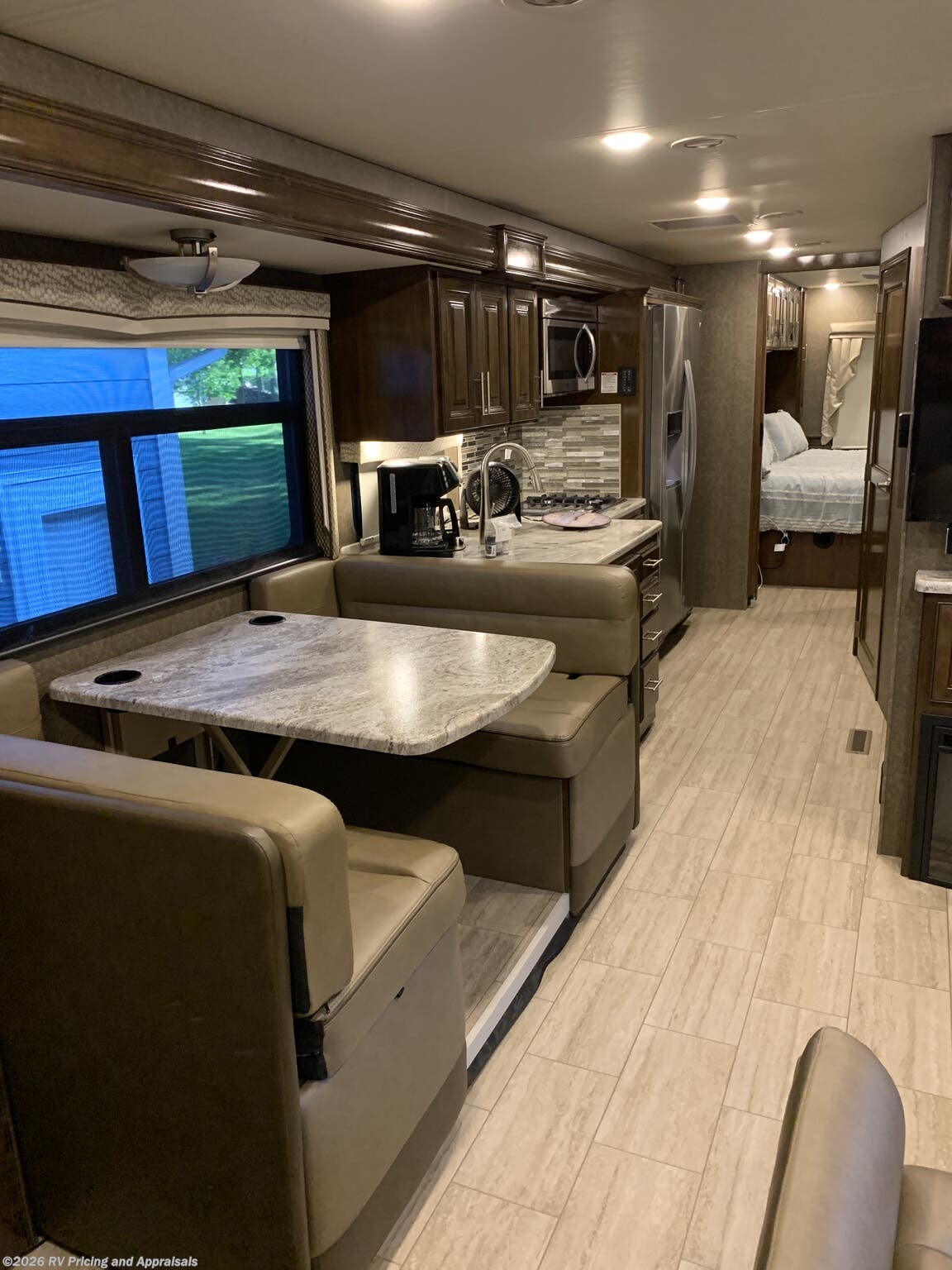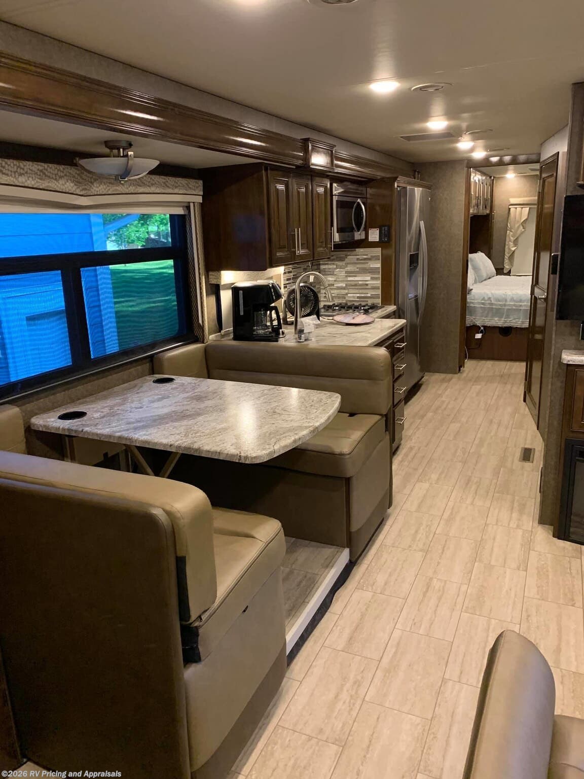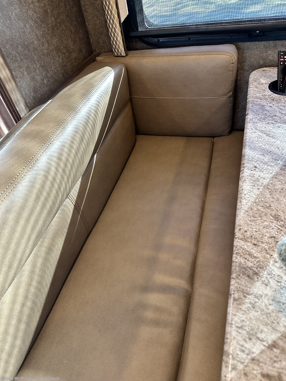 Designed for adventure seekers, this 2020 model boasts a sleek appearance and modern amenities, offering spacious interiors that cater to families and travelers alike. With a full wall slide and three total slide-outs, the motorhome sleeps up to 6 people comfortably. Key features include a Tilt-A-View Inclining King Bed, a Power Drop-Down Overhead Bunk, Dream Dinette that converts to a bed, and a residential refrigerator/freezer equipped with water/ice maker. The kitchen is a chef's dream, featuring solid surface countertops, stainless steel appliances, double sink with high top faucet, and a 3 burner/induction cooktop with a convection microwave.