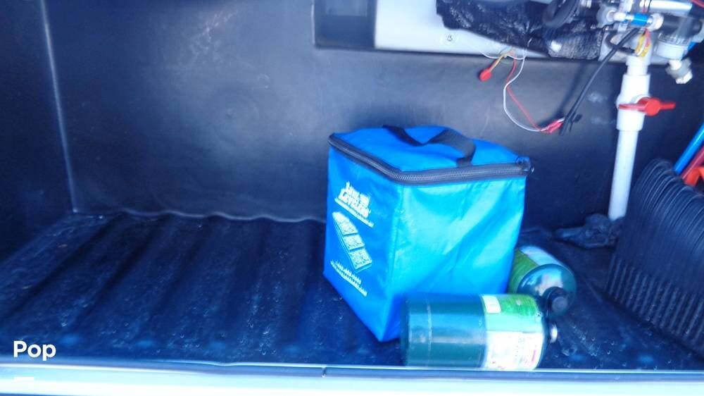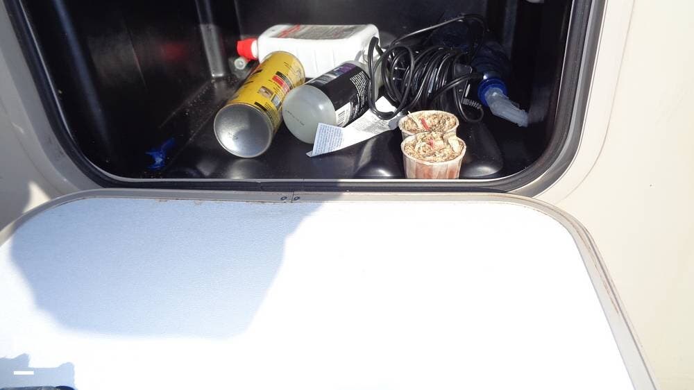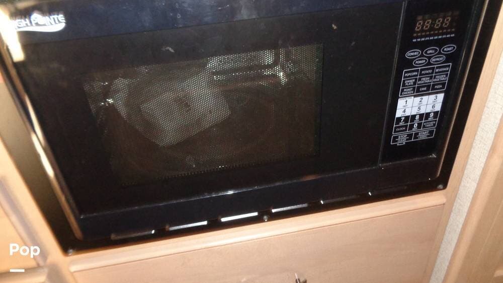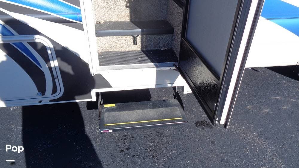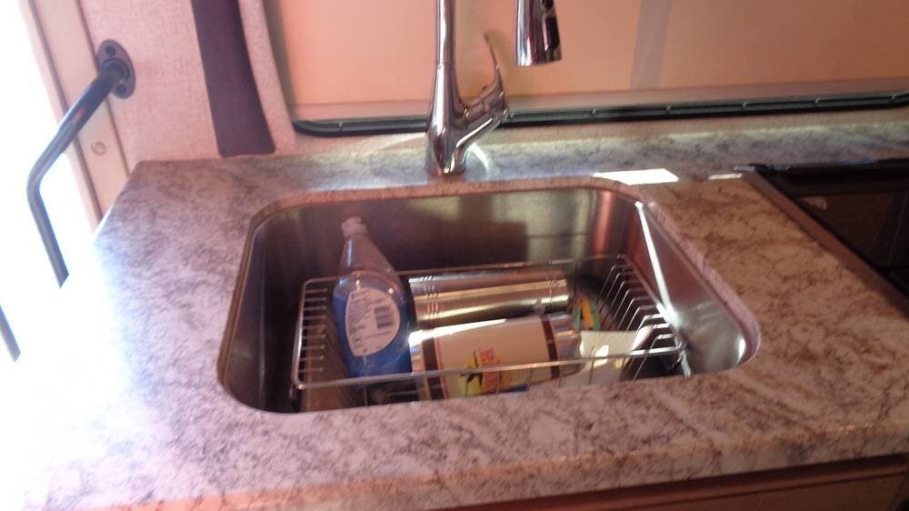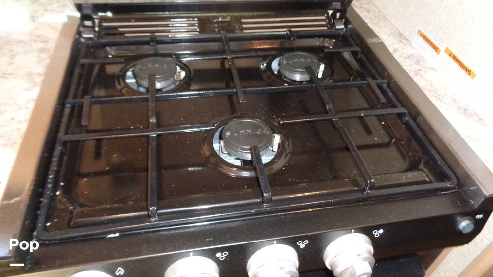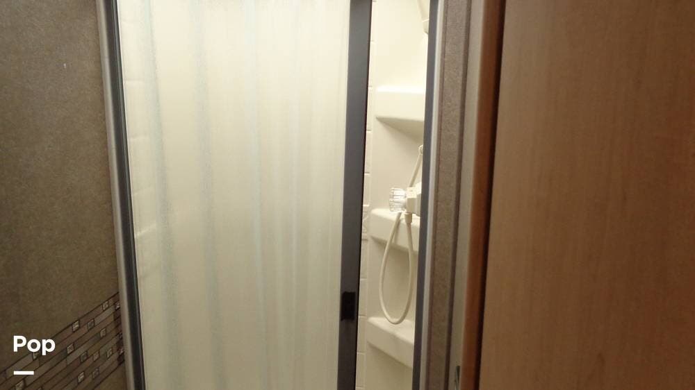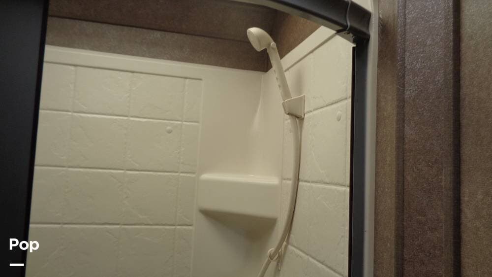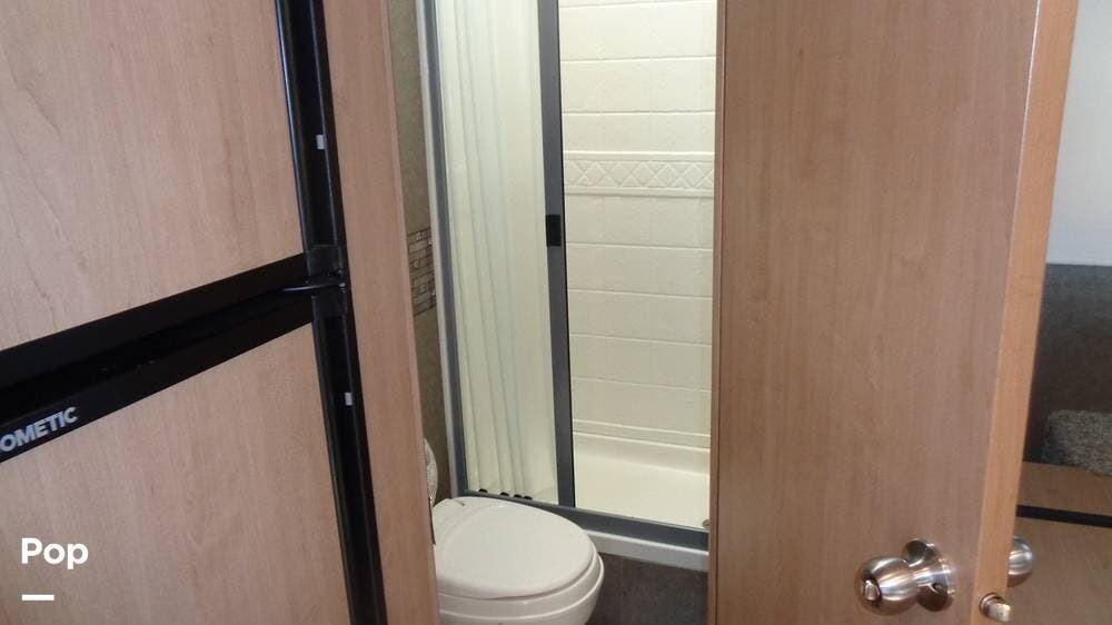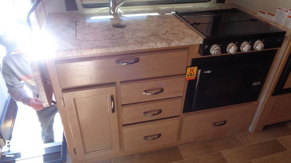 You will find a 24" x 32" shower in the bathroom with a curved anti-microbial shower curtain. Outside, you will find a 16' power awning with LED lights for a fabulous evening outdoors. The kitchen houses a fridge/freezer, stove, and microwave.