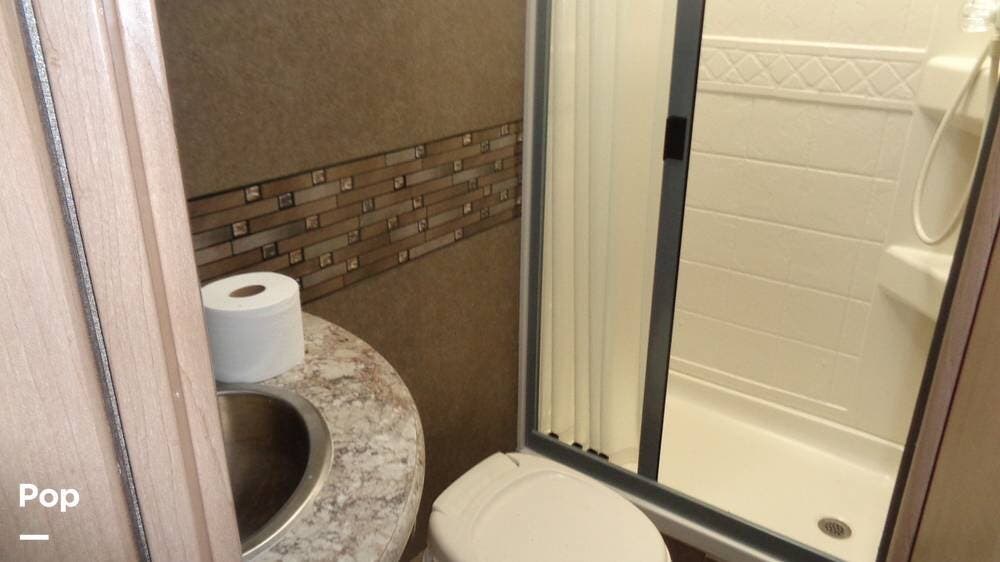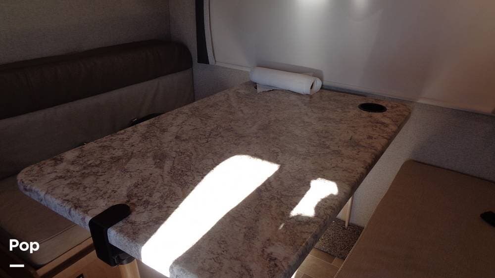 Inside is plenty of space and style with the residential vinyl floor, laminate countertops, and swivel leatherette captain's chairs. The Onan 3.6kW LP generator (115 hours) and the instant tankless water heater also make it easy to camp in any outdoor conditions.