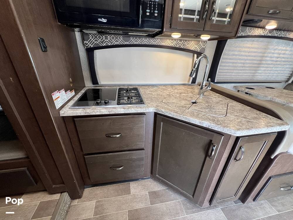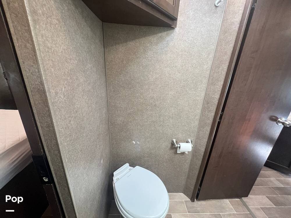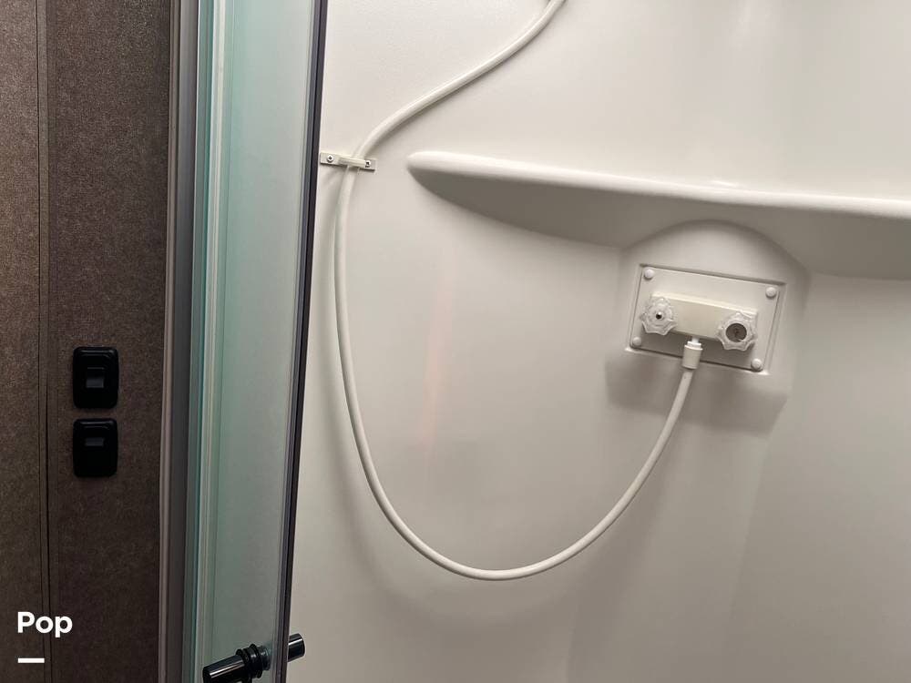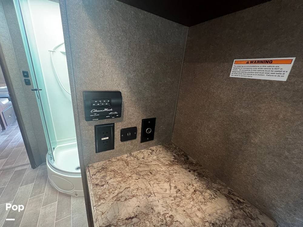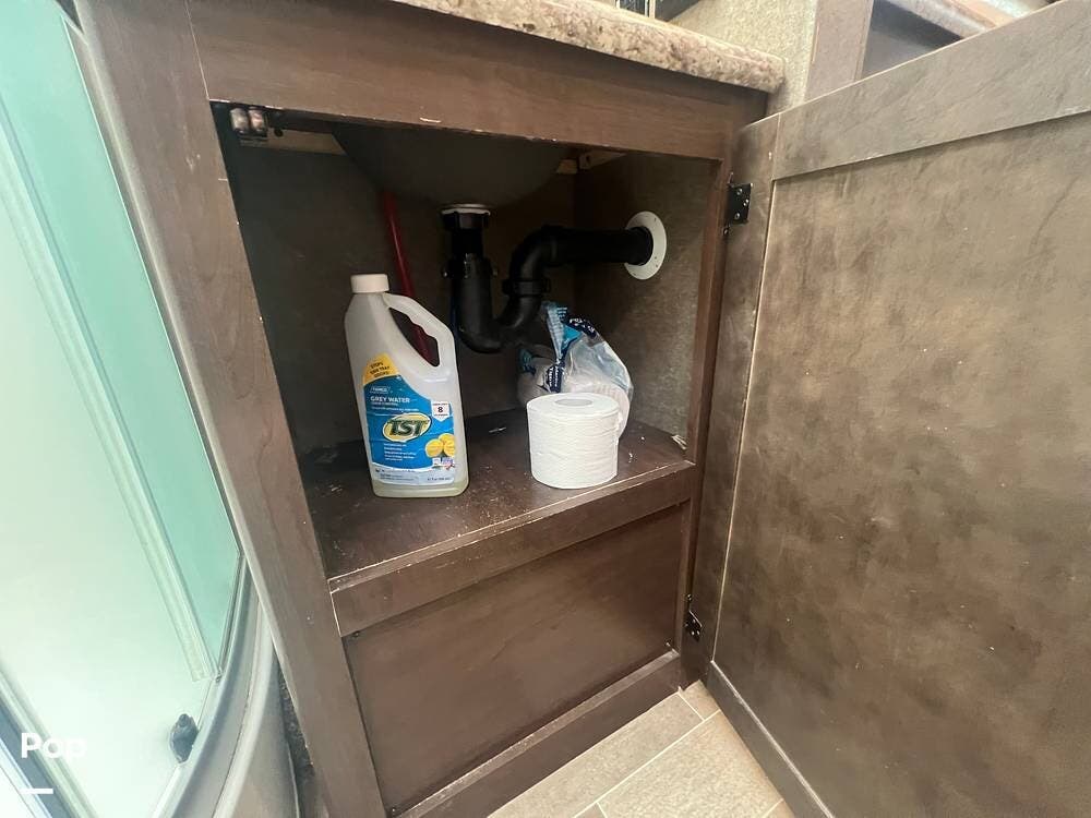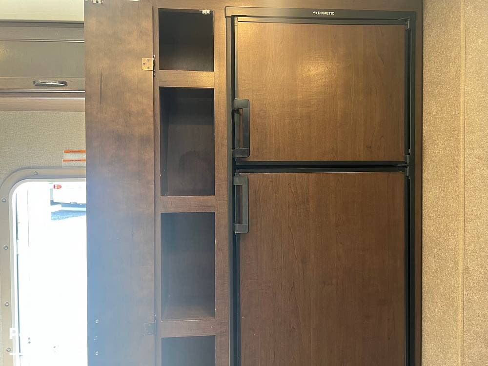 The kitchen comes fully equipped with a stove, oven, microwave, and a dual-door refrigerator -- perfect for preparing meals on the go. The split bathroom setup allows for more flexibility when traveling with others, and there's generous storage throughout for all your gear.