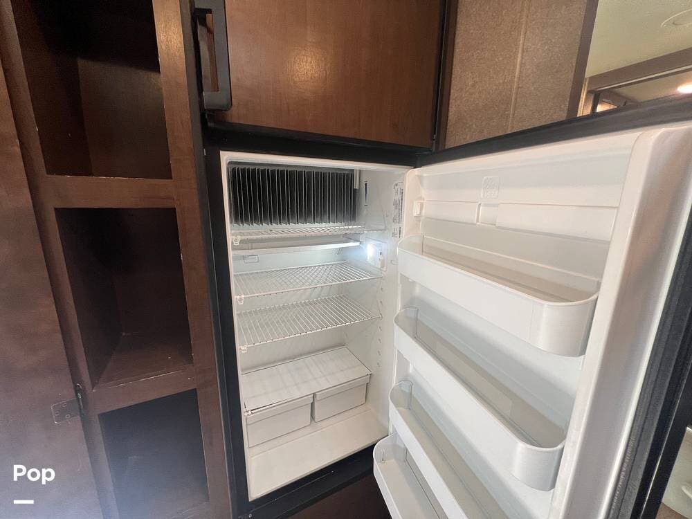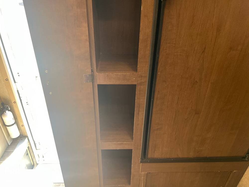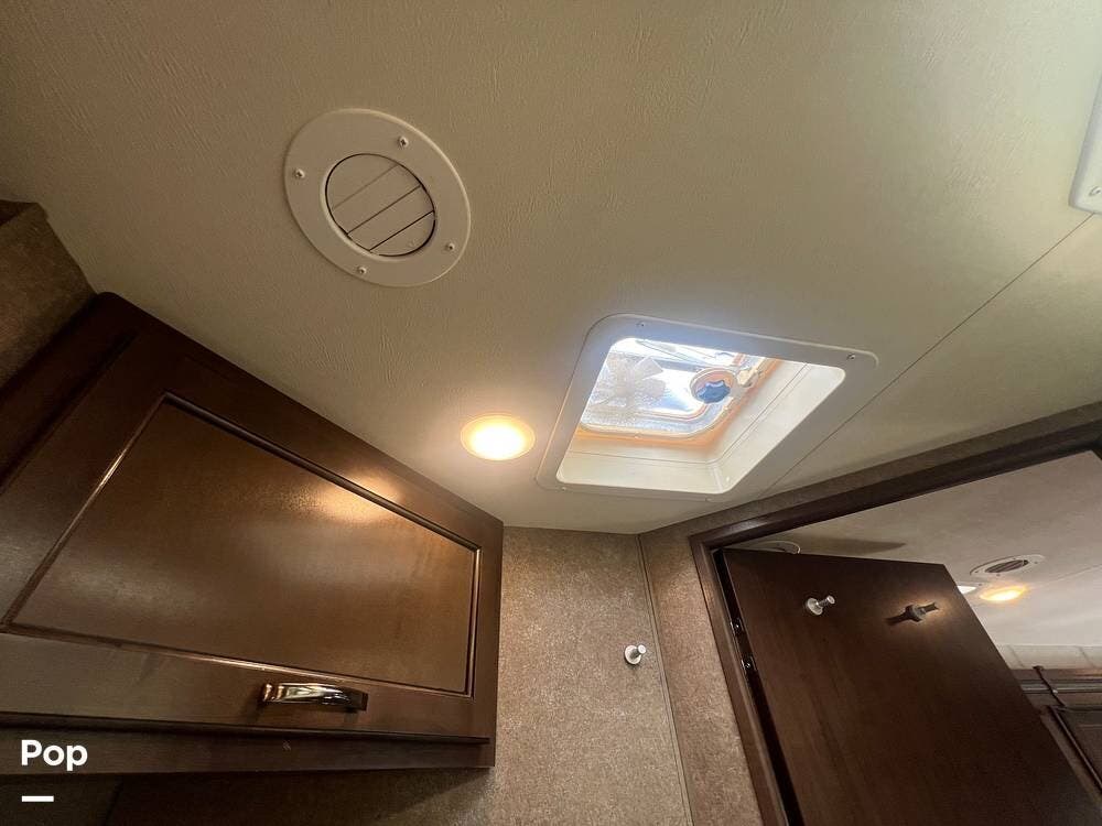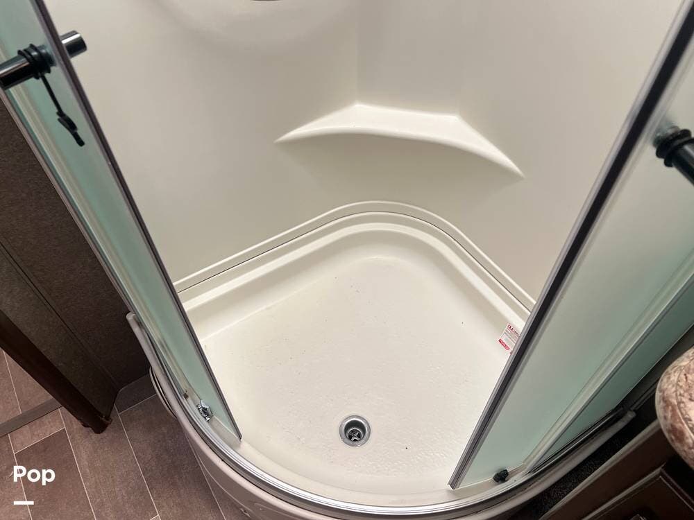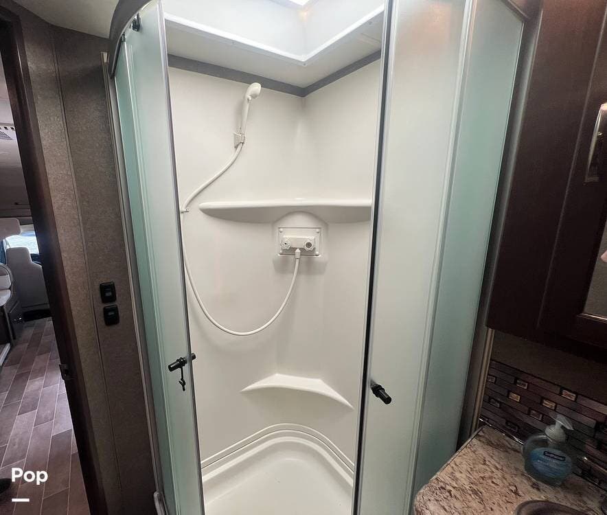 The kitchen comes fully equipped with a stove, oven, microwave, and a dual-door refrigerator -- perfect for preparing meals on the go. The split bathroom setup allows for more flexibility when traveling with others, and there's generous storage throughout for all your gear.