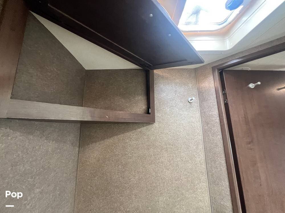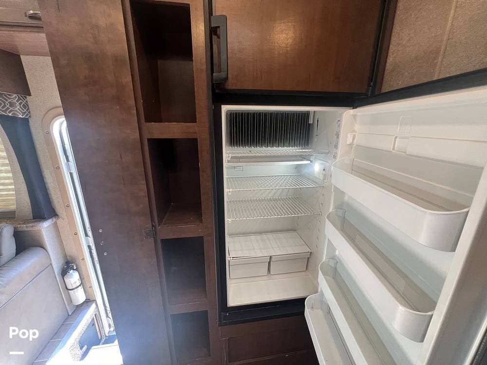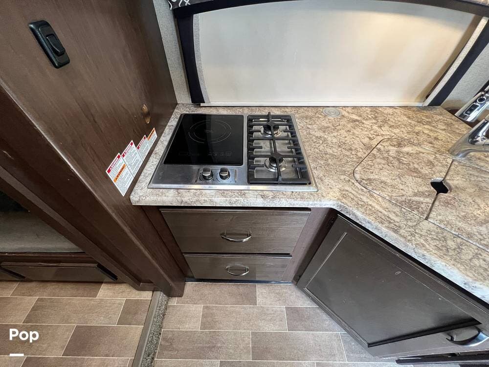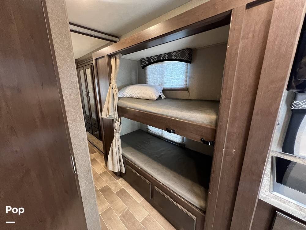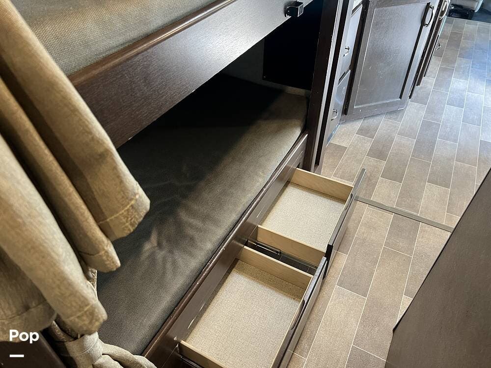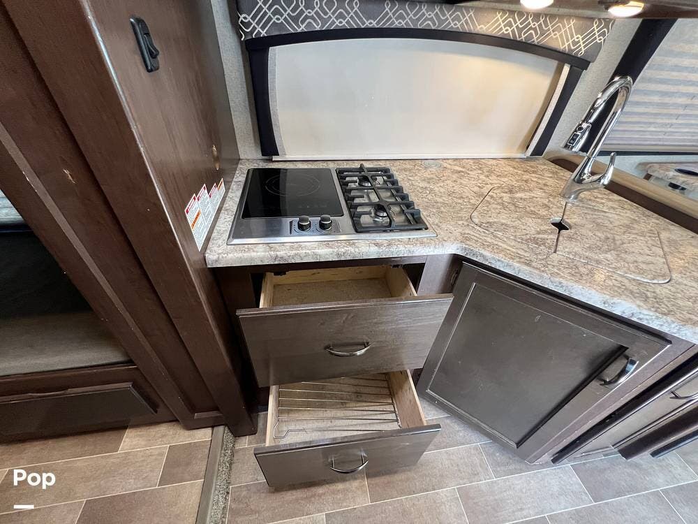 The kitchen comes fully equipped with a stove, oven, microwave, and a dual-door refrigerator -- perfect for preparing meals on the go. The split bathroom setup allows for more flexibility when traveling with others, and there's generous storage throughout for all your gear.