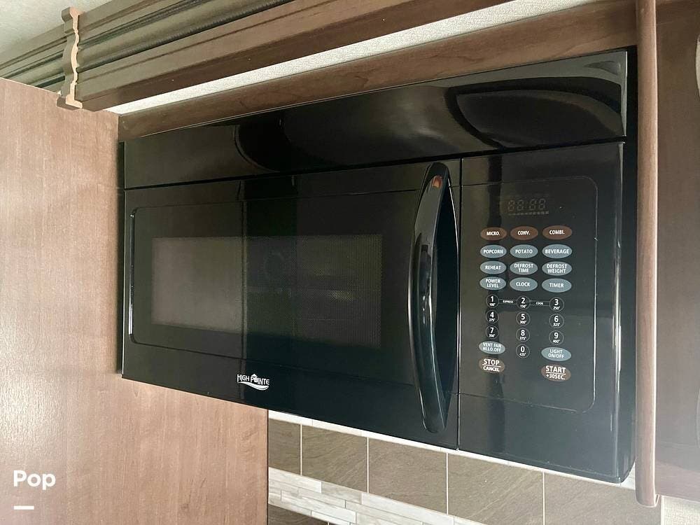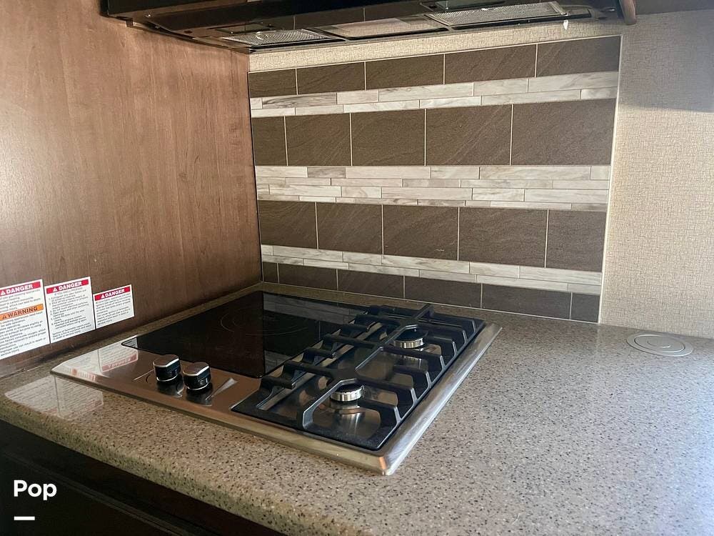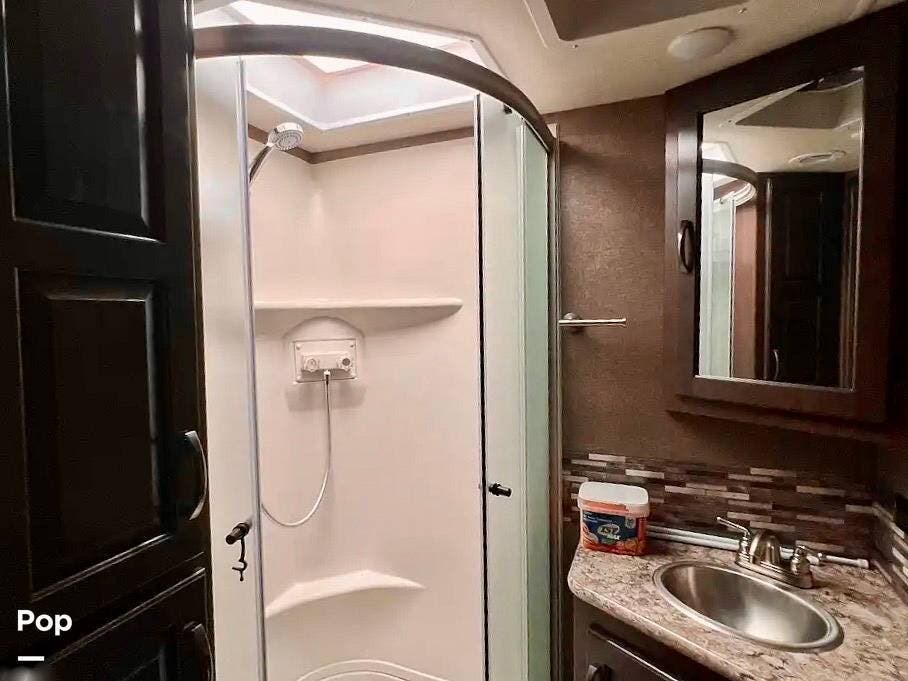 A spacious slide-out living area creates an open, inviting space with a dinette sleeper and reclining Theater Seating. The premium queen-size bed ensures restful nights, while the fully-equipped kitchen with residential appliances makes preparing meals on the road effortless.