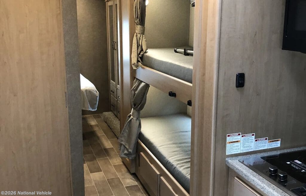 Bring the whole family with you in this motorhome! The grandkids can sleep on the set of 27" x 72" bunk beds, and you can sleep on the 60" x 75" queen bed in the rear private bedroom which also has a closet and dresser for your clothes and a TV for entertainment. Plus, you can access the dual entry bathroom directly from the bedroom or the hallway next to the bunk beds. Relax in true comfort on the 68" jackknife sofa while you watch a movie on the 40" TV or play a few card games at the 71" Dream Dinette. There is also a 52" x 96" bunk over cab for even more sleeping space!
