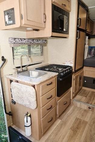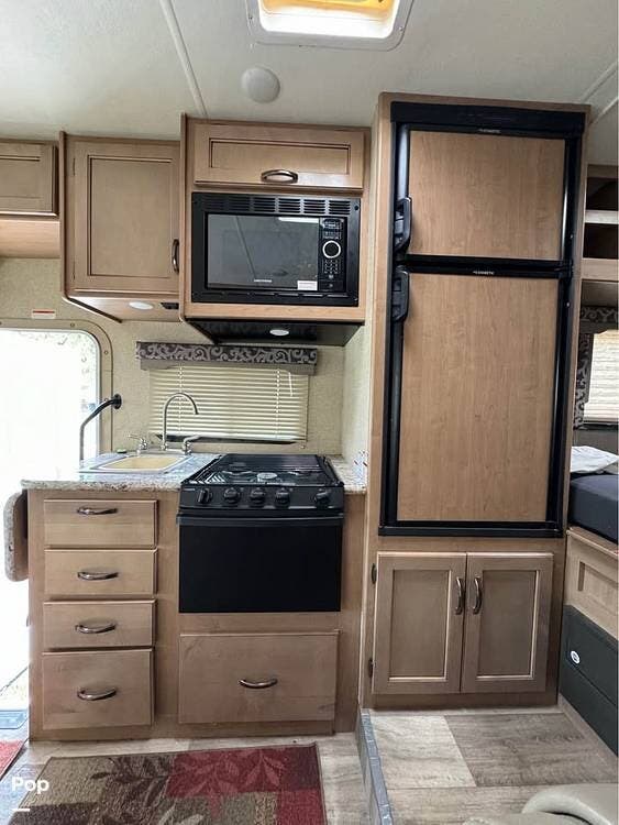 The fully equipped kitchen features a sink and a flip-up counter extension to the side. A 3-burner stove, oven, microwave, and a refrigerator/freezer.