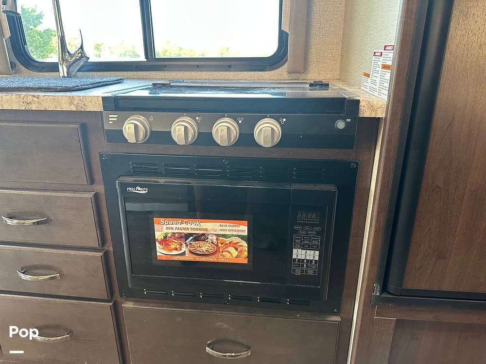 There is a cooktop that appears unused. Below it is the convection microwave. This unit features a refrigerator that operates on either electricity or propane.