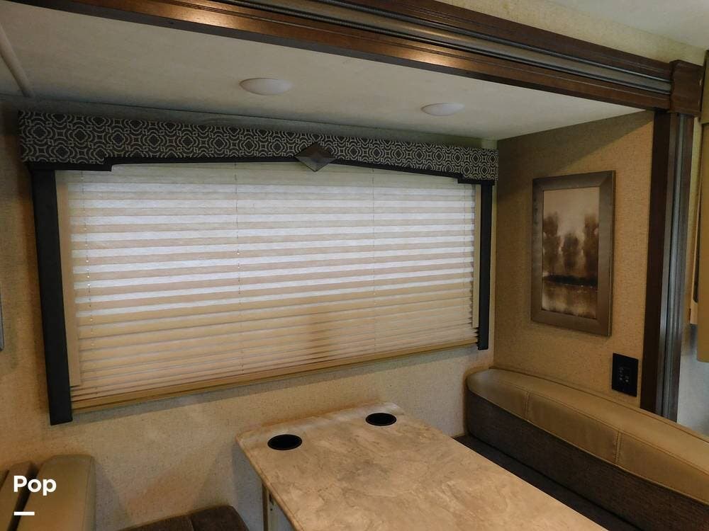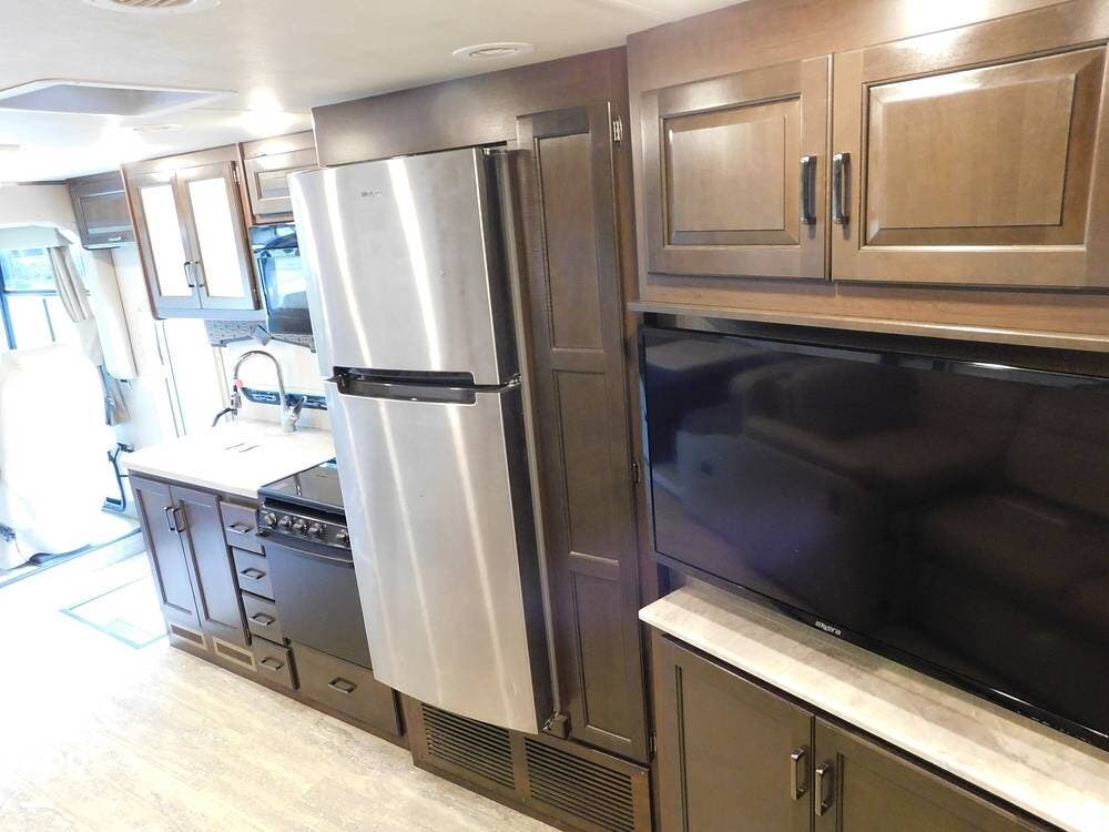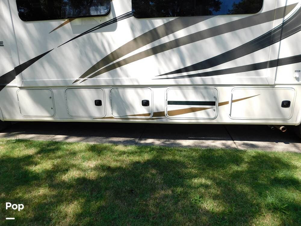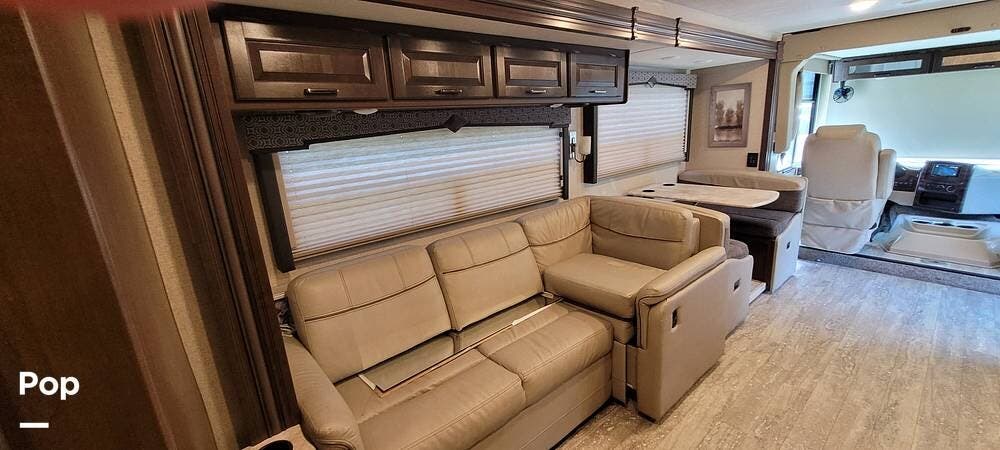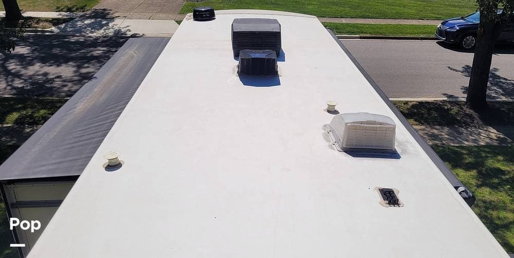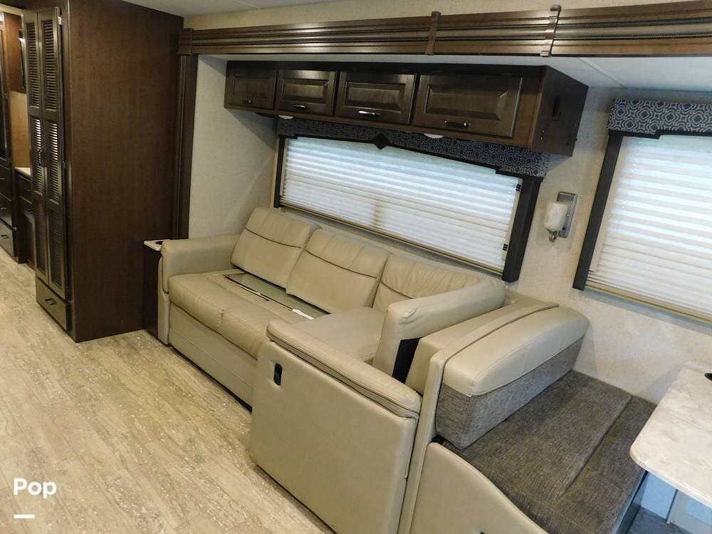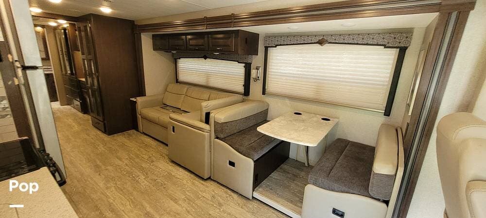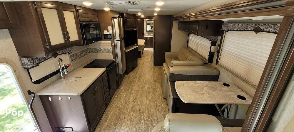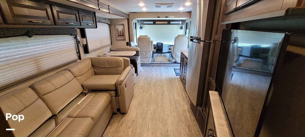 This motorhome measures approximately 36 feet in length, offering a spacious interior with two slide-outs that expand the living area and bedroom, enhancing the overall sense of space.