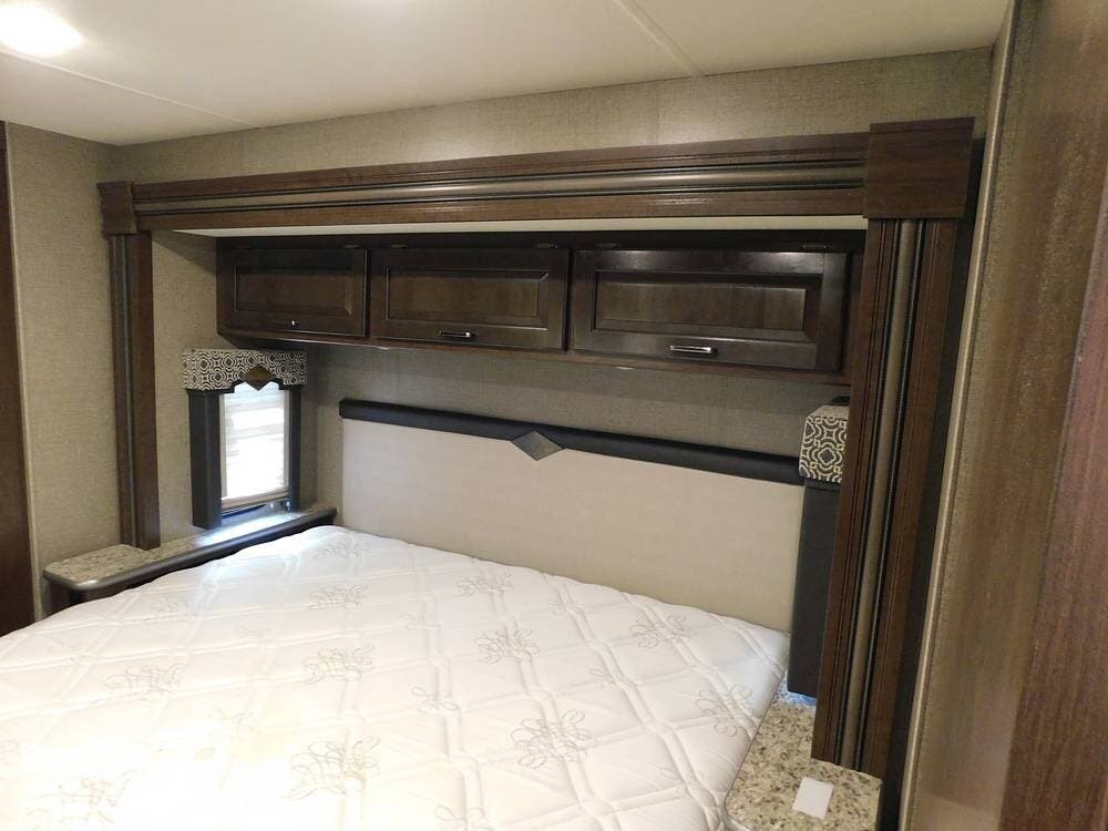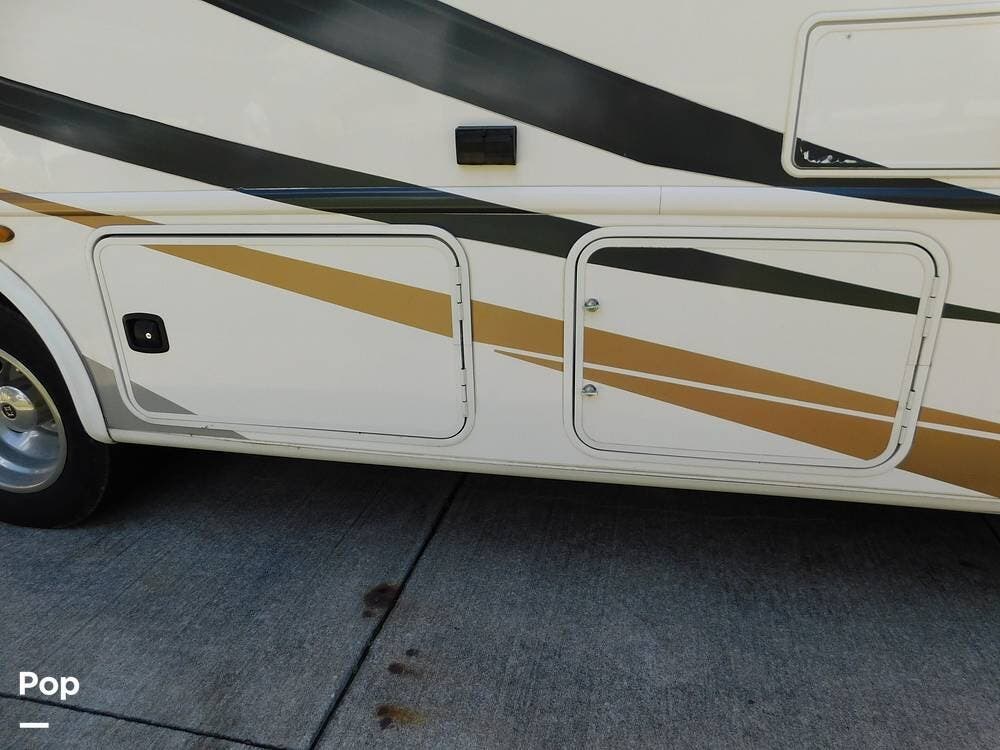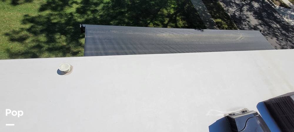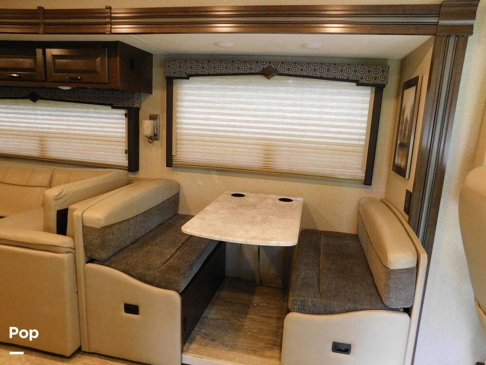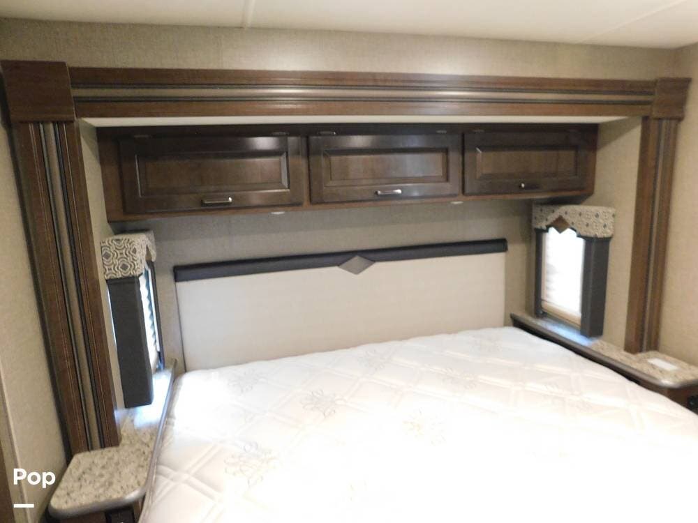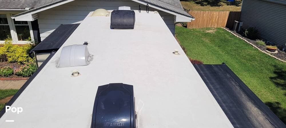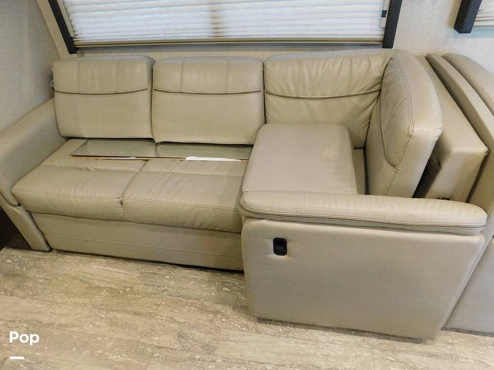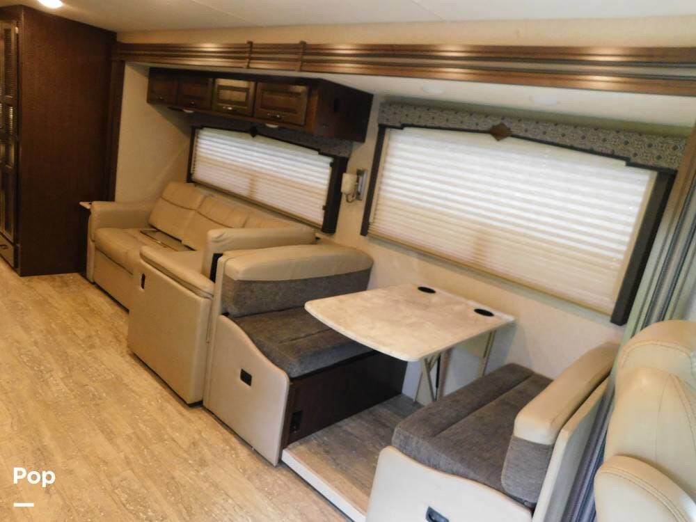 This motorhome measures approximately 36 feet in length, offering a spacious interior with two slide-outs that expand the living area and bedroom, enhancing the overall sense of space.