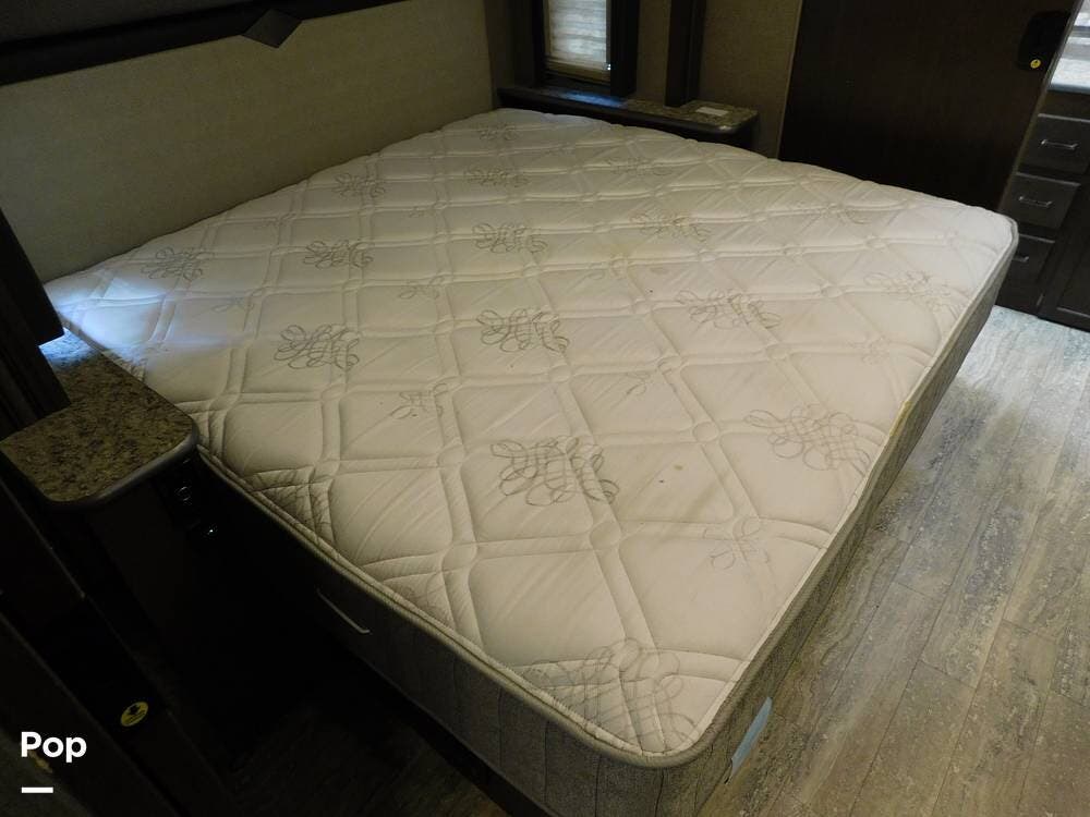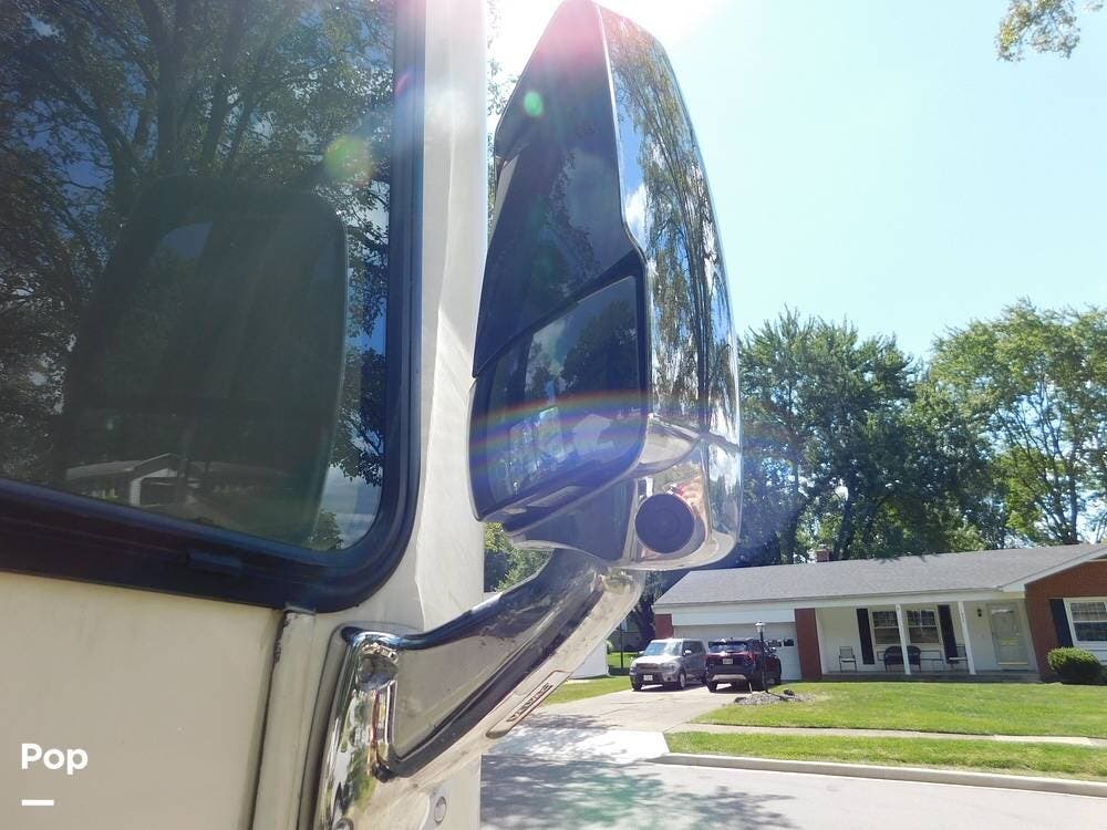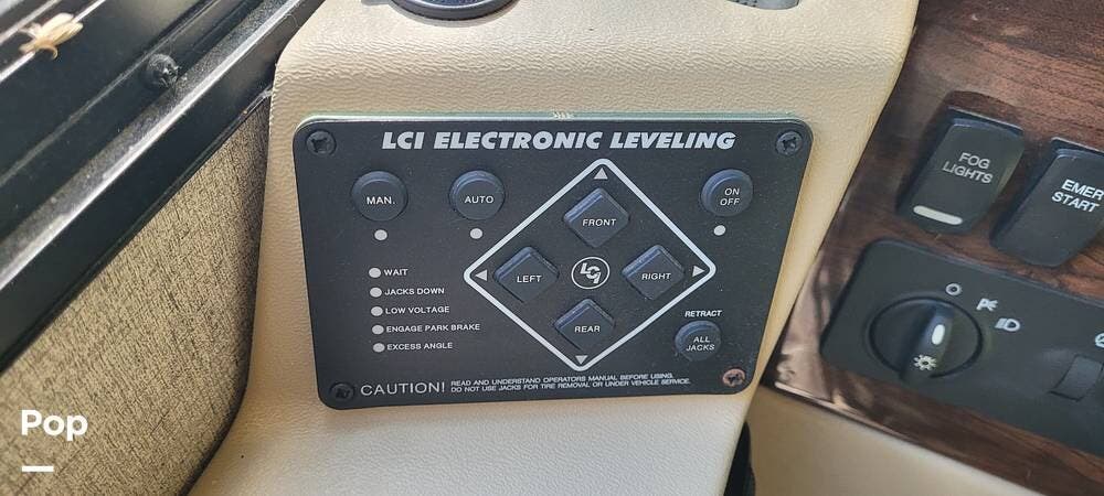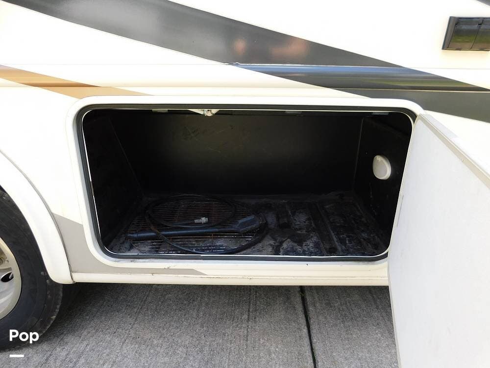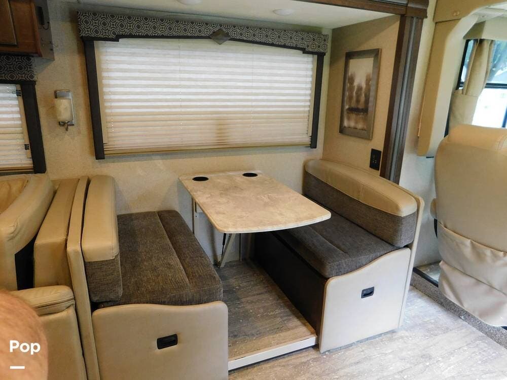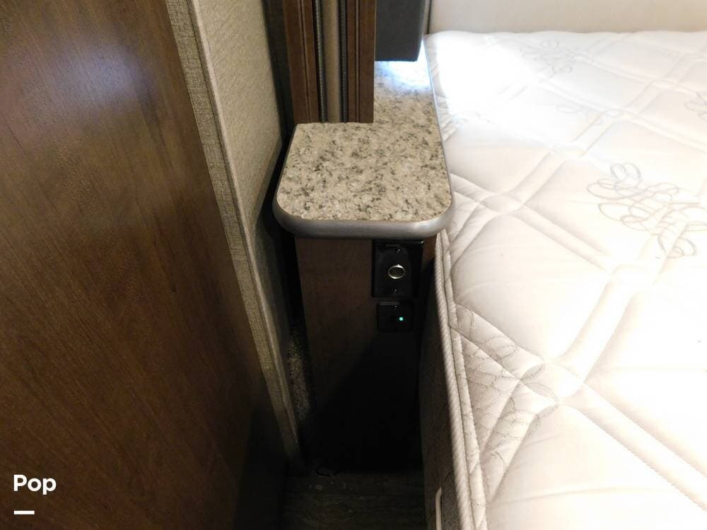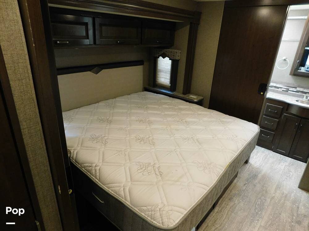 This motorhome measures approximately 36 feet in length, offering a spacious interior with two slide-outs that expand the living area and bedroom, enhancing the overall sense of space.